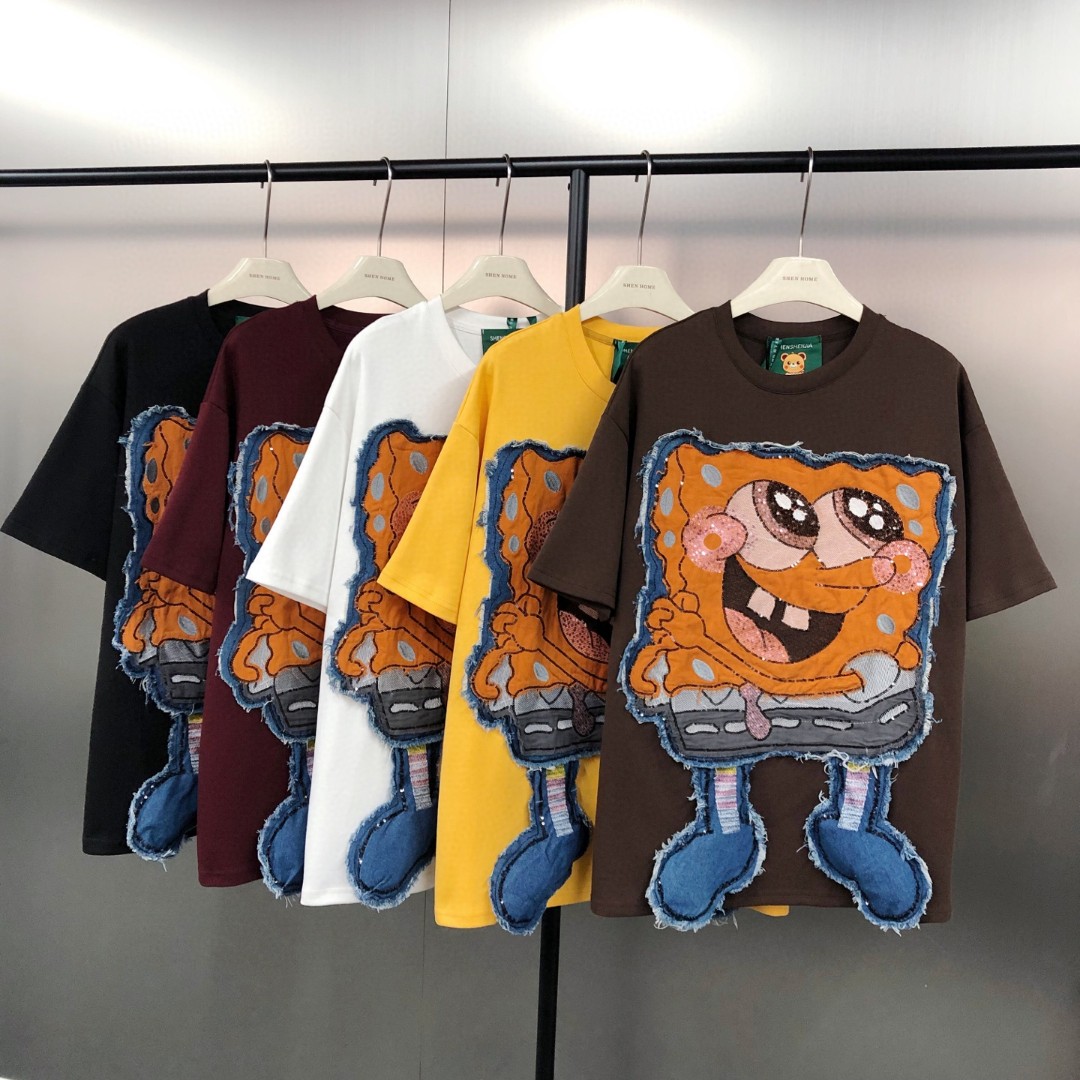 FA53885# 早春!潮酷高街时尚百搭宽松重工珠片海绵宝宝贴布短袖T恤 服裝批發女裝批發服飾貨源