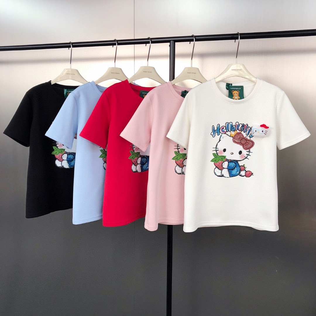 FA53892# 冬上新!韩版减龄百搭重工烫钻KT猫印花时尚圆领短袖T恤(配KT猫胸针) 服裝批發女裝批發服飾貨源