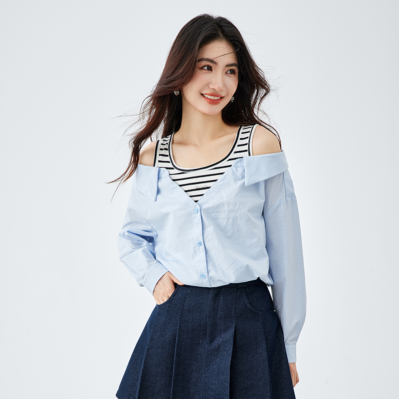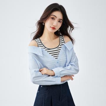FA54335# 露肩假两件衬衫女长袖春季新款叠穿条纹拼接上衣蓝色衬衣 服裝批發女裝批發服飾貨源