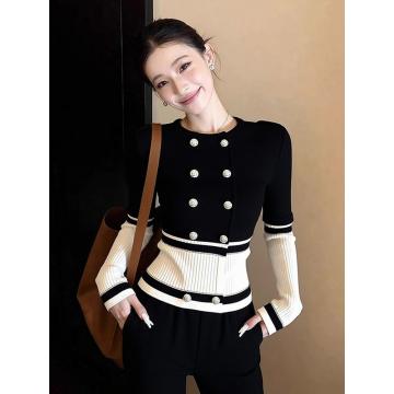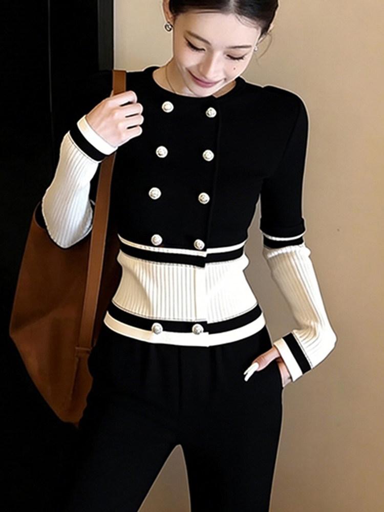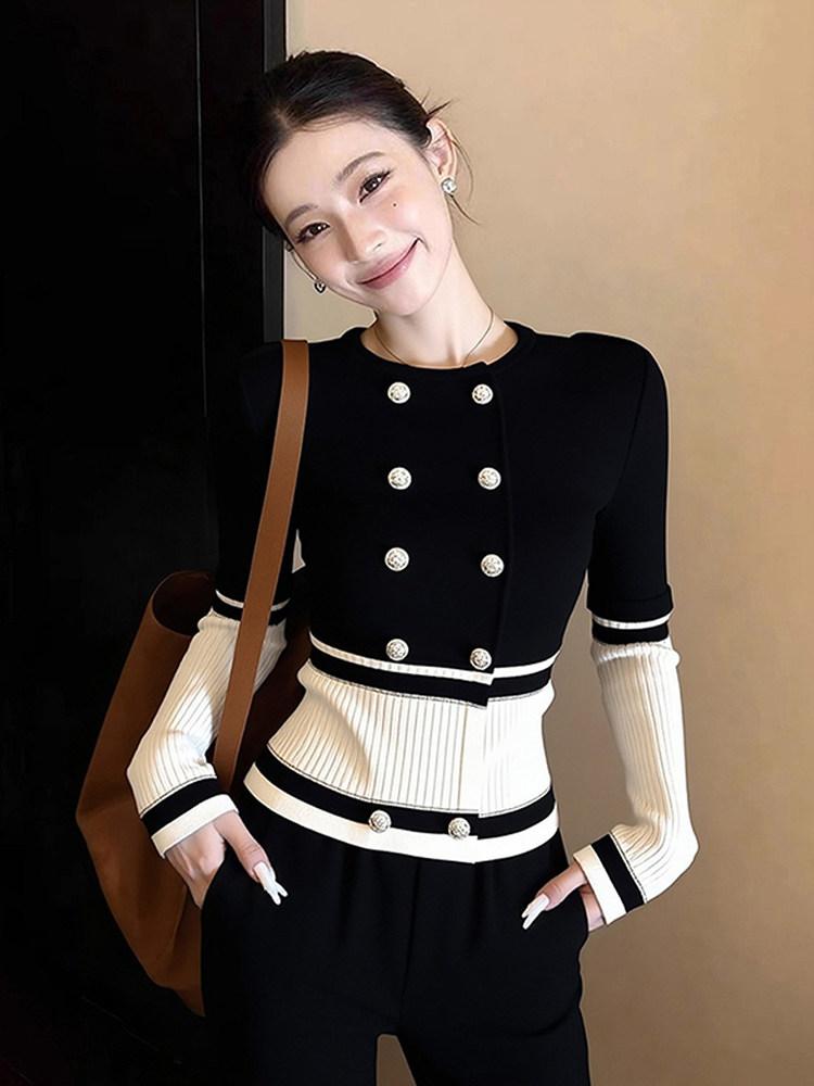 FA54395# 独特漂亮假两件黑色小衫打底毛衣女装秋冬双排扣针织衫洋气上衣服 服裝批發女裝批發服飾貨源