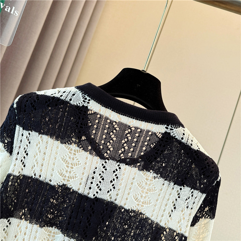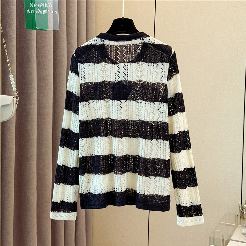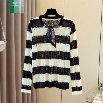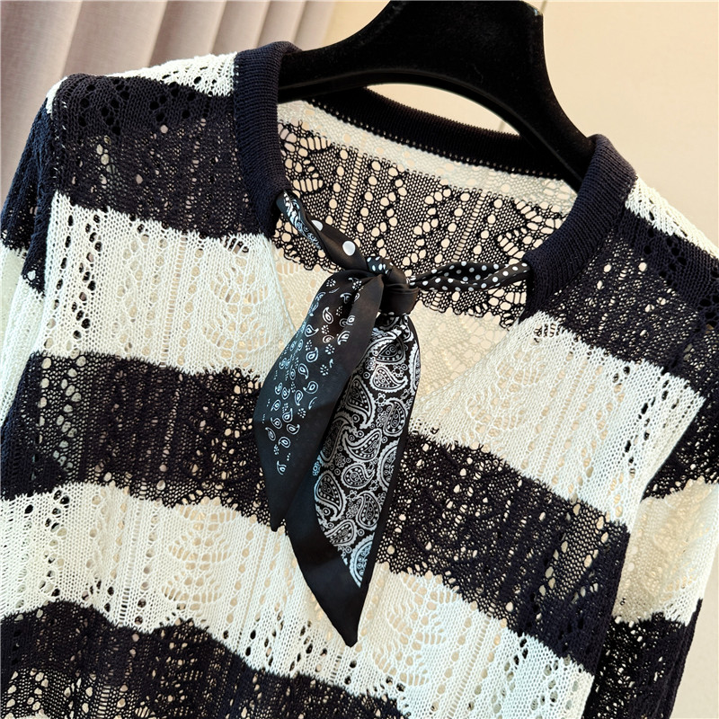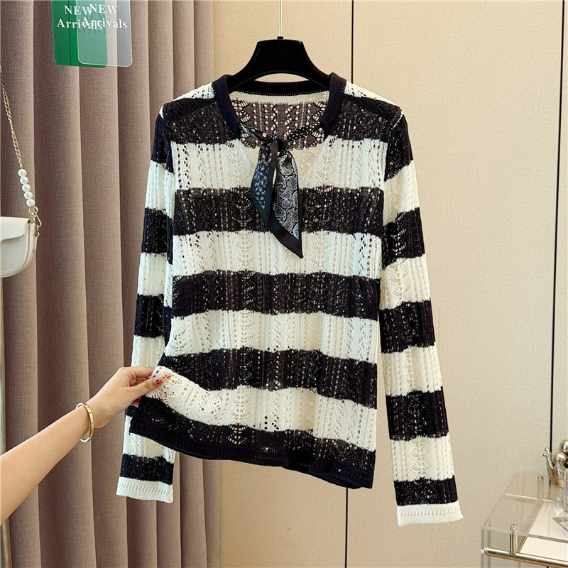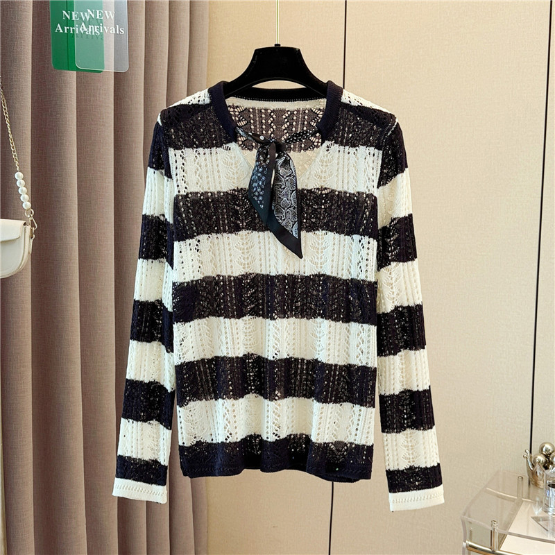 FA54654# 大码女装早秋新款设计感丝巾领长袖针织衫条纹镂空罩衫上衣 服裝批發女裝批發服飾貨源