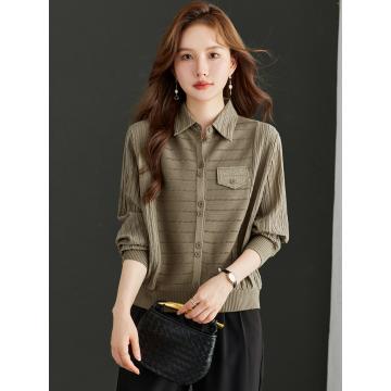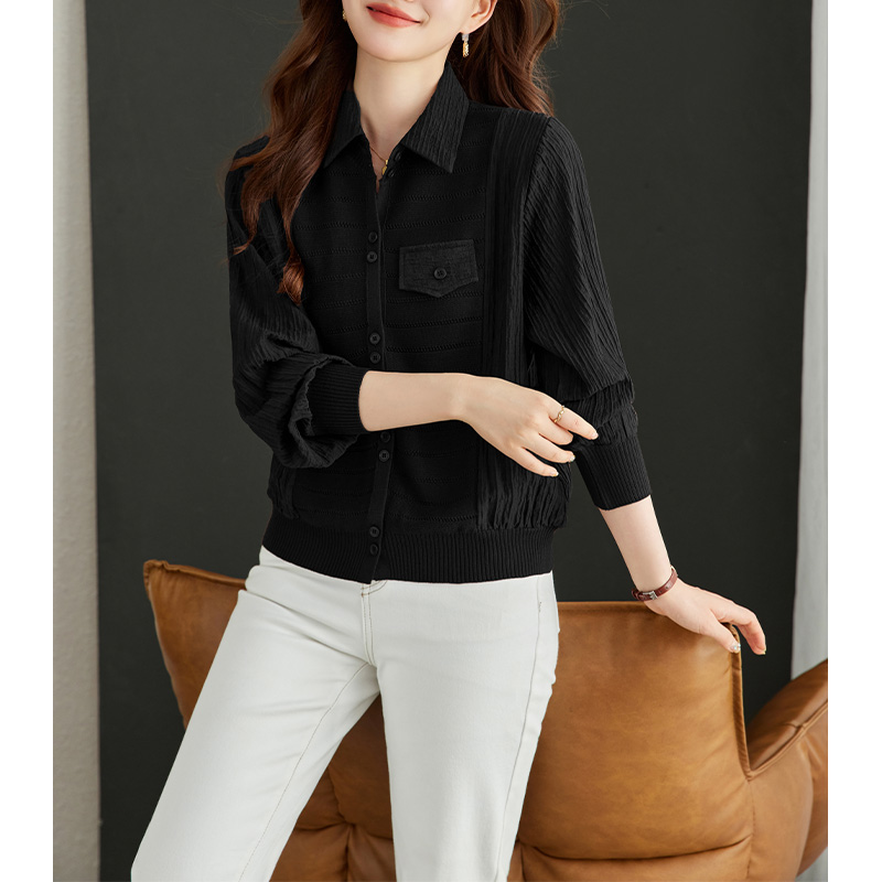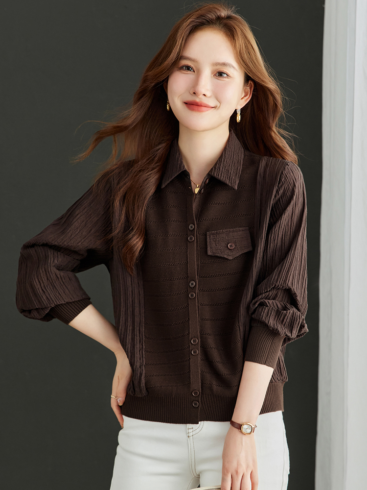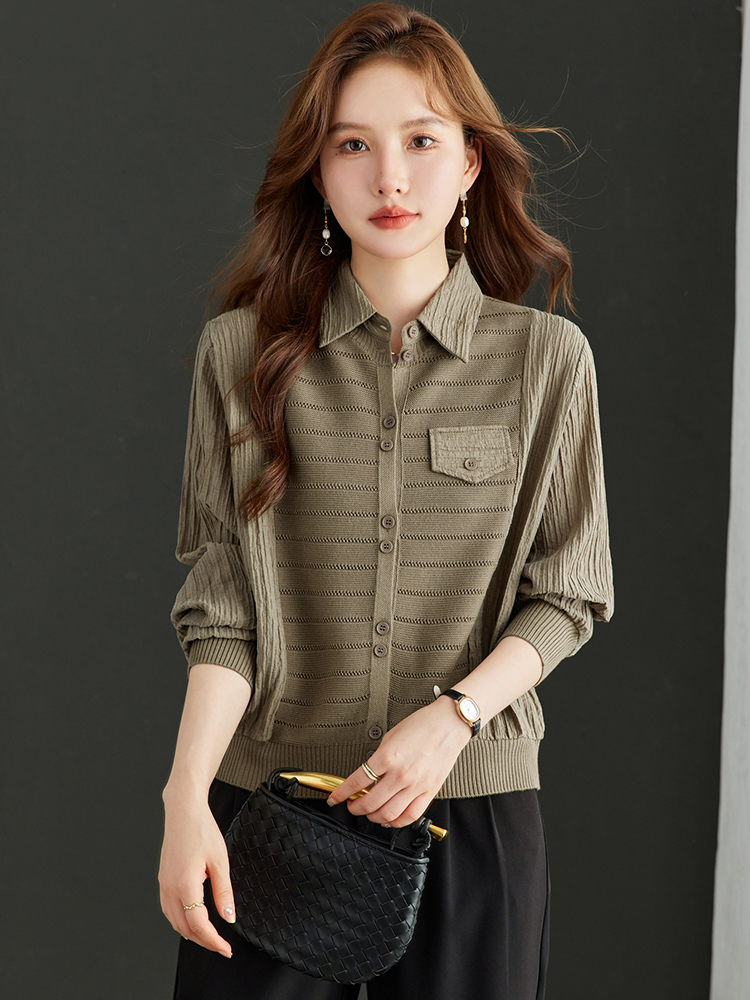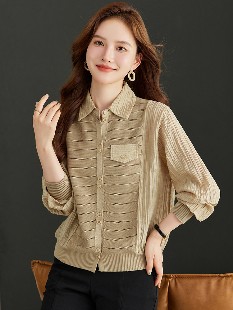 FA54737# 拼接假两件衬衣女秋季新款翻领排扣褶皱设计显瘦羊毛针织内搭上衣 服裝批發女裝批發服飾貨源