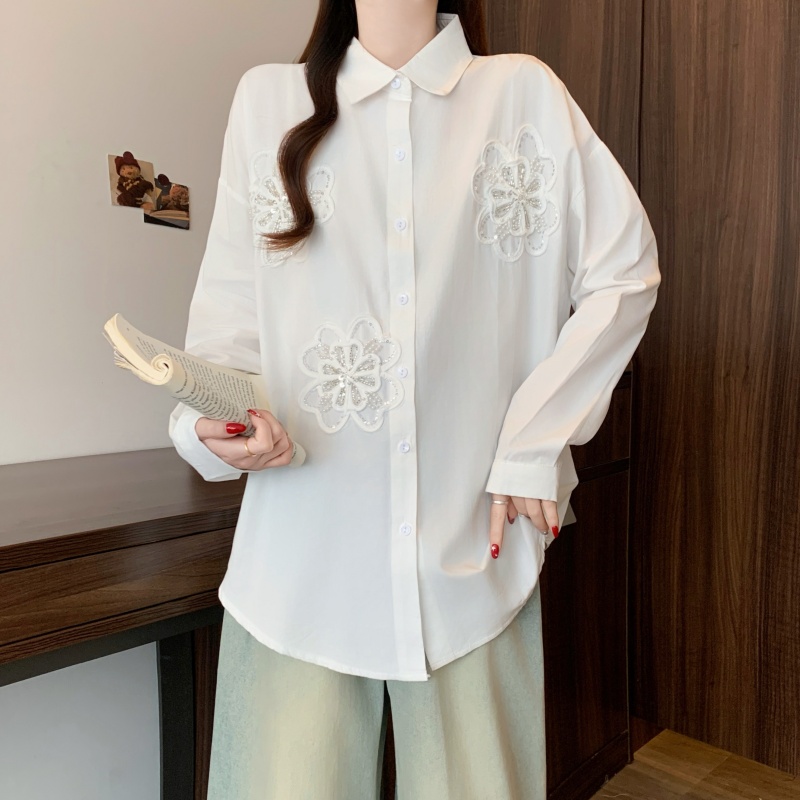 FA54829# 大码女装立体花朵重工钉珠白色衬衫外套春季新款显瘦上衣 服裝批發女裝批發服飾貨源