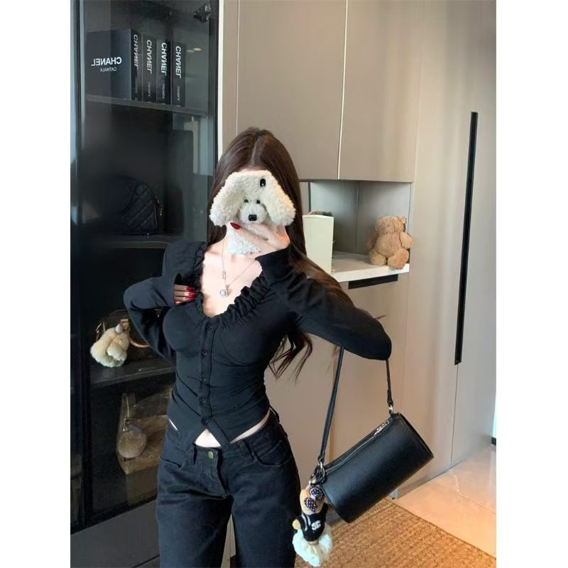 FA55460# 辣妹风白色木耳边长袖T恤女装春季小众收腰显瘦开衫上衣 服裝批發女裝批發服飾貨源