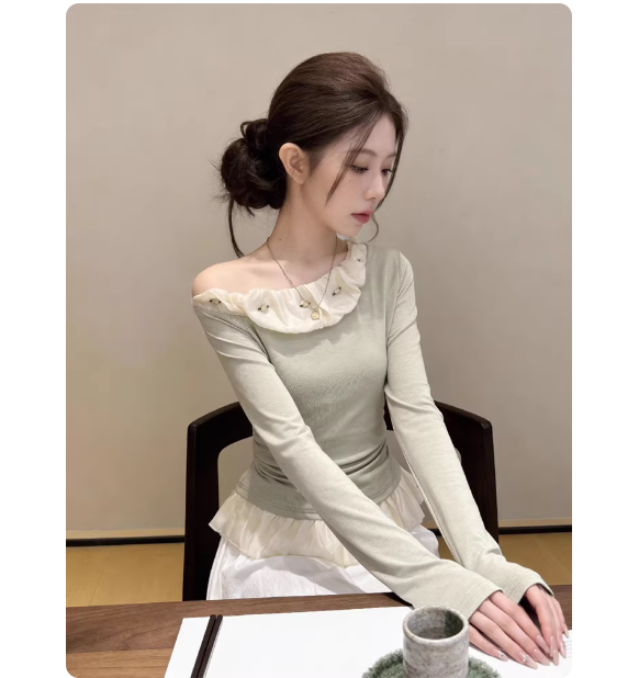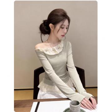 FA55495# 韩系斜领露肩长袖t恤女早春新款气质甜美立体花朵小衫超好看上衣 服裝批發女裝批發服飾貨源