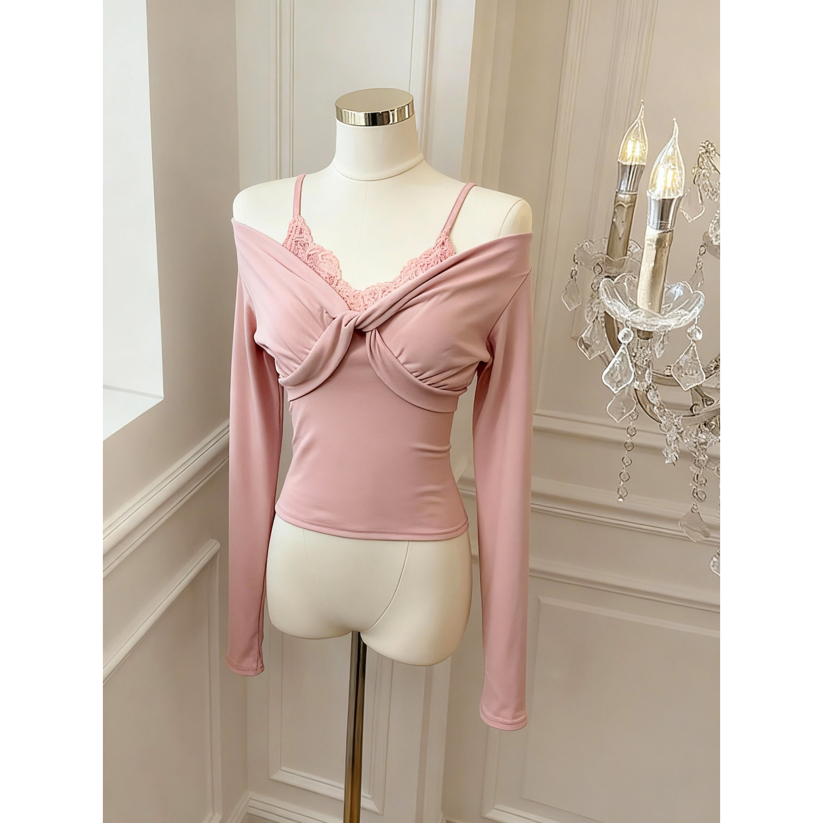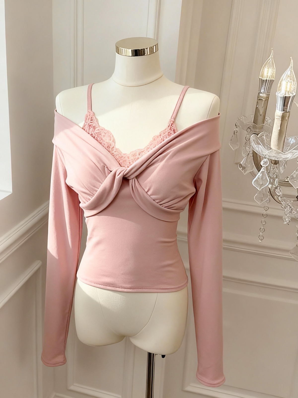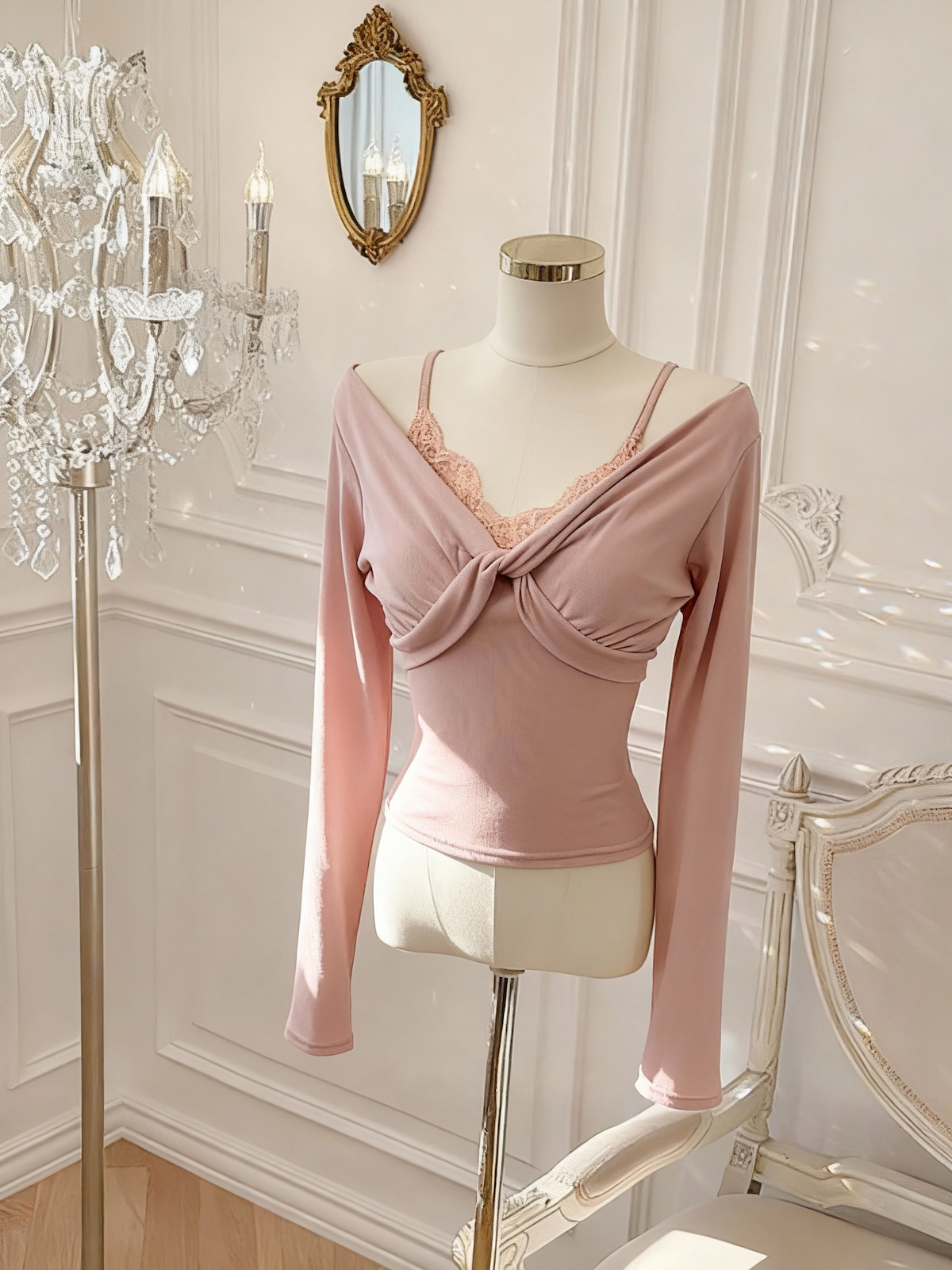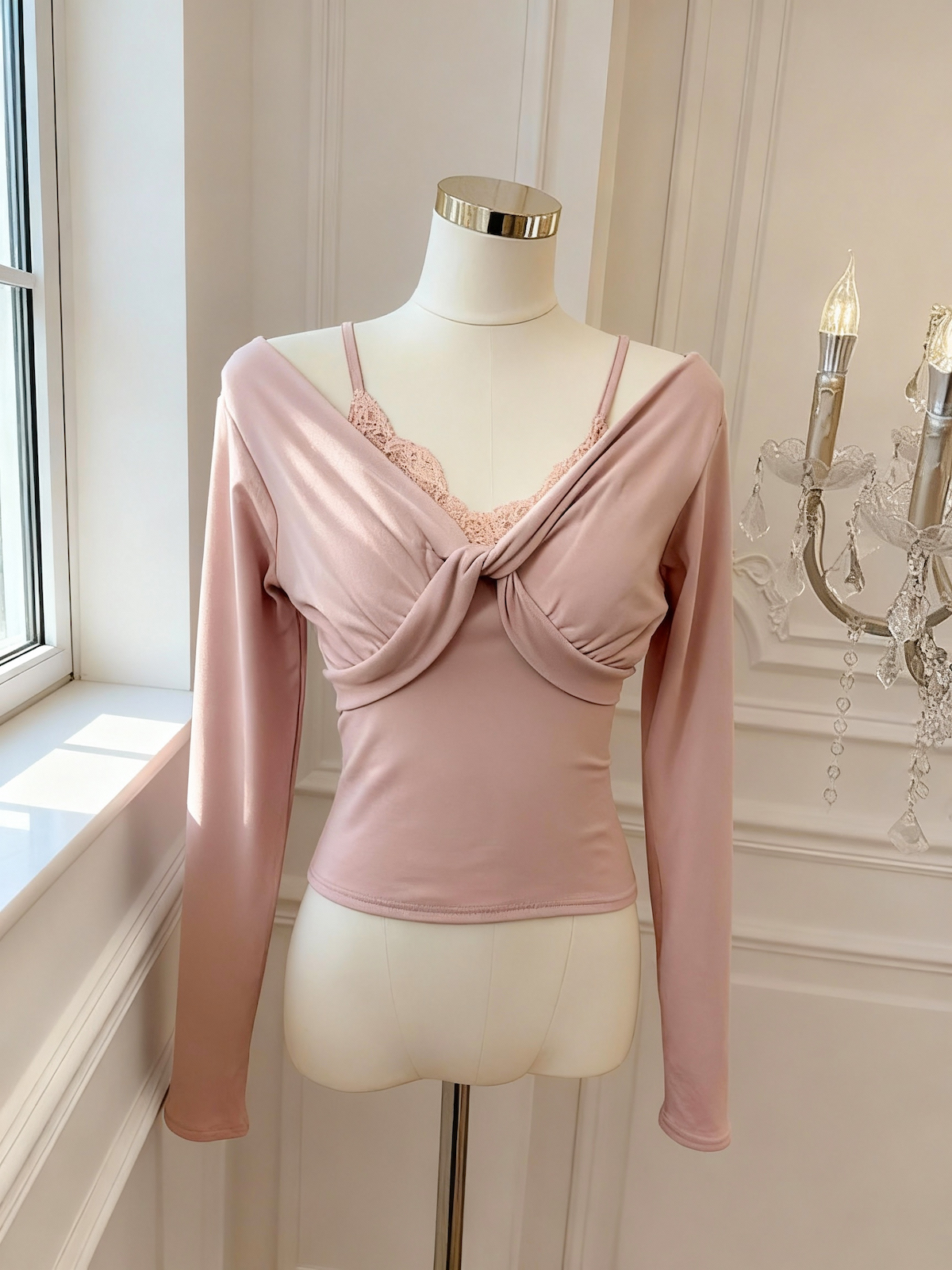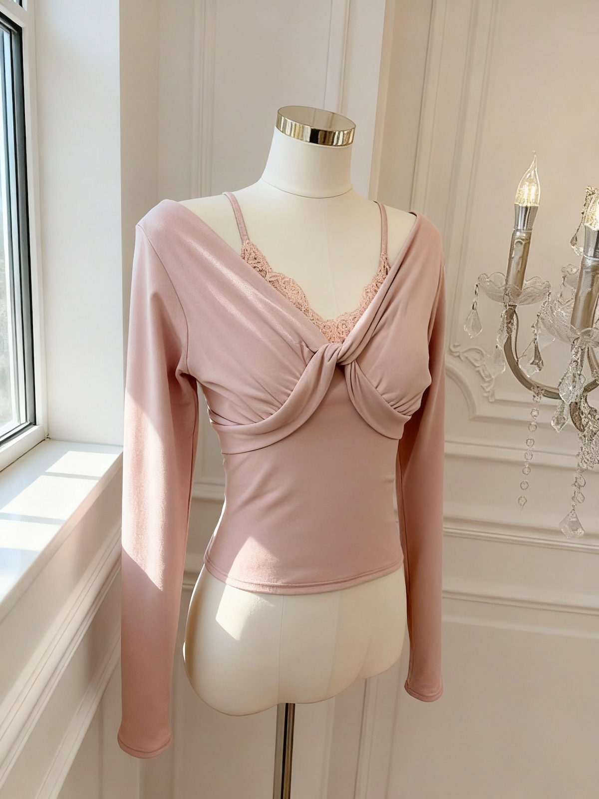 FA55533# 娇柔软玉蕾丝拼接假两件上衣女修身显瘦扭结针织衫 服裝批發女裝批發服飾貨源