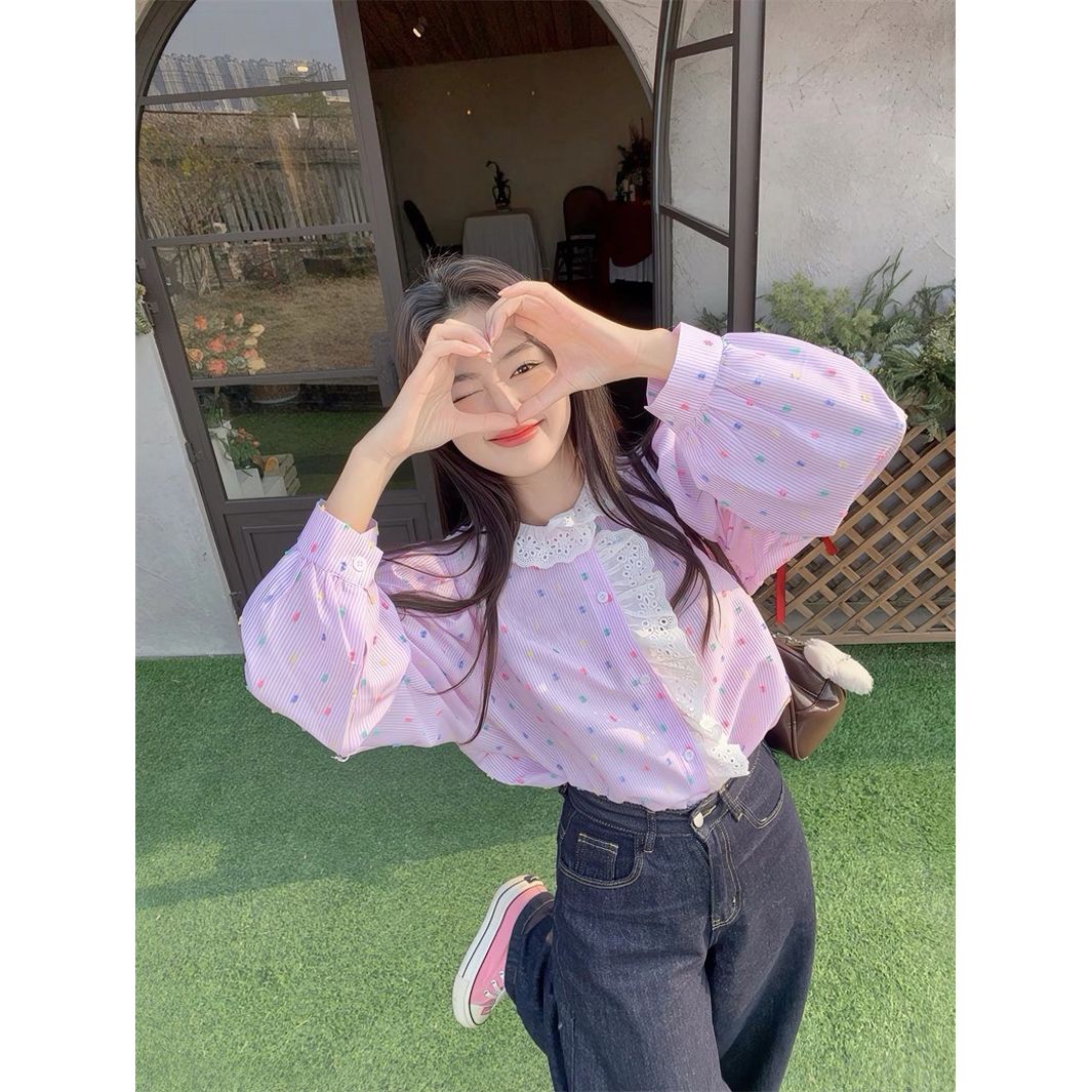 FA55667# 甜美重工拼接木耳边波点条纹长袖衬衫女春秋韩系设计感宽松上衣 服裝批發女裝批發服飾貨源