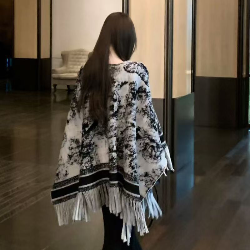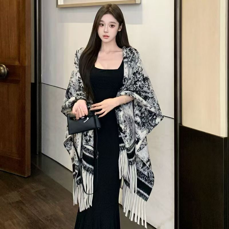YF6945# 图片色时尚泼墨碎花流苏设计围巾 空调房保暖双面提花斗蓬披肩