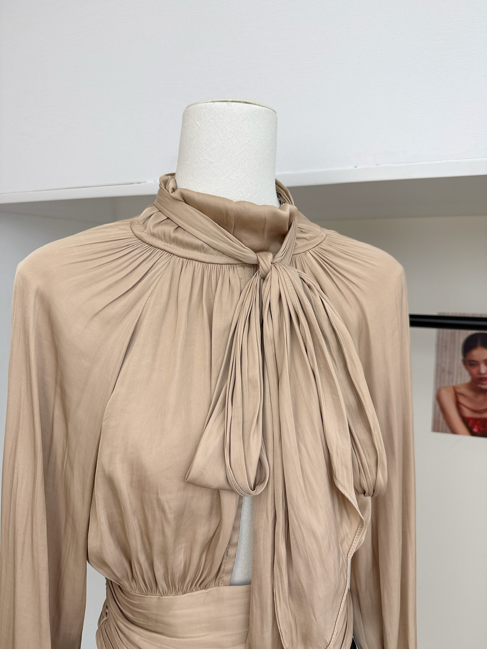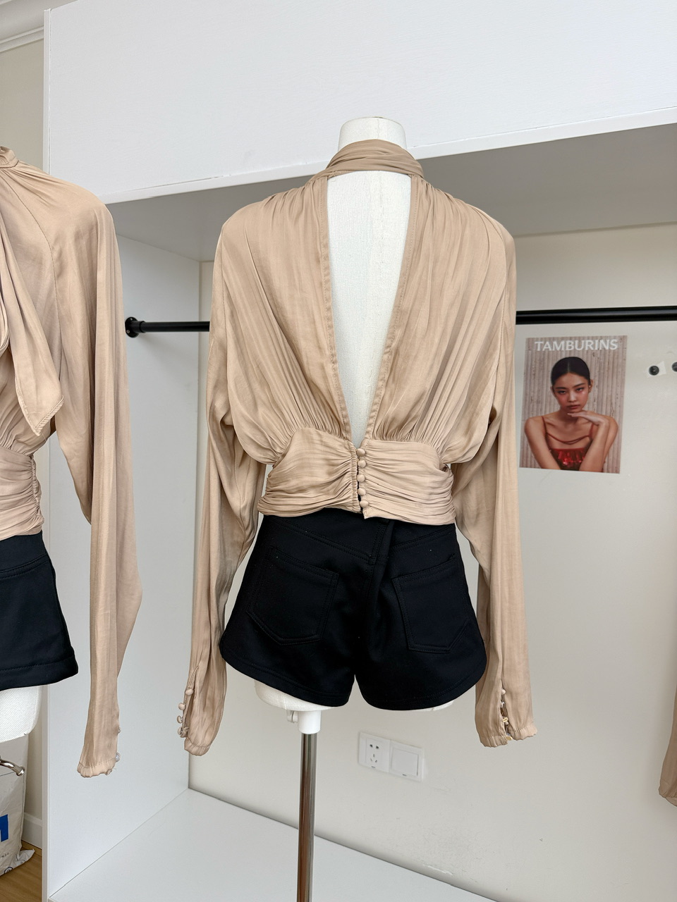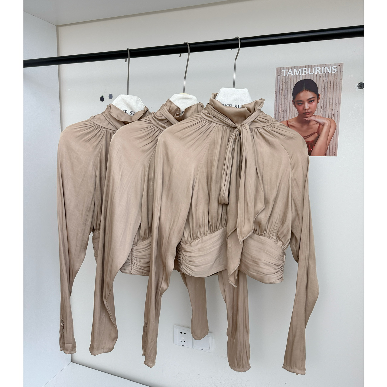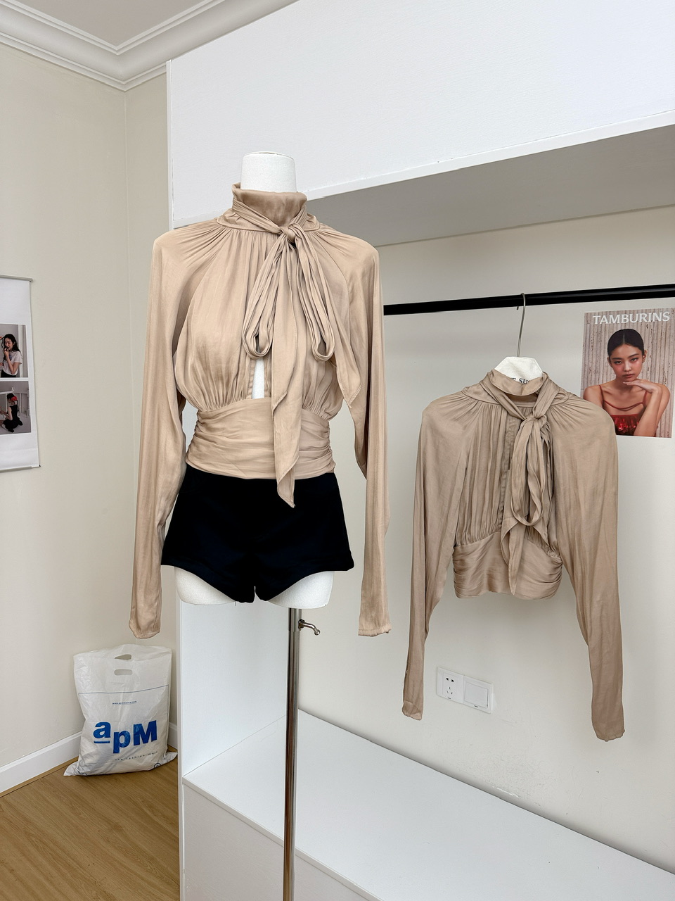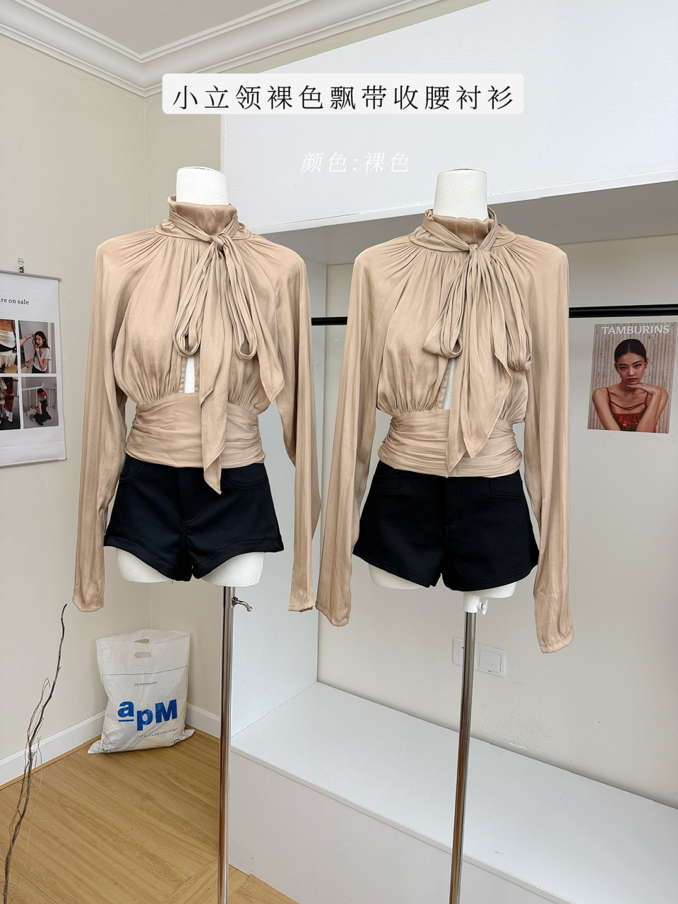 BY10137# 波尔多情裸色飘带衬衫女短款收腰修身秋季长袖小立领上衣 服裝批發女裝批發服飾貨源