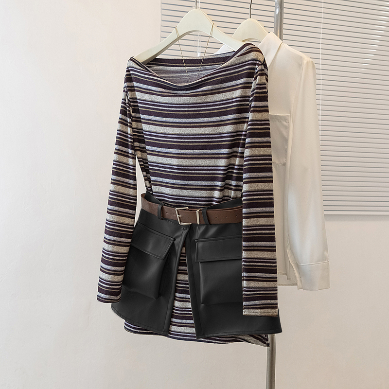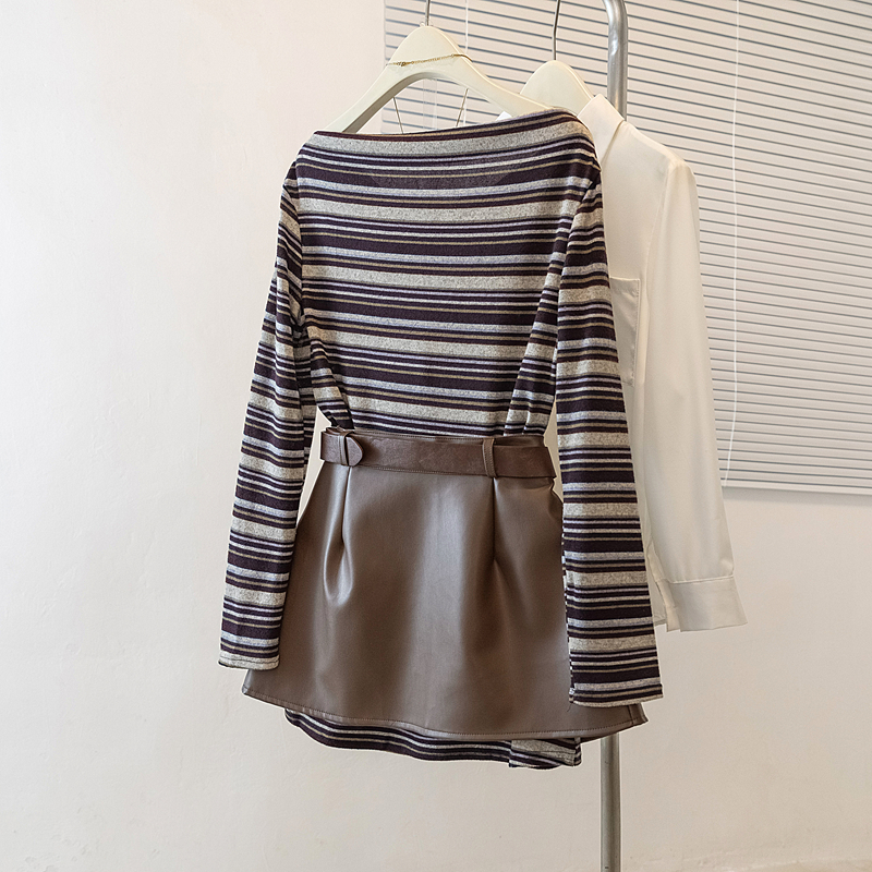 条纹针织衫搭配半身裙宽松休闲皮裙两件套大码套装 服裝批發女裝批發服飾貨源