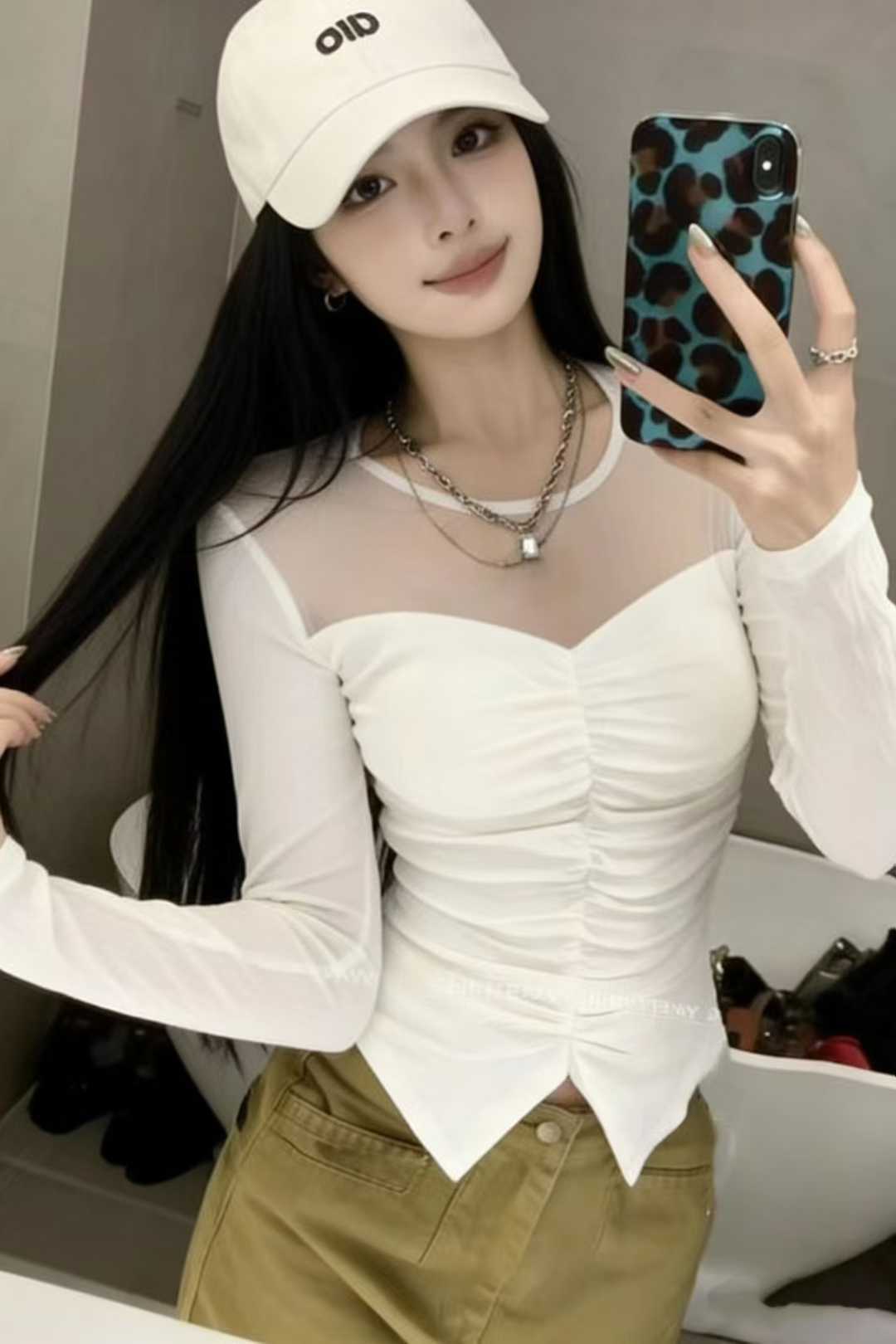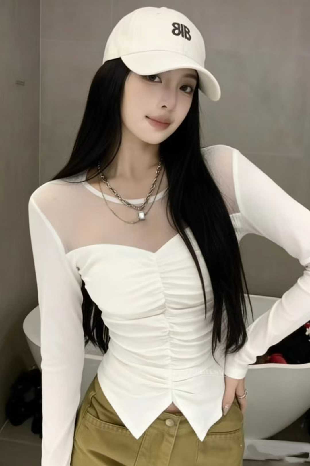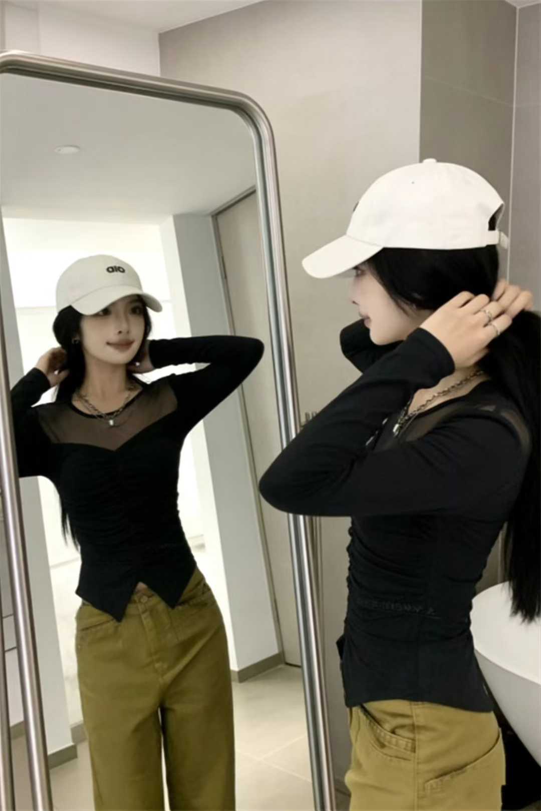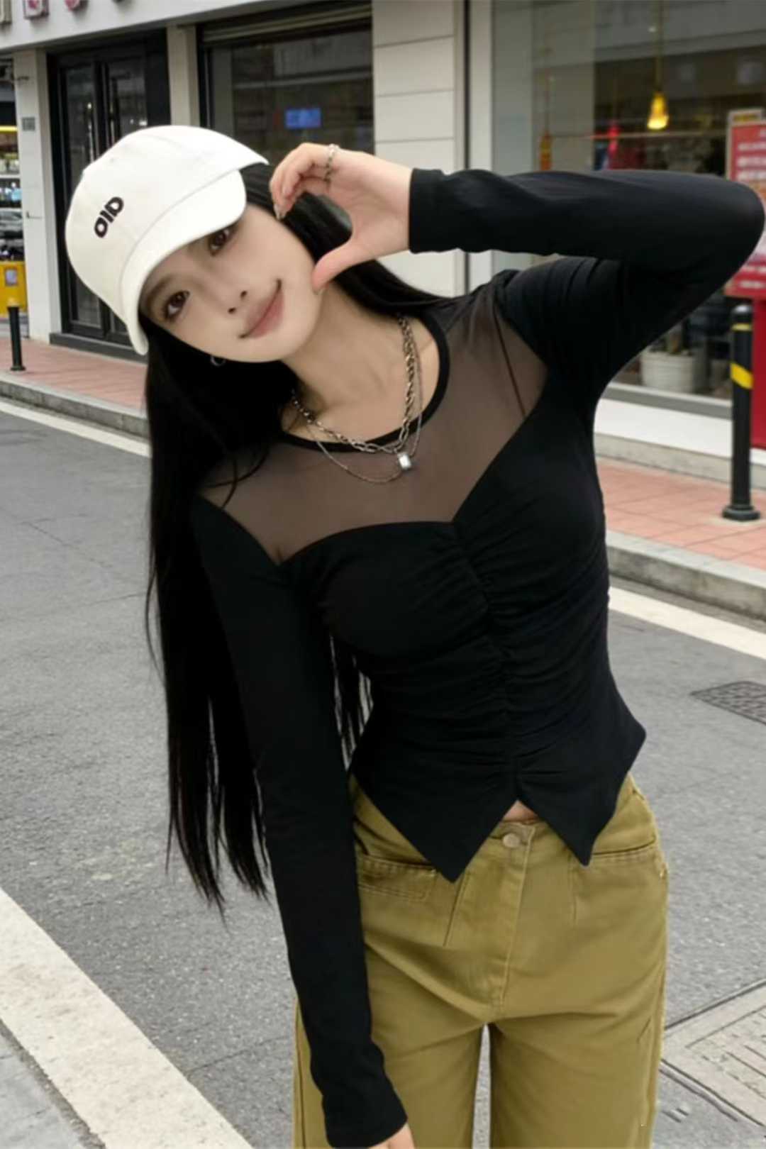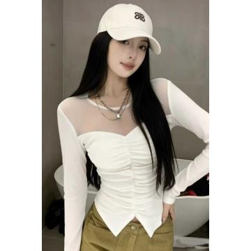 韩版设计感网纱褶皱拼接长袖T恤春季新款气质微透收腰显身材上衣 服裝批發女裝批發服飾貨源