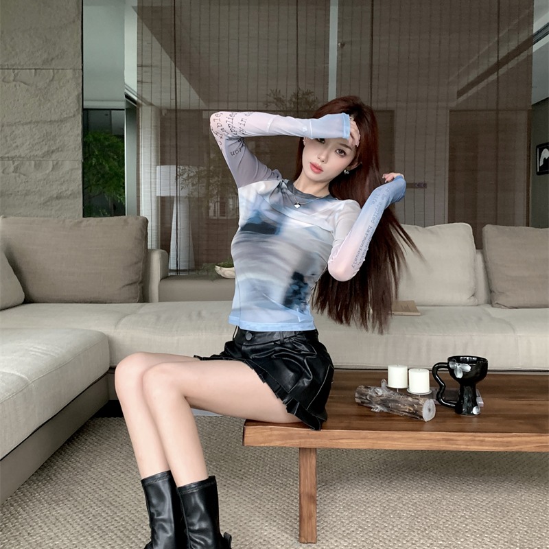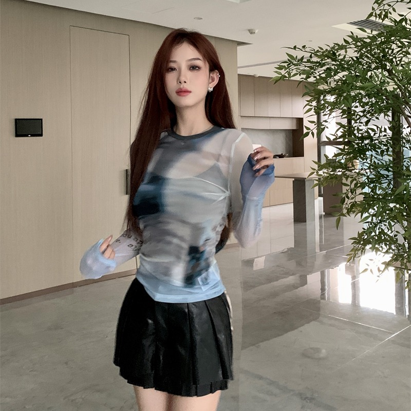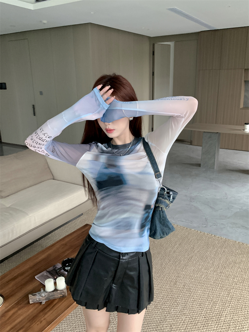 网纱短袖T恤女复古印花个性弹力舒适宽松圆领夏季上衣+吊带 服裝批發女裝批發服飾貨源