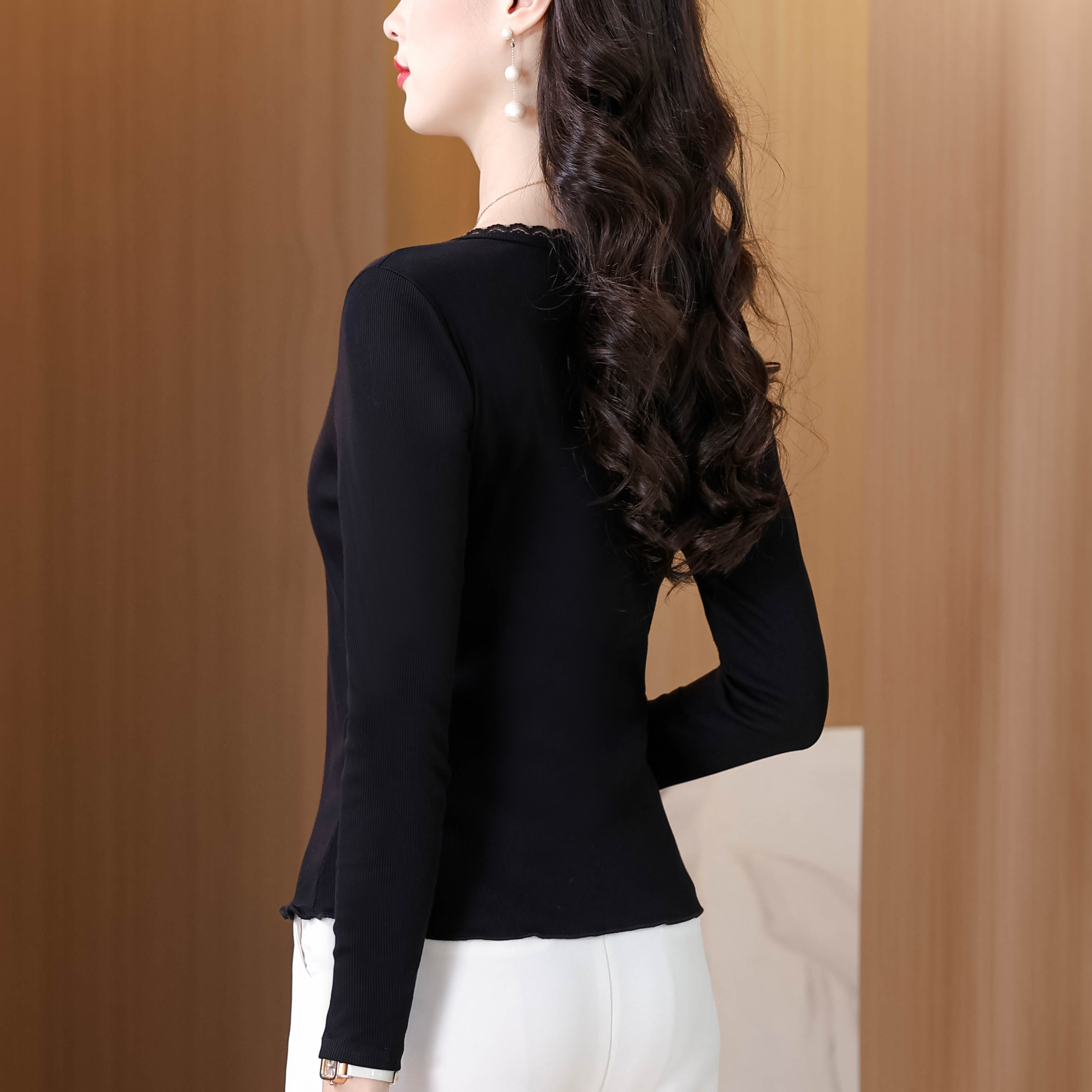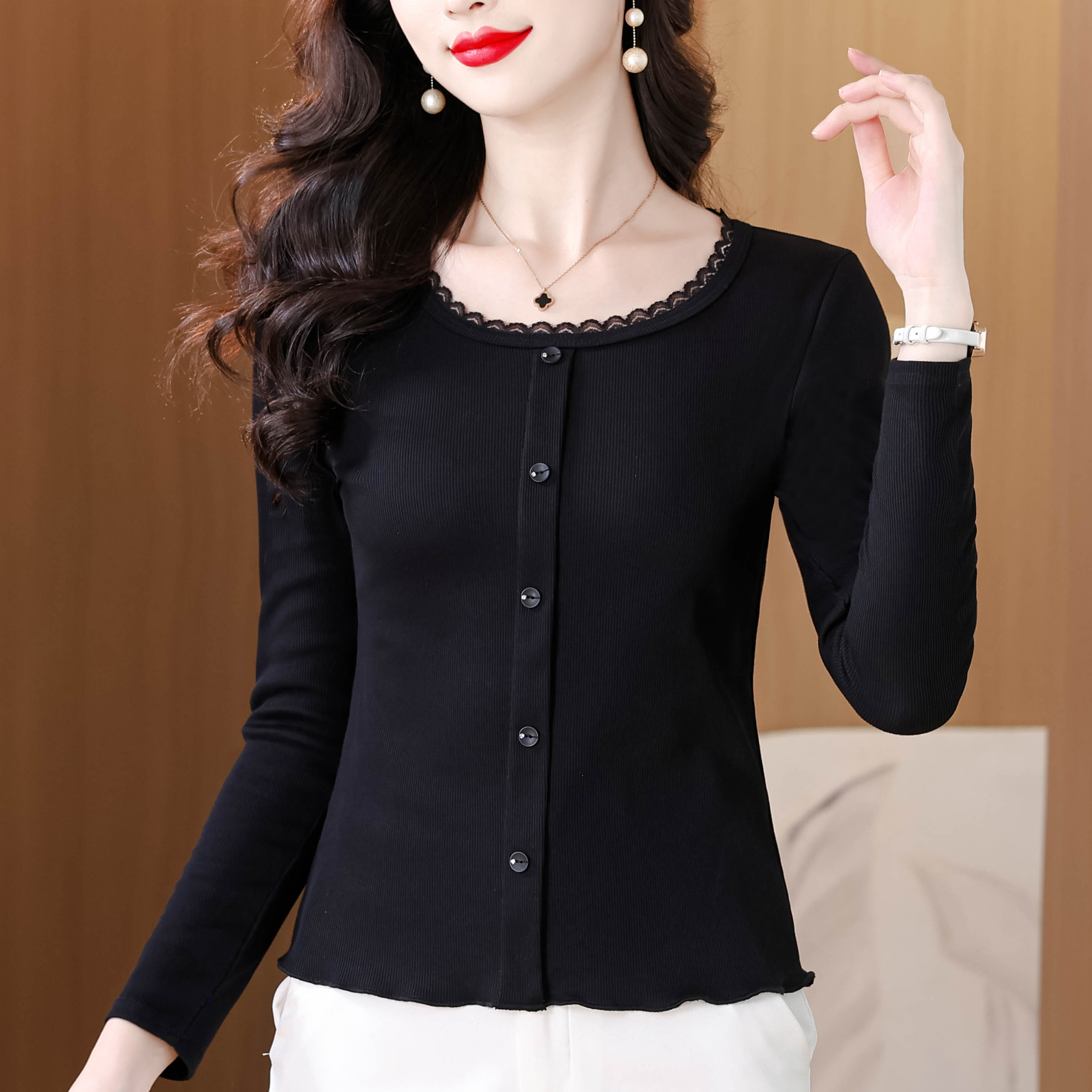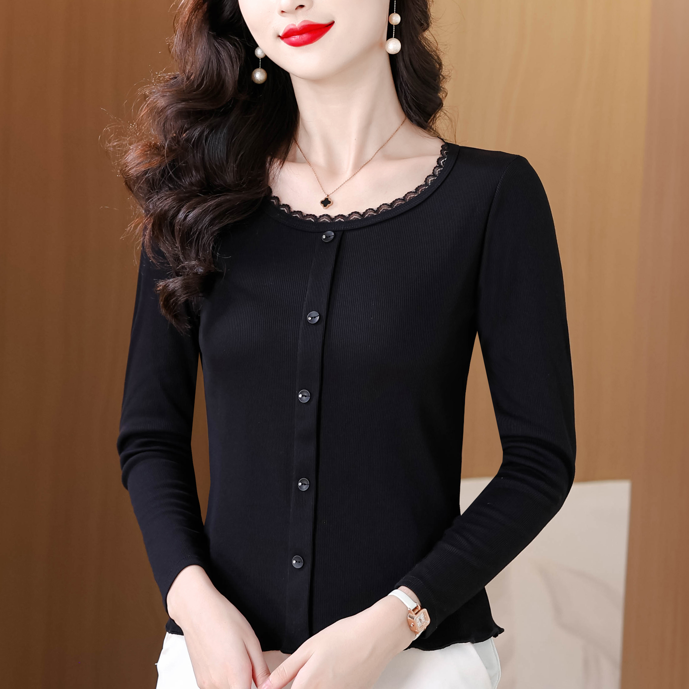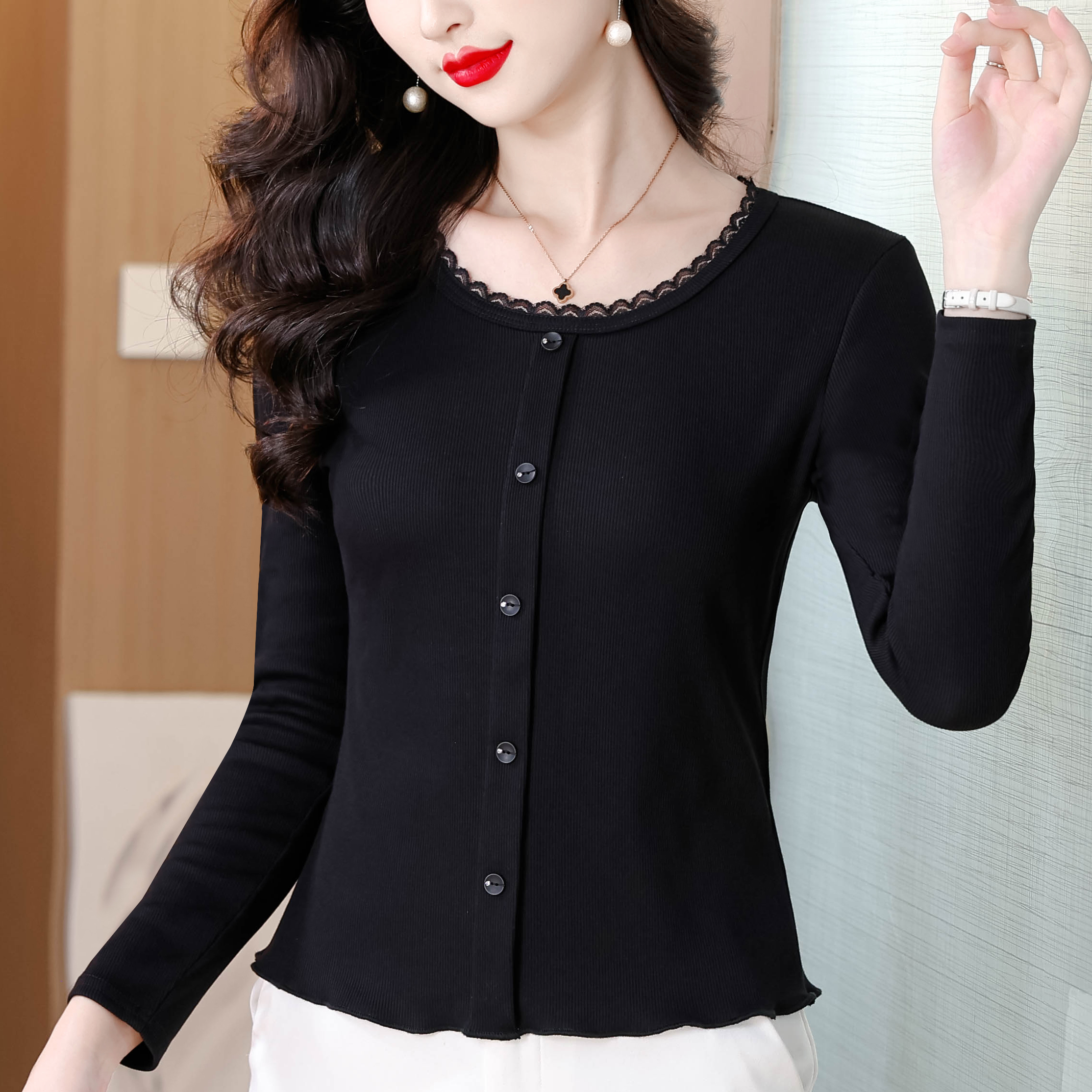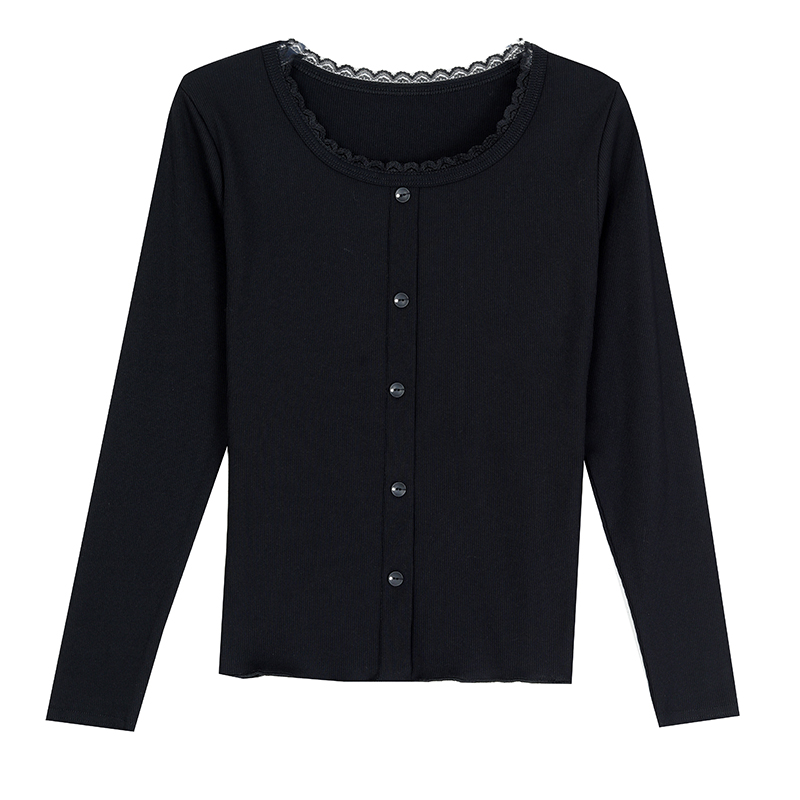BY11135# 秋季新款纯色花边圆领长袖T恤女简约单排扣洋气百搭显瘦上衣 服裝批發女裝批發服飾貨源