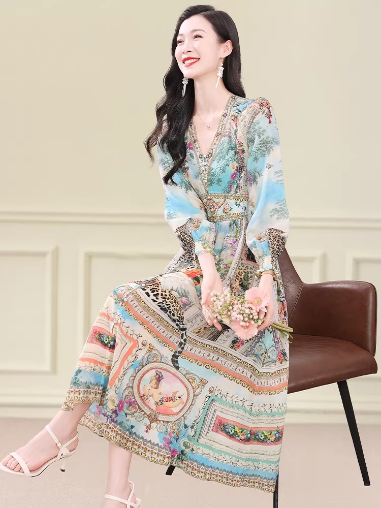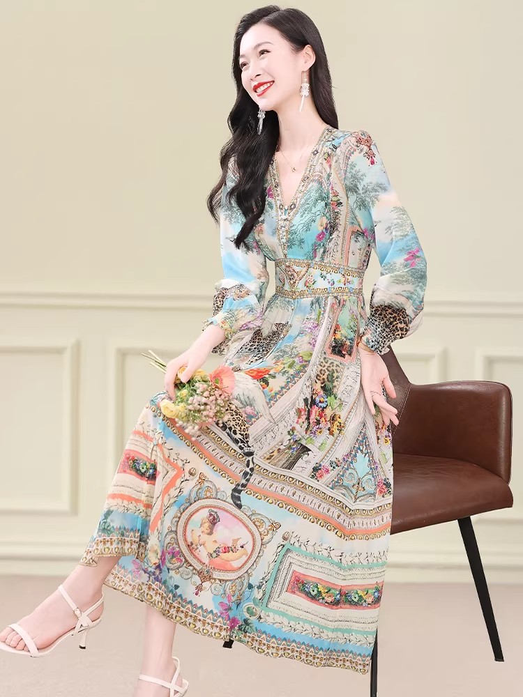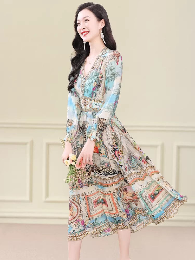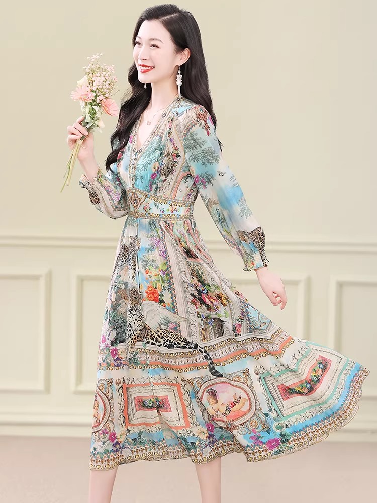 BY11366# 真丝连衣裙春新款度假风法式复古印花裙桑蚕丝收腰气质显瘦裙 服裝批發女裝批發服飾貨源