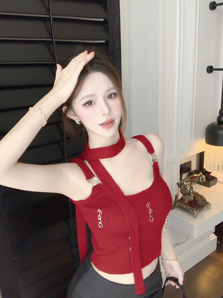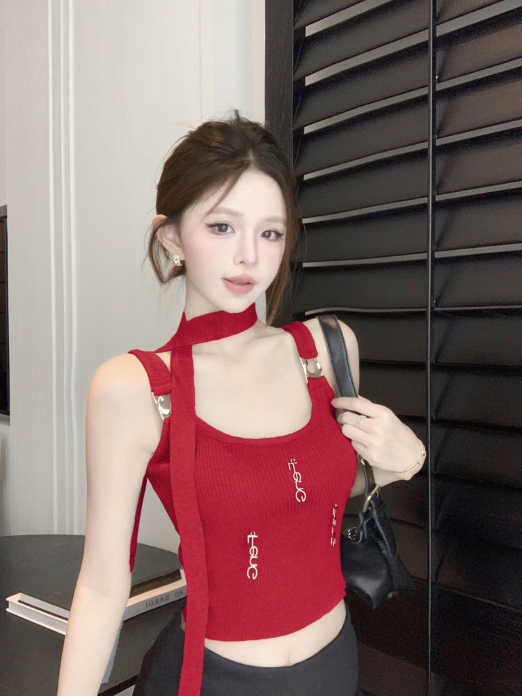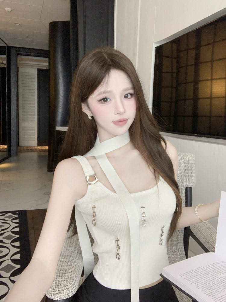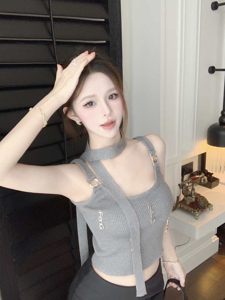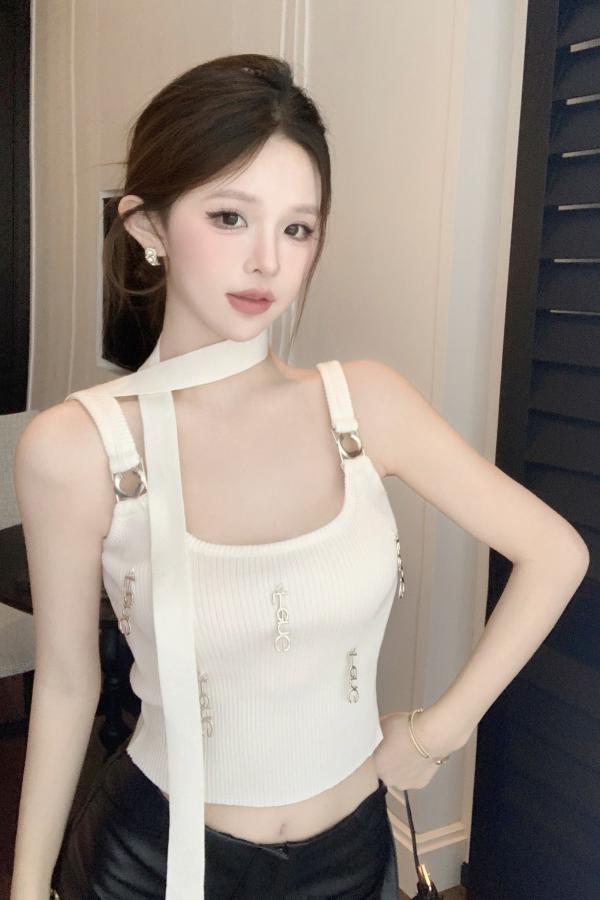 BY11401# 辣妹修身显瘦短款背心金属字母装饰洋气性感吊带加围脖 服裝批發女裝批發服飾貨源