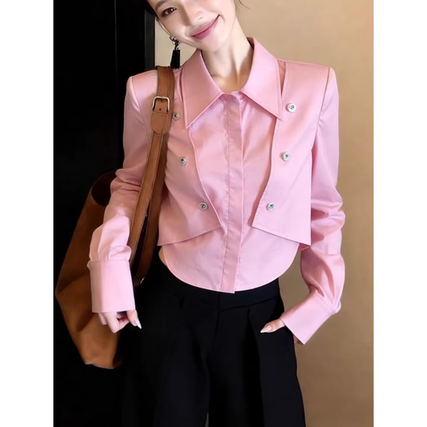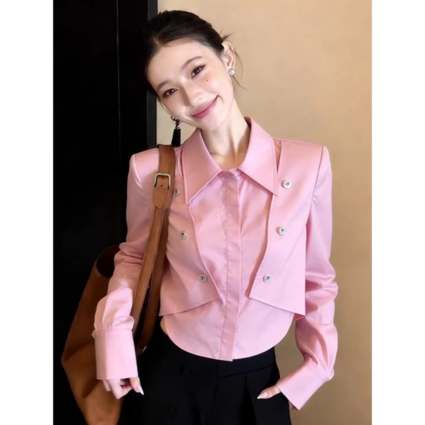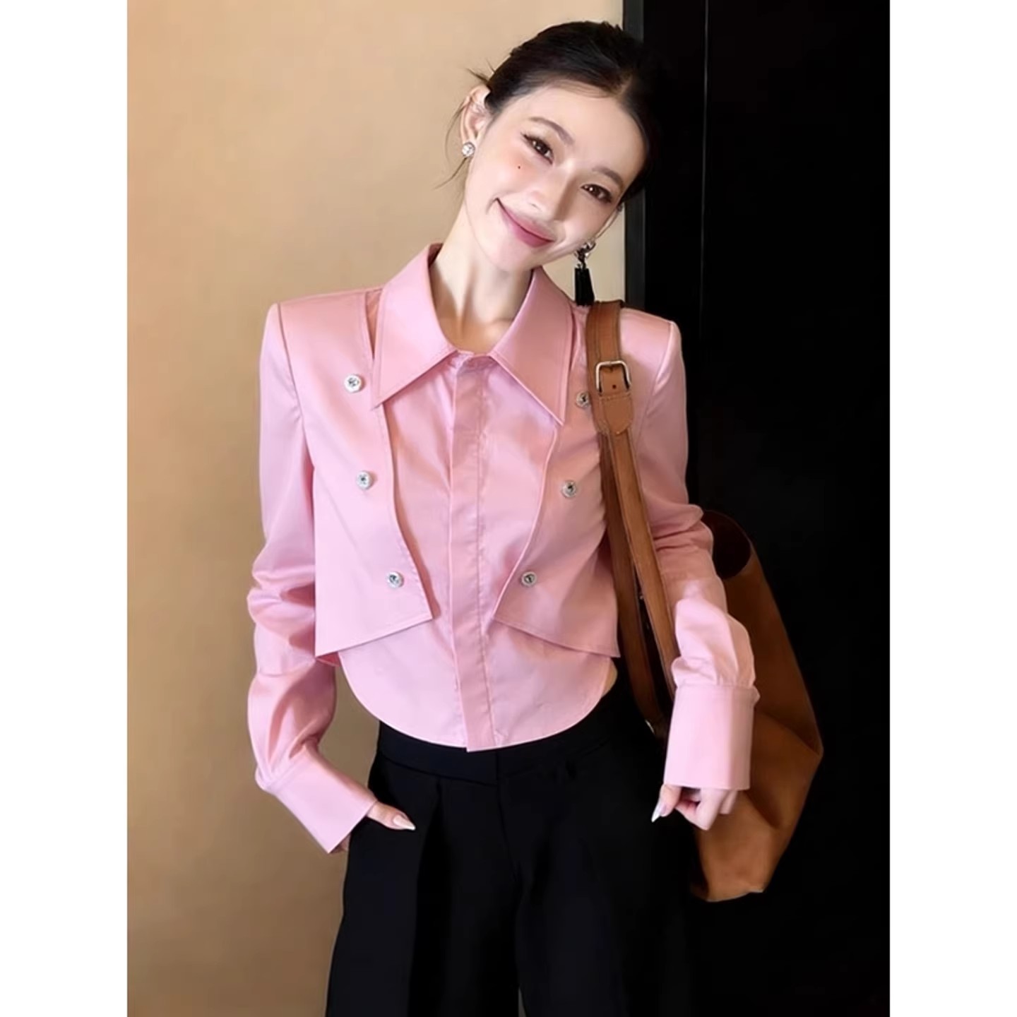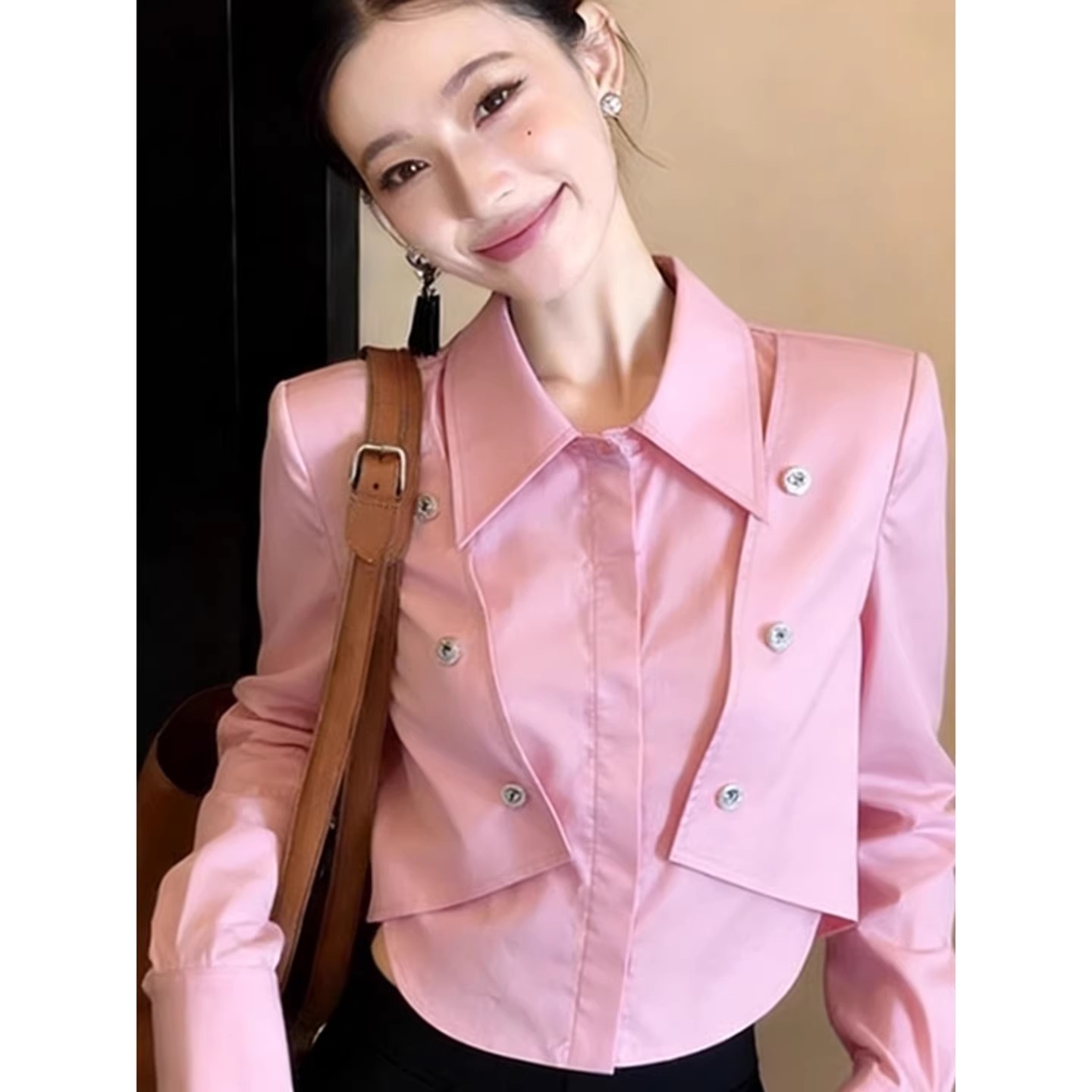 BY11728# 韩系chic洋气减龄高级感超好看上衣别致粉色Polo领长袖衬衫女春季 服裝批發女裝批發服飾貨源