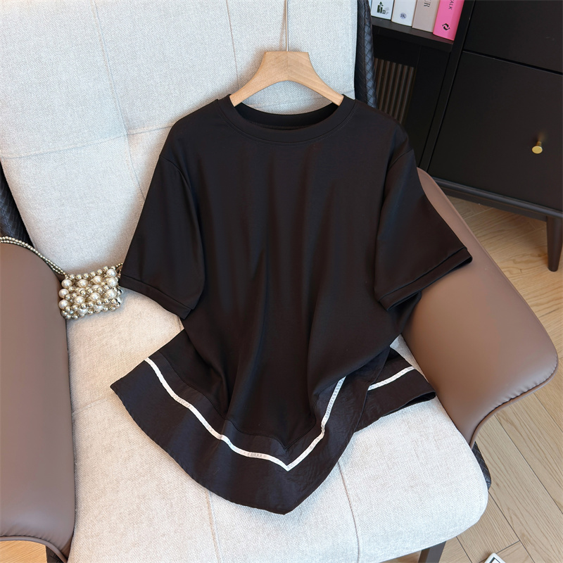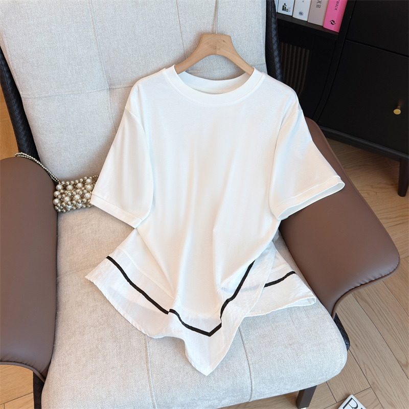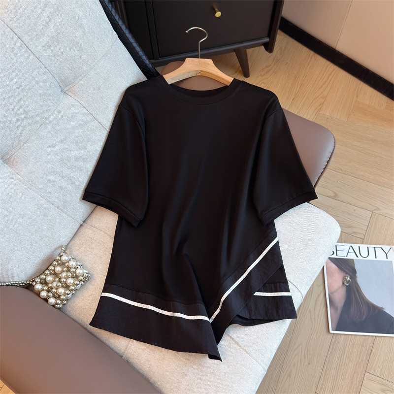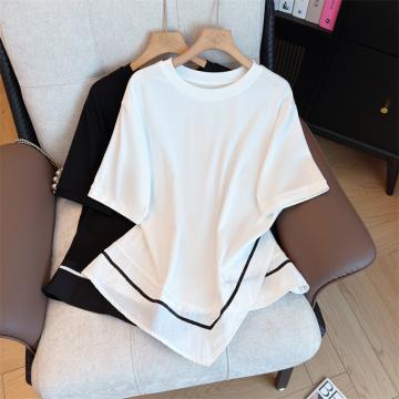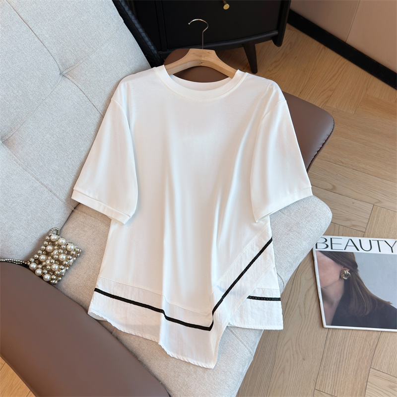 大码夏韩版设计感不规则宽松休闲遮肚子显瘦撞色拼接短袖T恤 服裝批發女裝批發服飾貨源