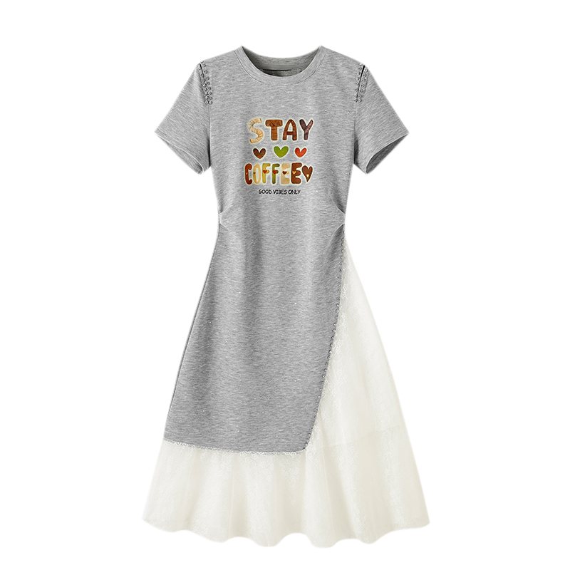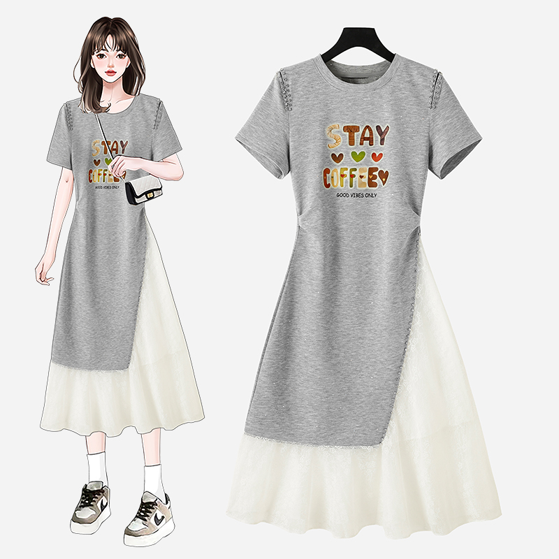 新款拼接网纱印花短袖连衣裙夏季韩版轻奢风收腰长裙 服裝批發女裝批發服飾貨源