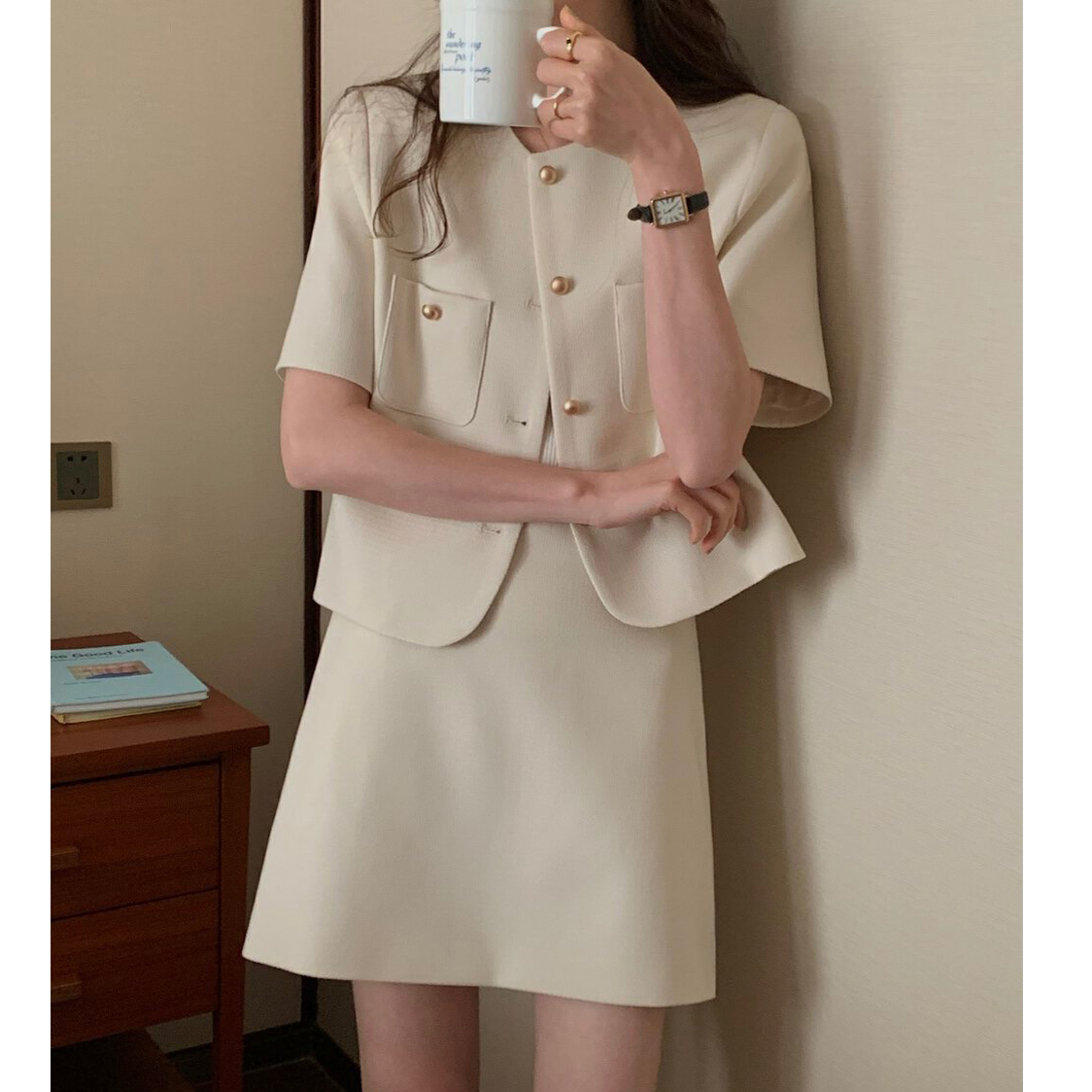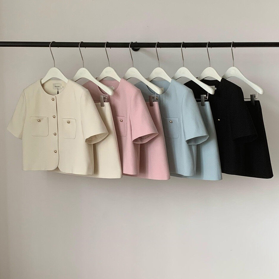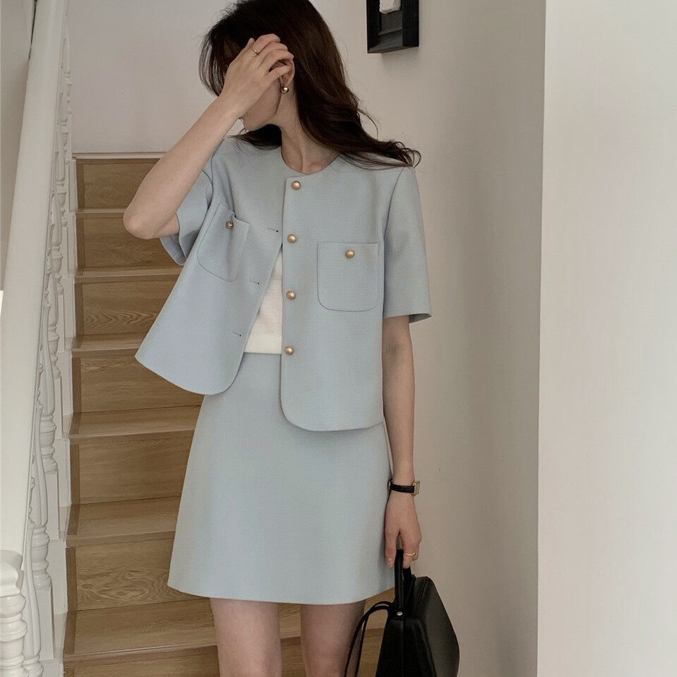 韩版新款小香风短袖西装套装夏时尚小个子圆领西服短裙两件套 服裝批發女裝批發服飾貨源