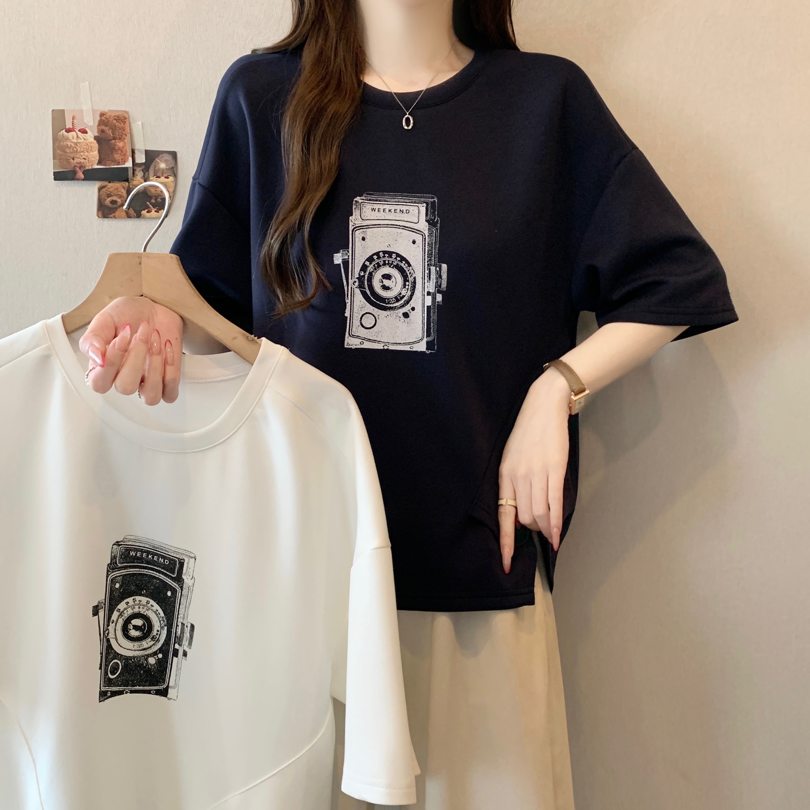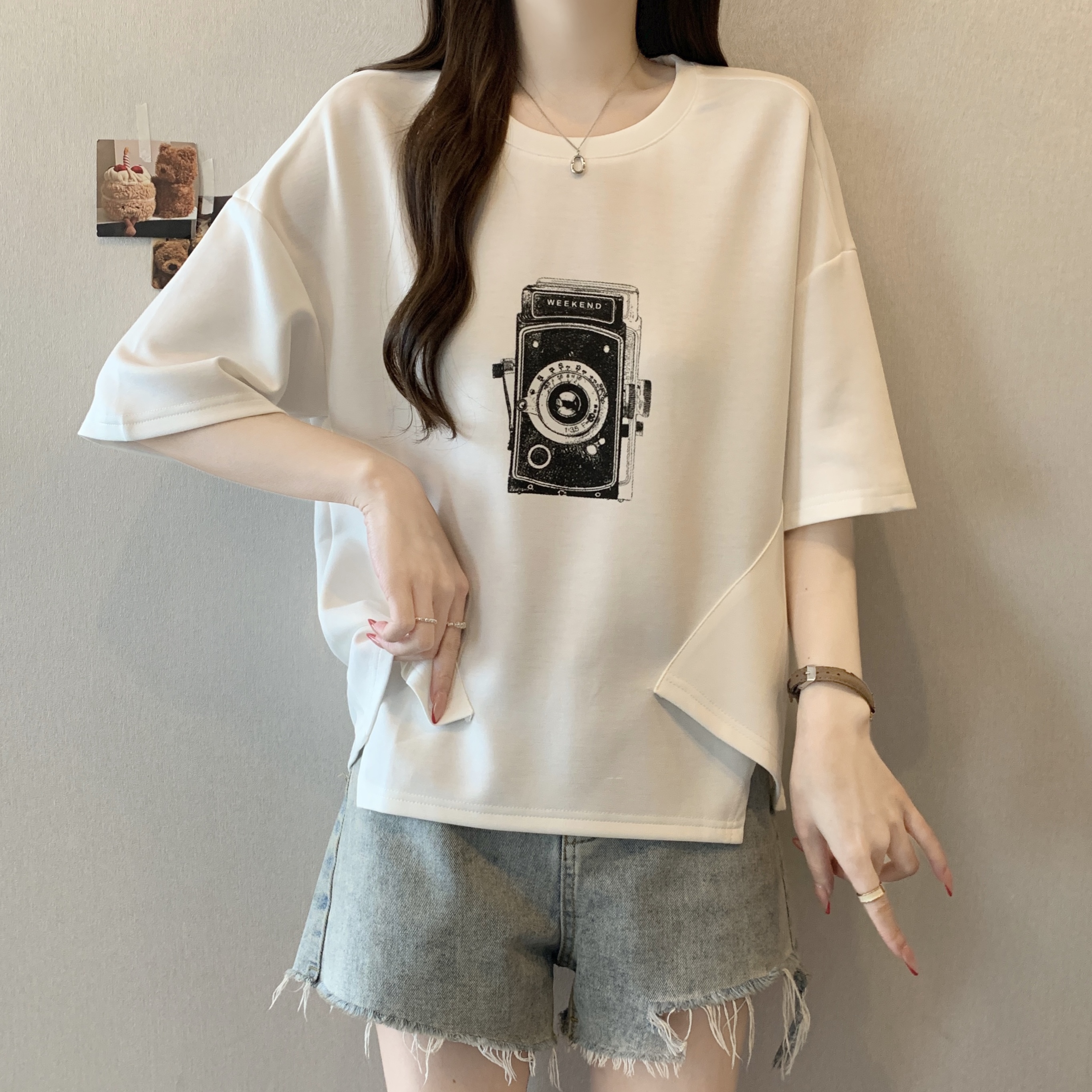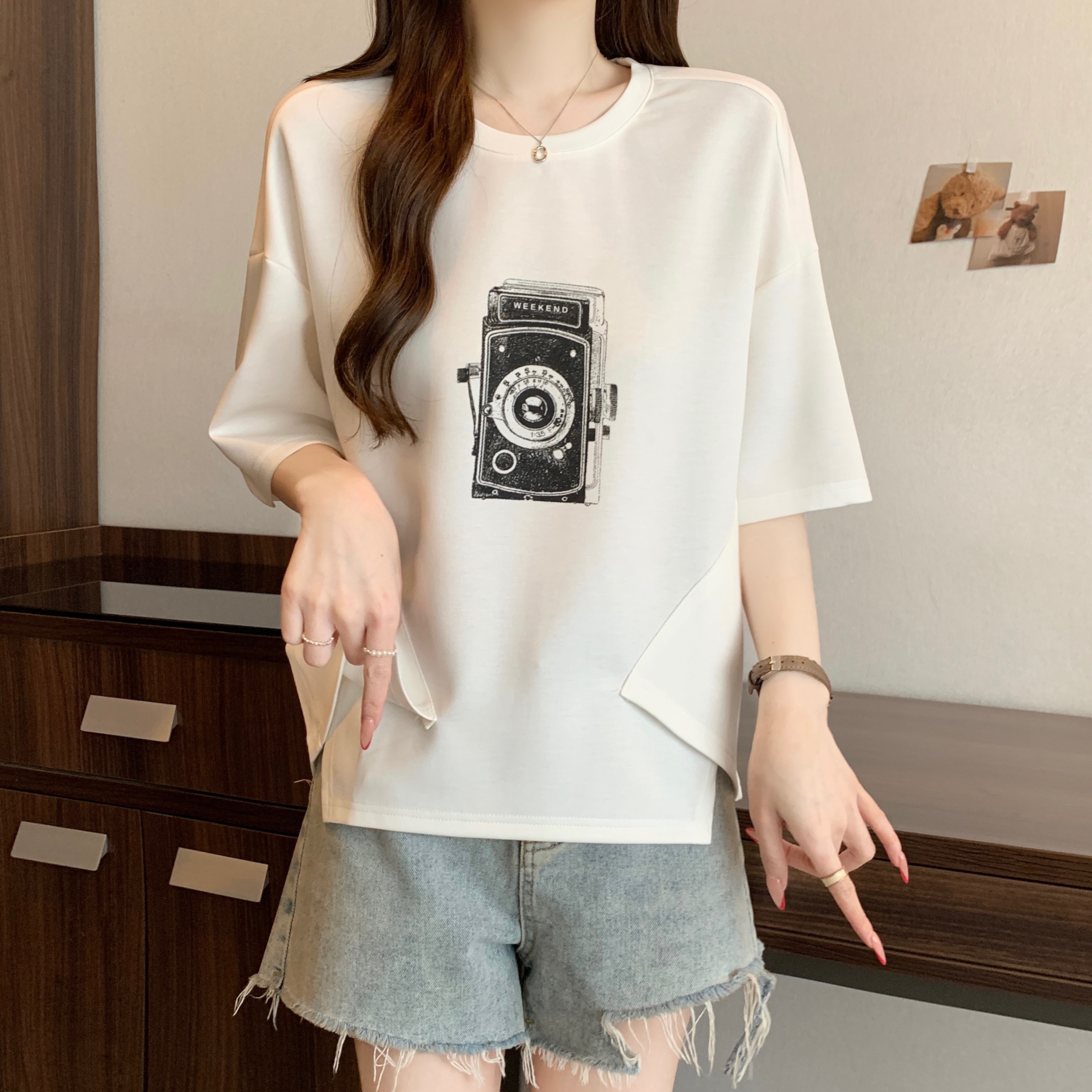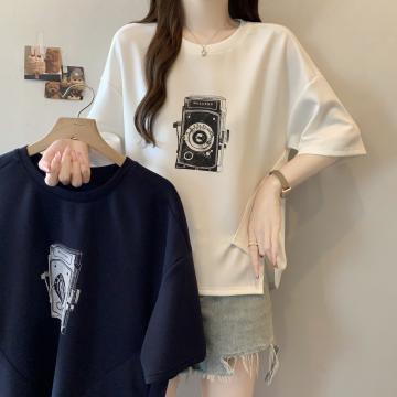Home > 短袖T恤 > BY13317# 胖MM新款时尚印花拼色不规则T恤女宽松显瘦休闲百搭小众上衣 服裝批發女裝批發服飾貨源