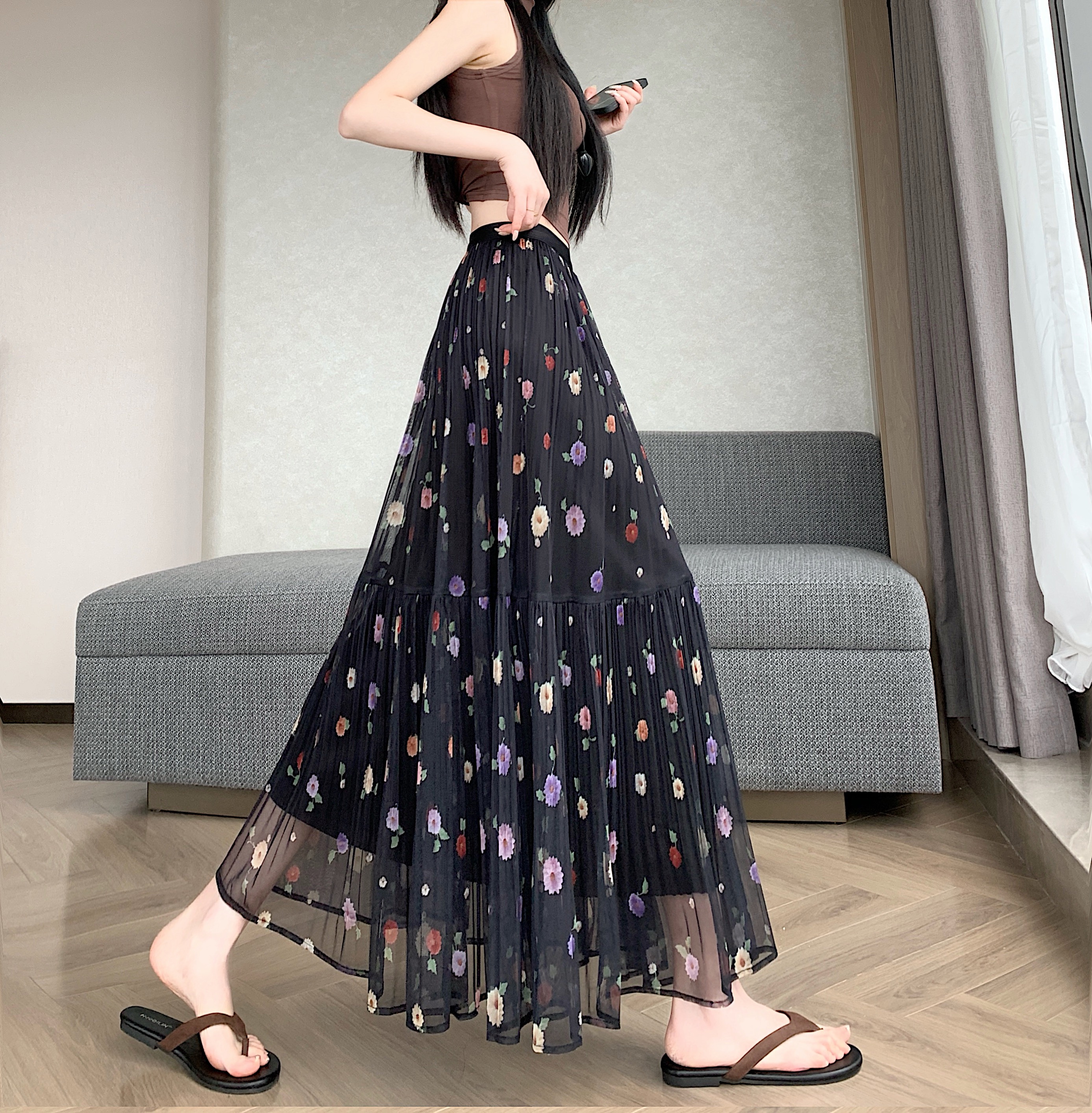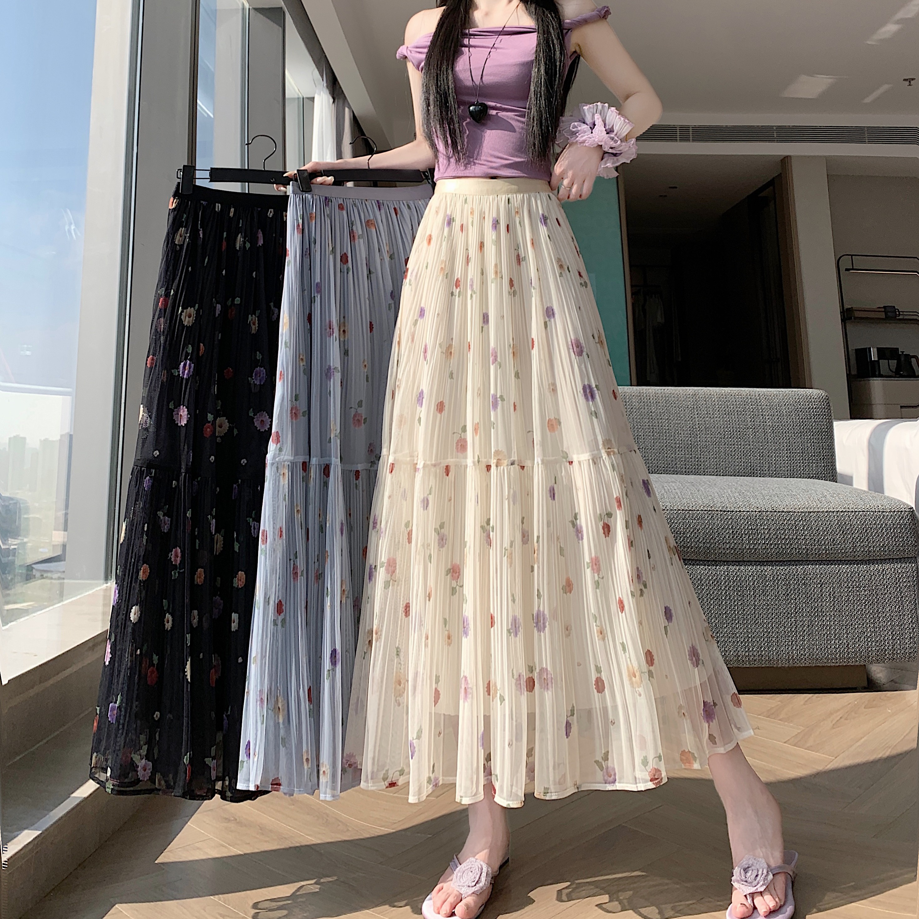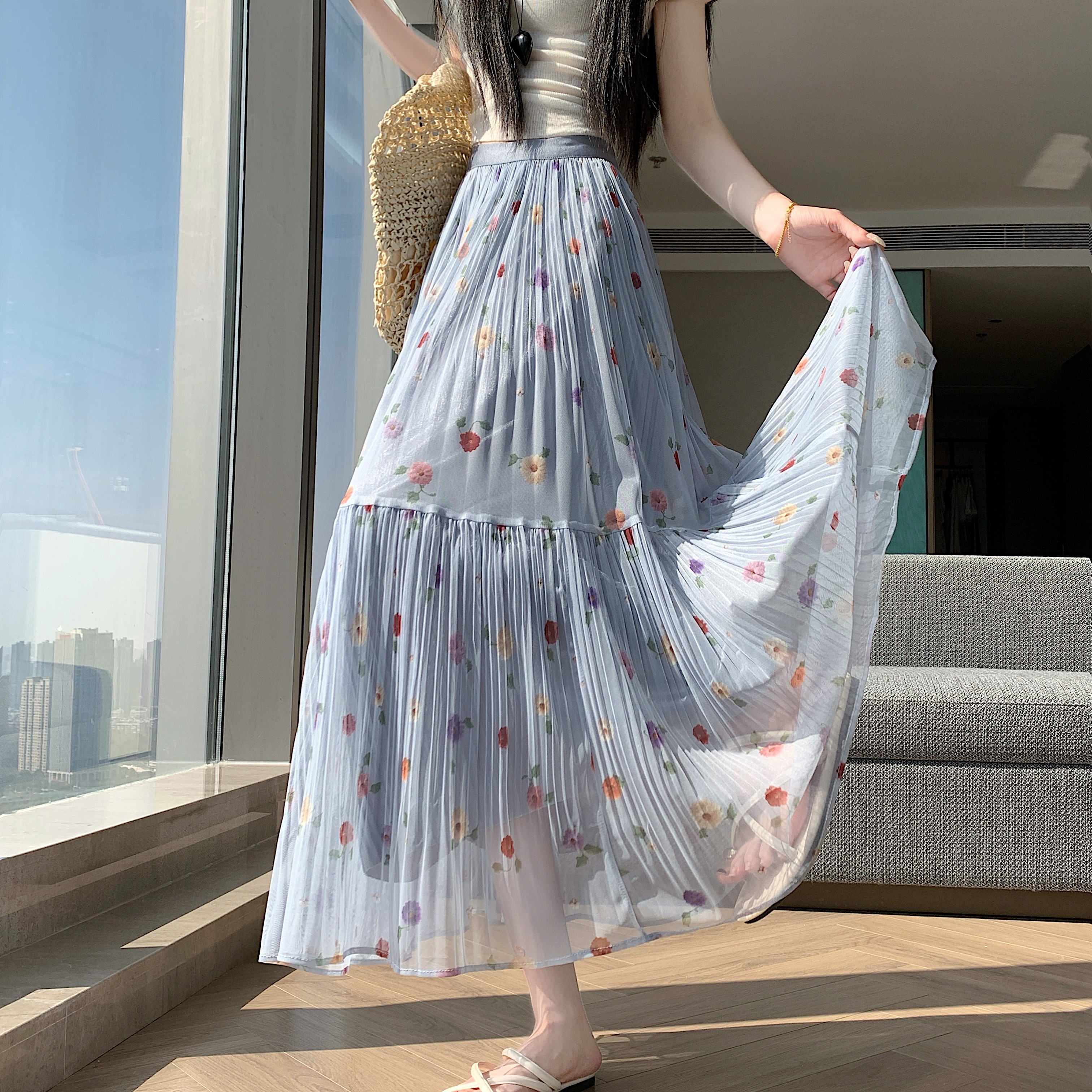 BY13841# 大码胖MM夏季新款简约小清新碎花中长款百褶拼接显瘦半身裙 服裝批發女裝批發服飾貨源