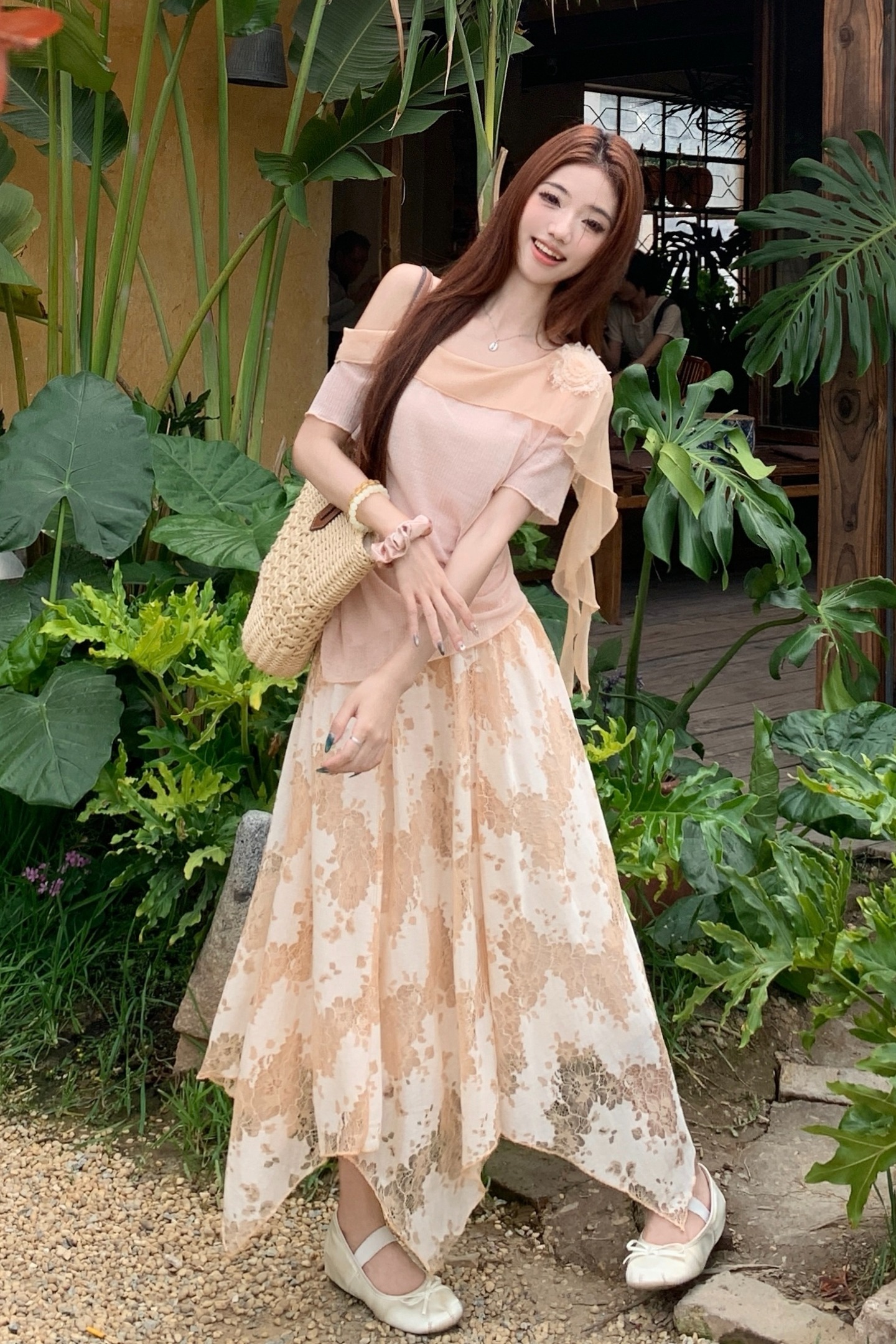 BY15120# 大码女装山茶花露肩上衣+蕾丝半身裙套装胖mm百搭两件套 服裝批發女裝批發服飾貨源