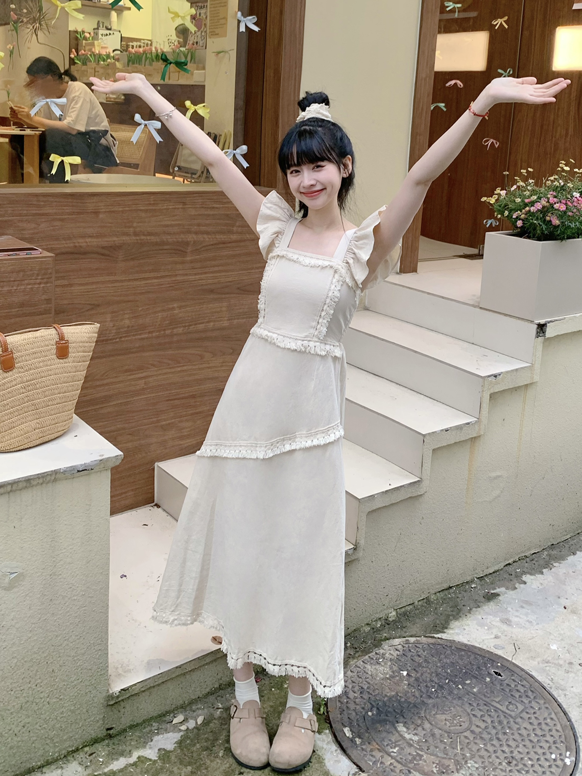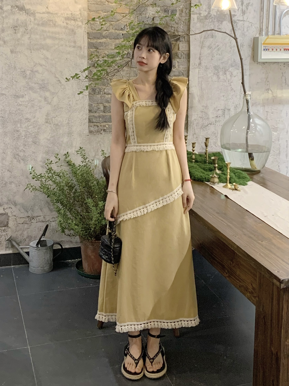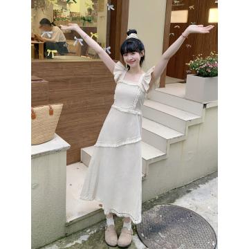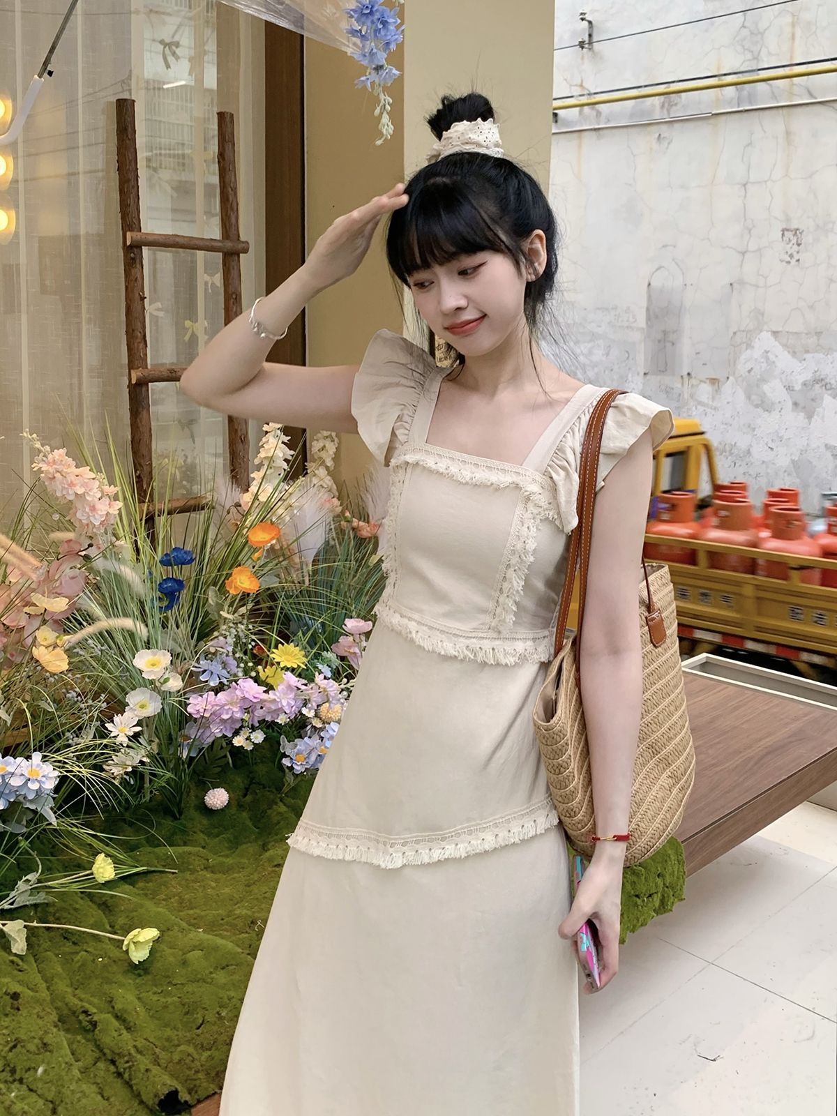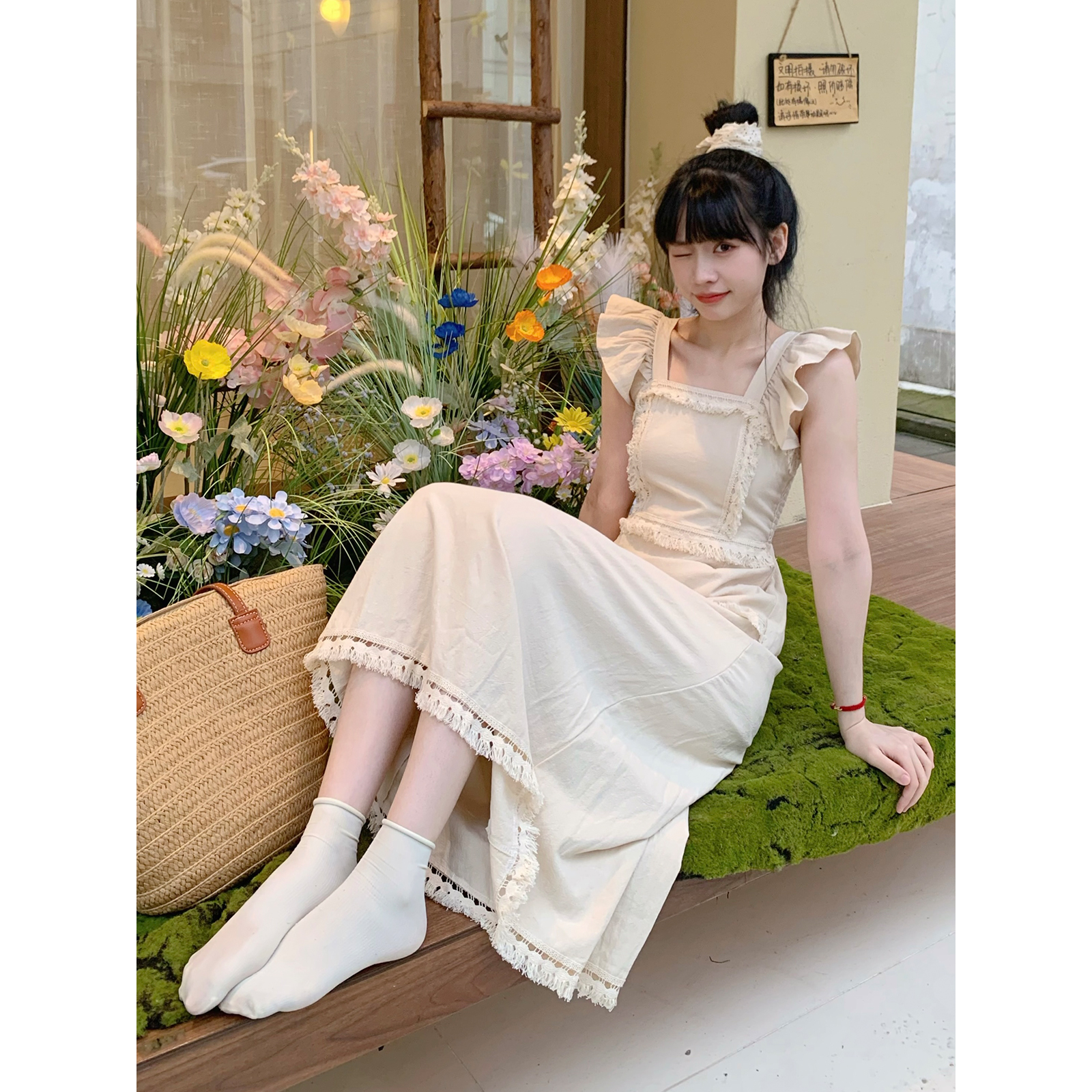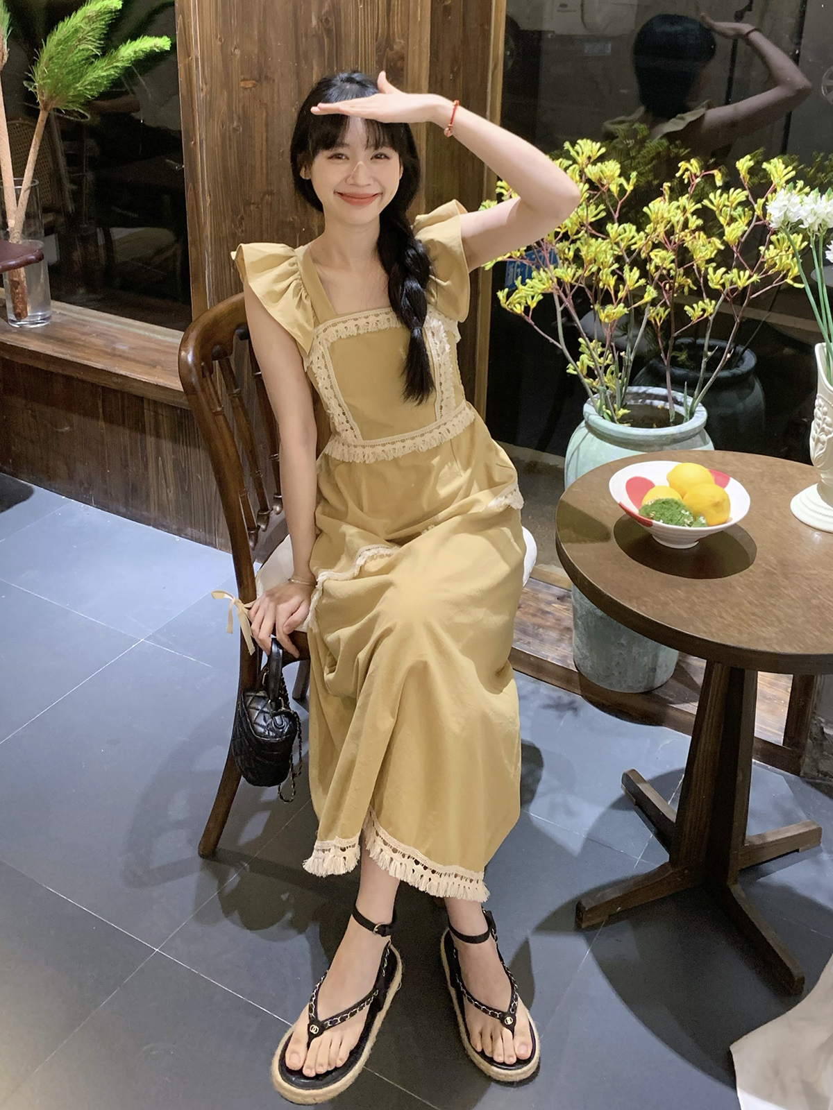 BY15134# 夏季新款连衣裙设计感重工流苏别致方领飞飞袖气质长裙 服裝批發女裝批發服飾貨源