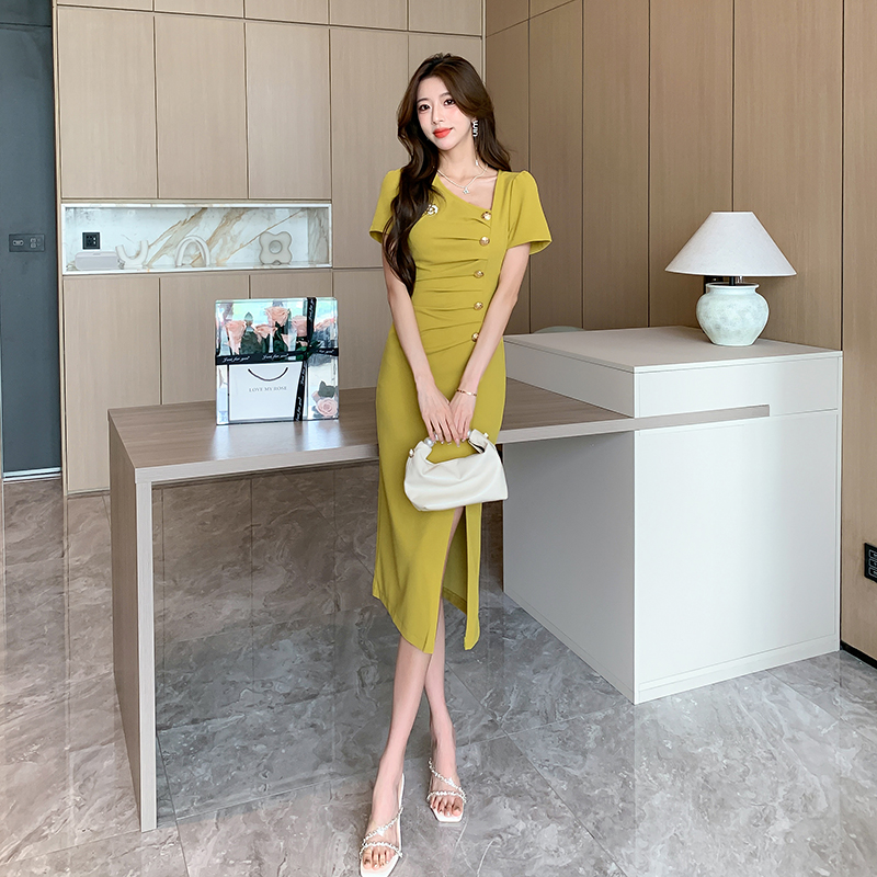 BY15151# 视频夏季时尚网红v领炸街单排扣长裙开叉包臀连衣裙 服裝批發女裝批發服飾貨源