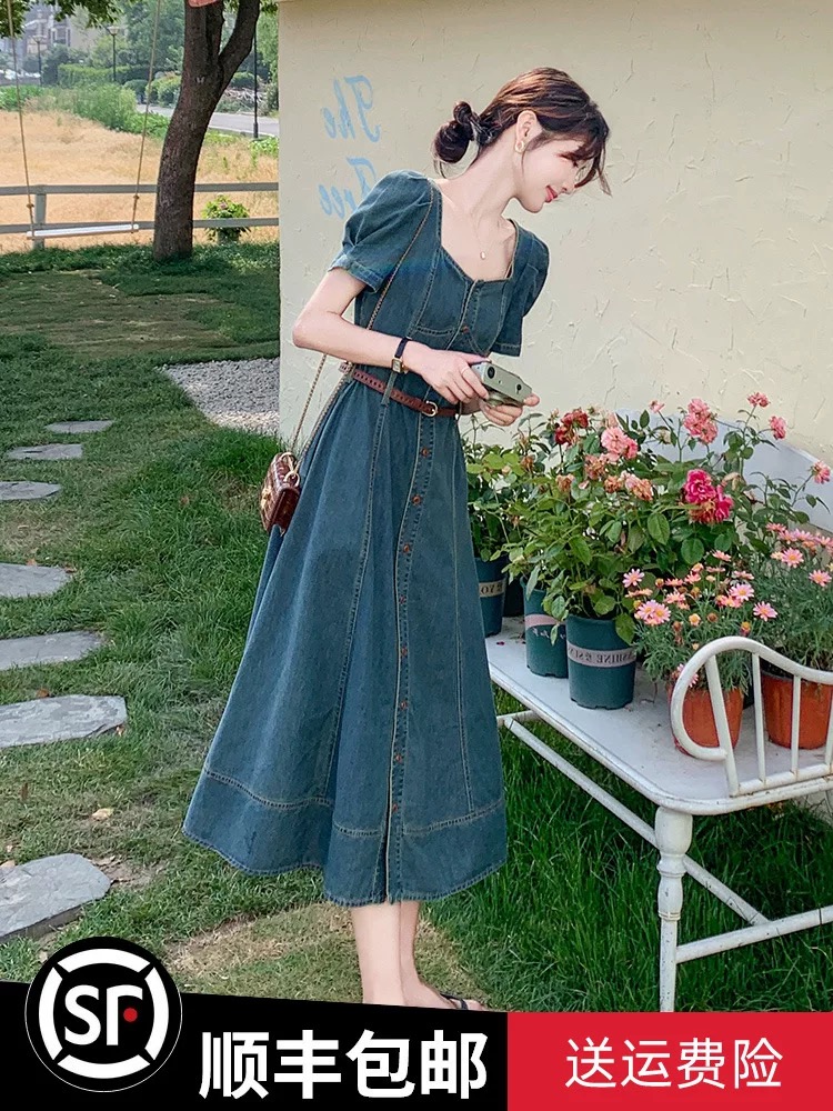 BY17181# 港风复古牛仔连衣裙女夏季新款薄款气质方领别致收腰显瘦长裙
