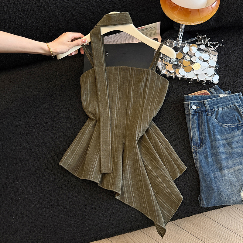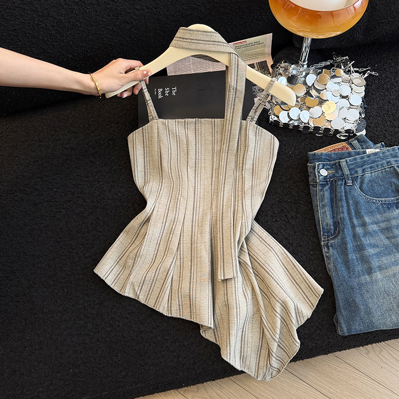 BY17211# 夏季条纹亚麻高级吊带法式复古不规则吊带