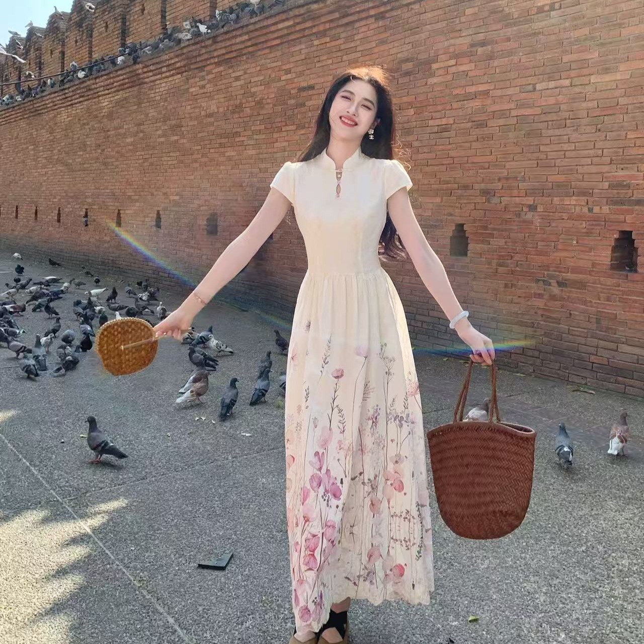 BY17241# 风信新中式碎花刺绣改良旗袍女早春短袖大摆长款连衣裙