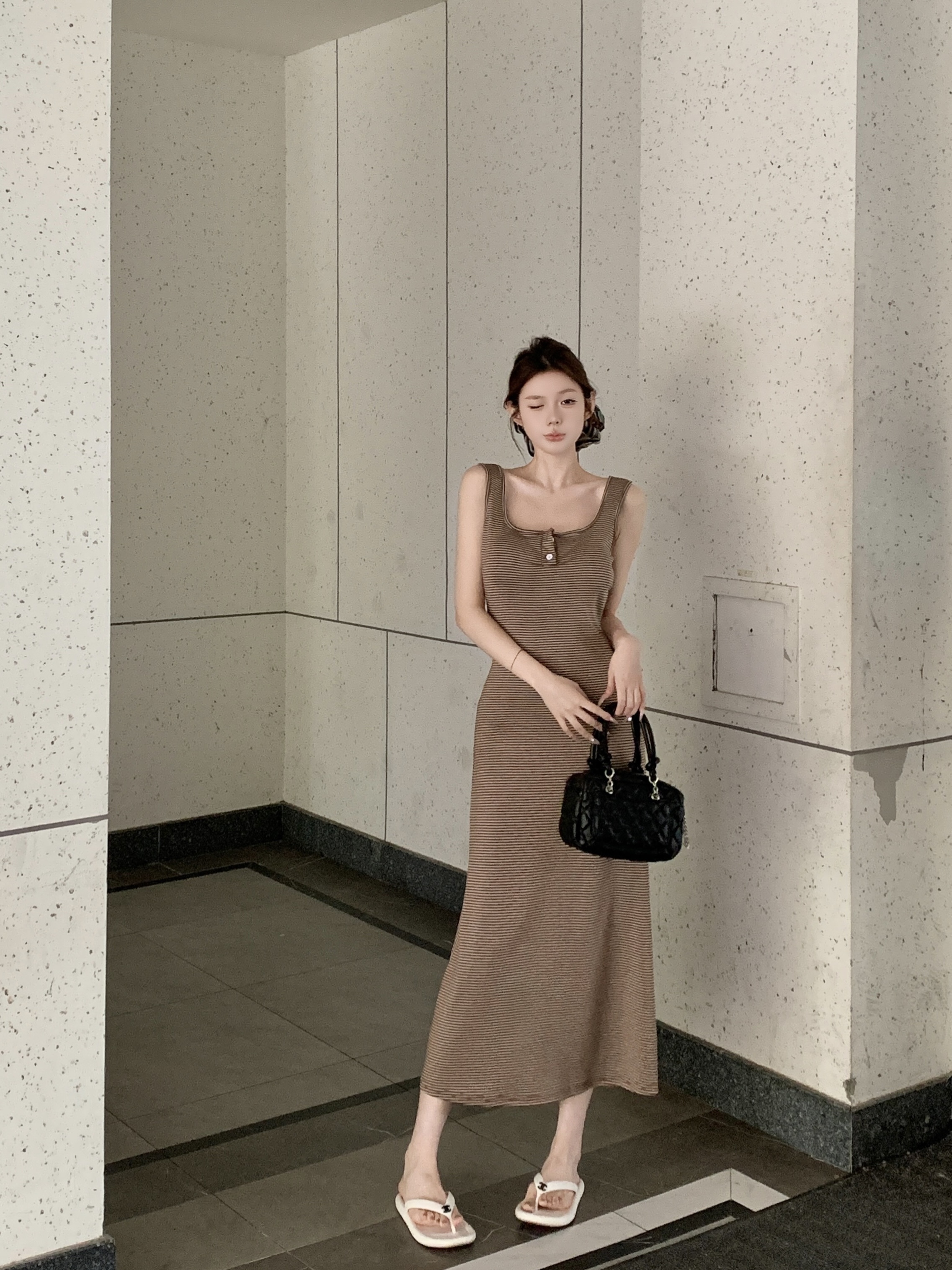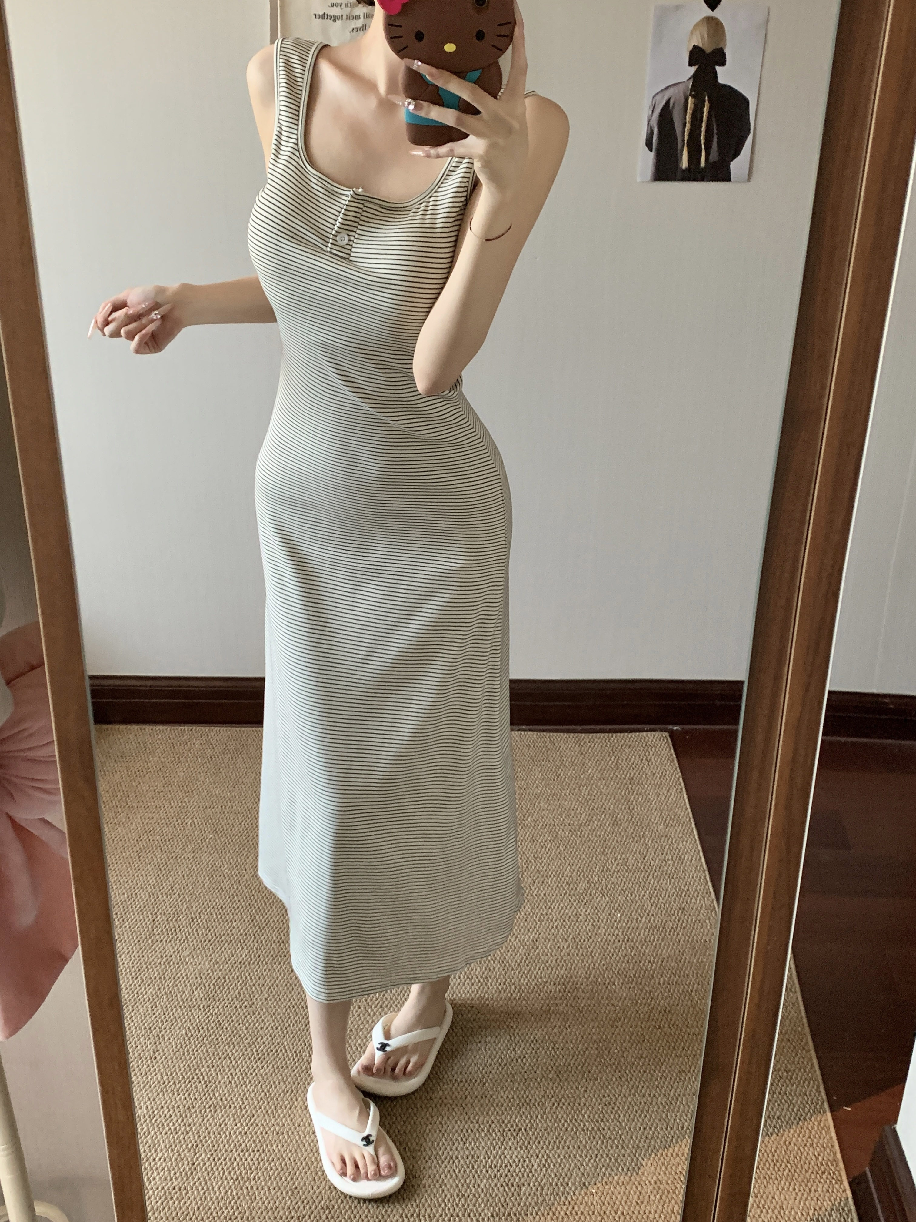 BY17249# 条纹打底裙韩版气质显瘦自带胸垫吊带连衣裙长裙女