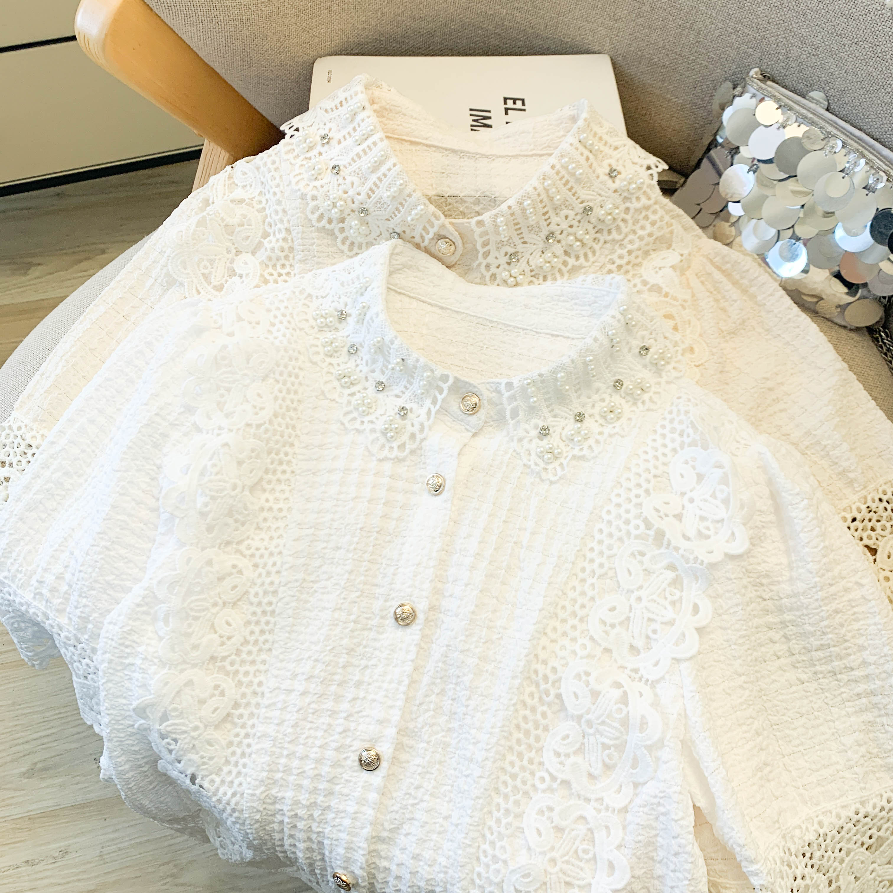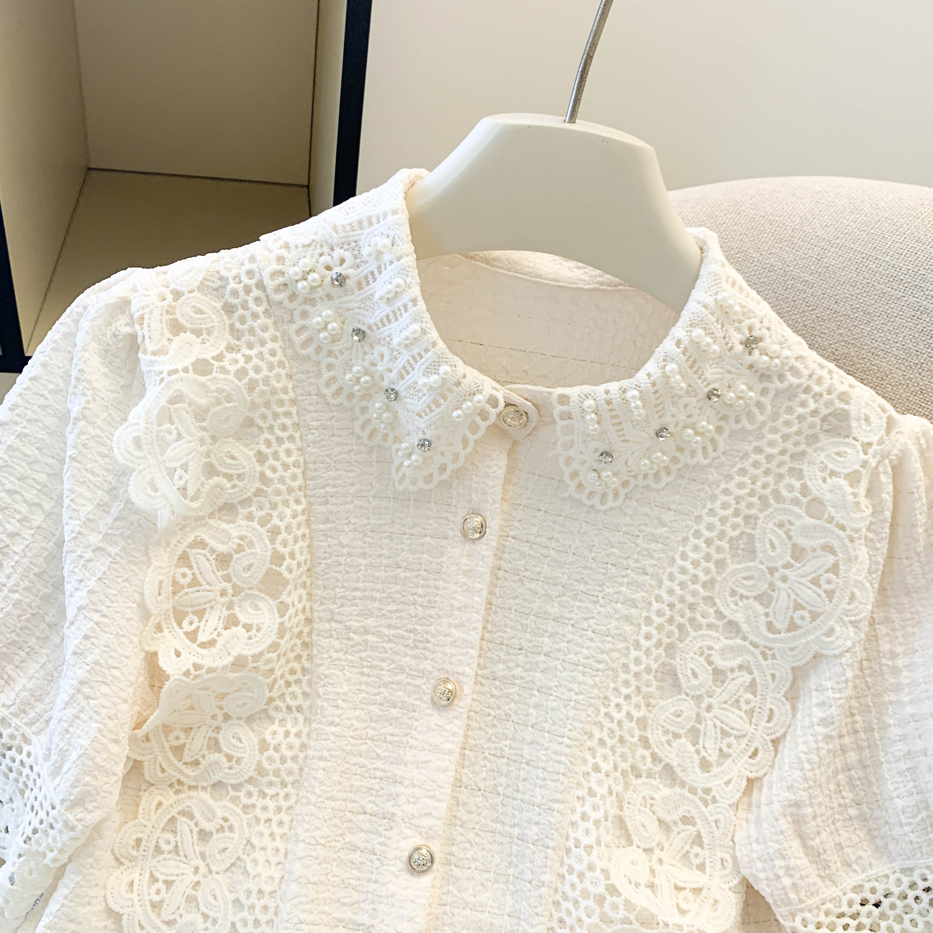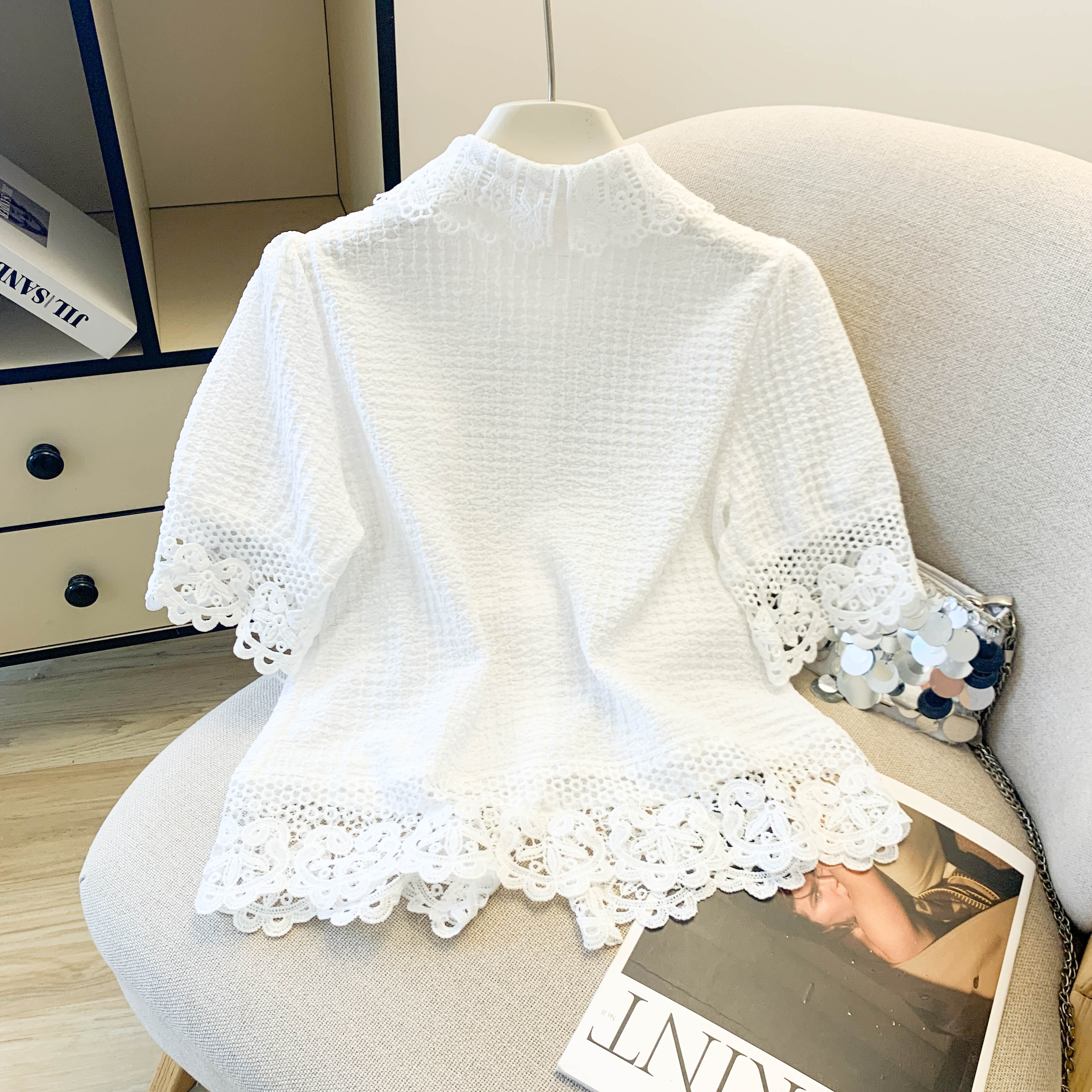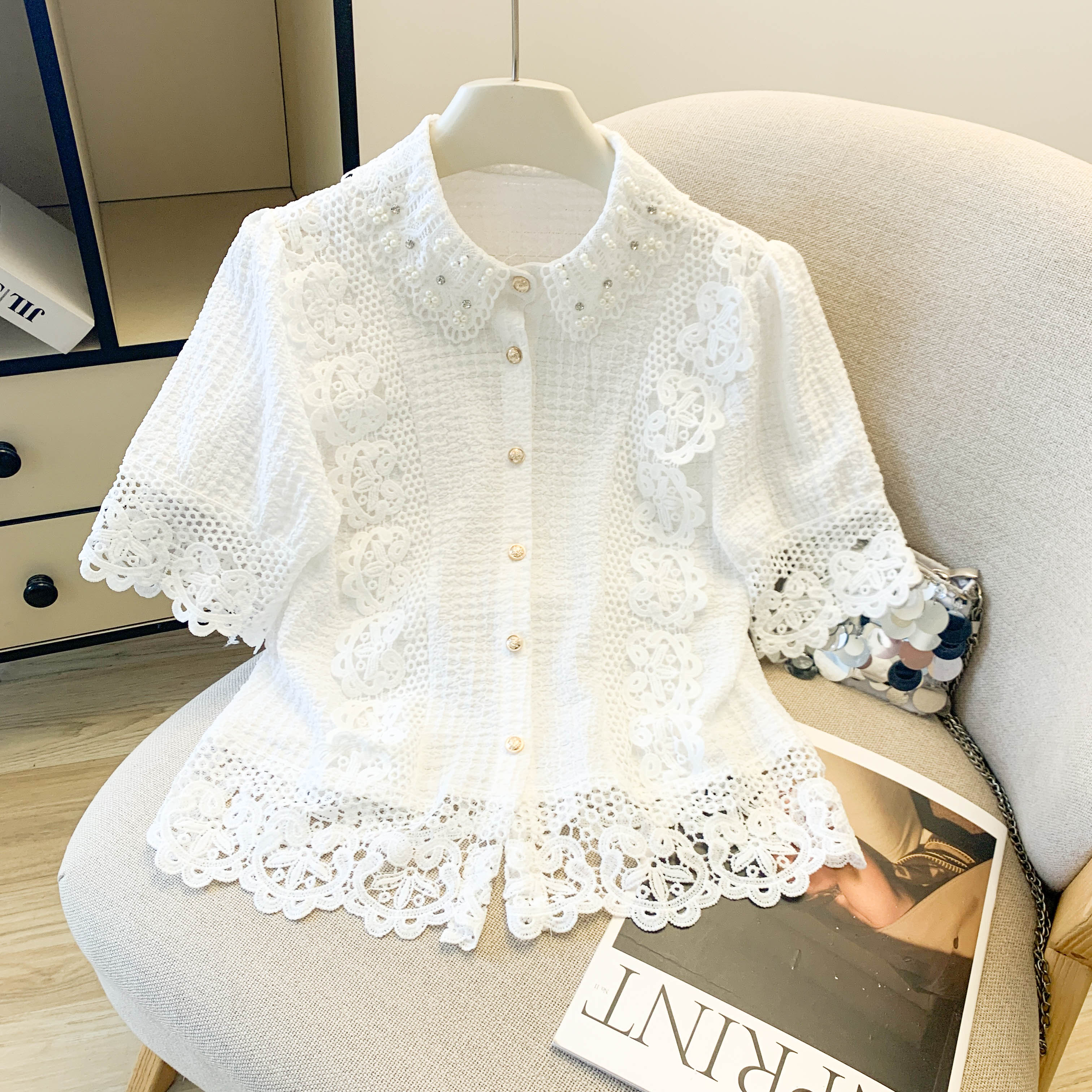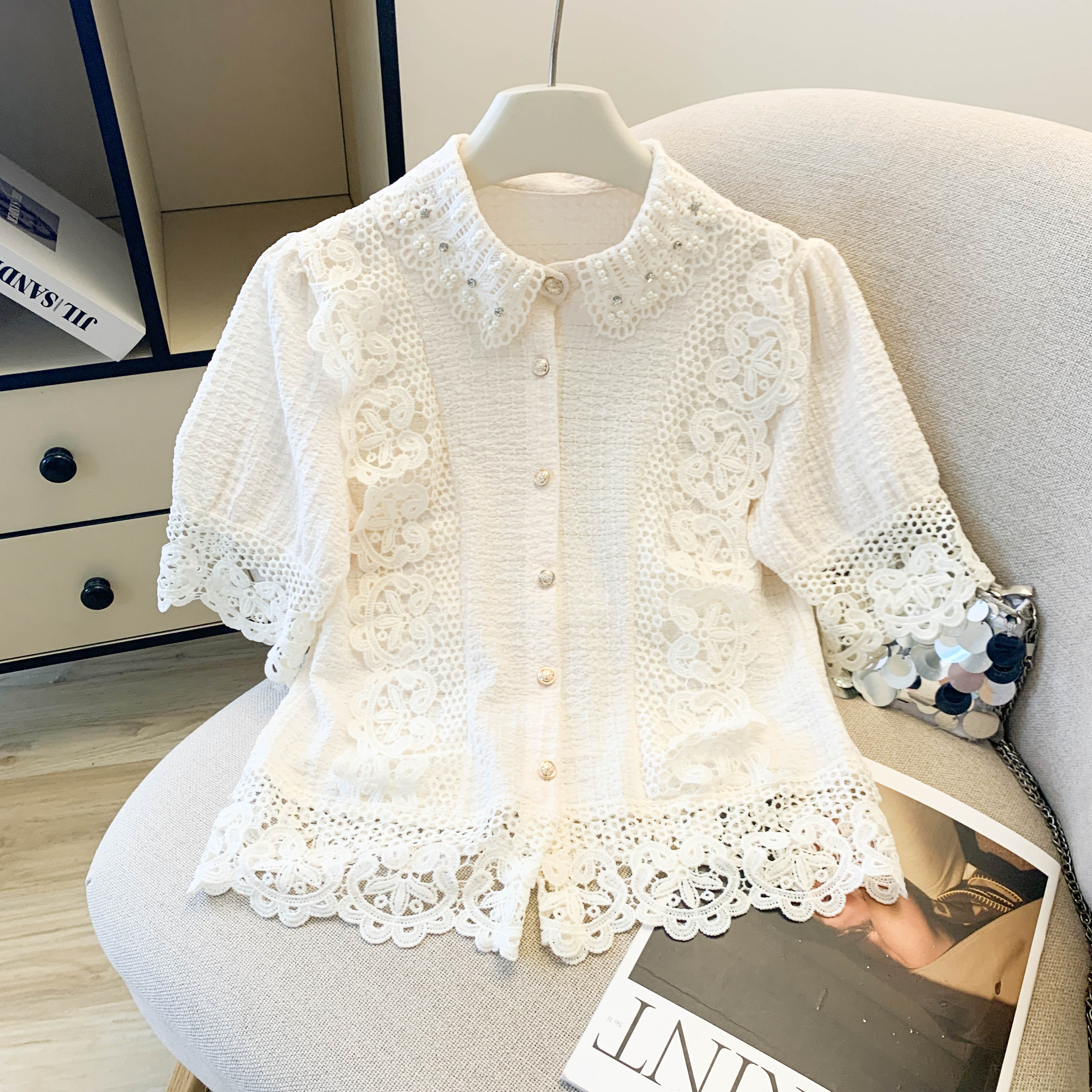 BY17307# 法式气质蕾丝拼接钉珠翻领短袖衬衫女春高级感单排扣减龄上衣