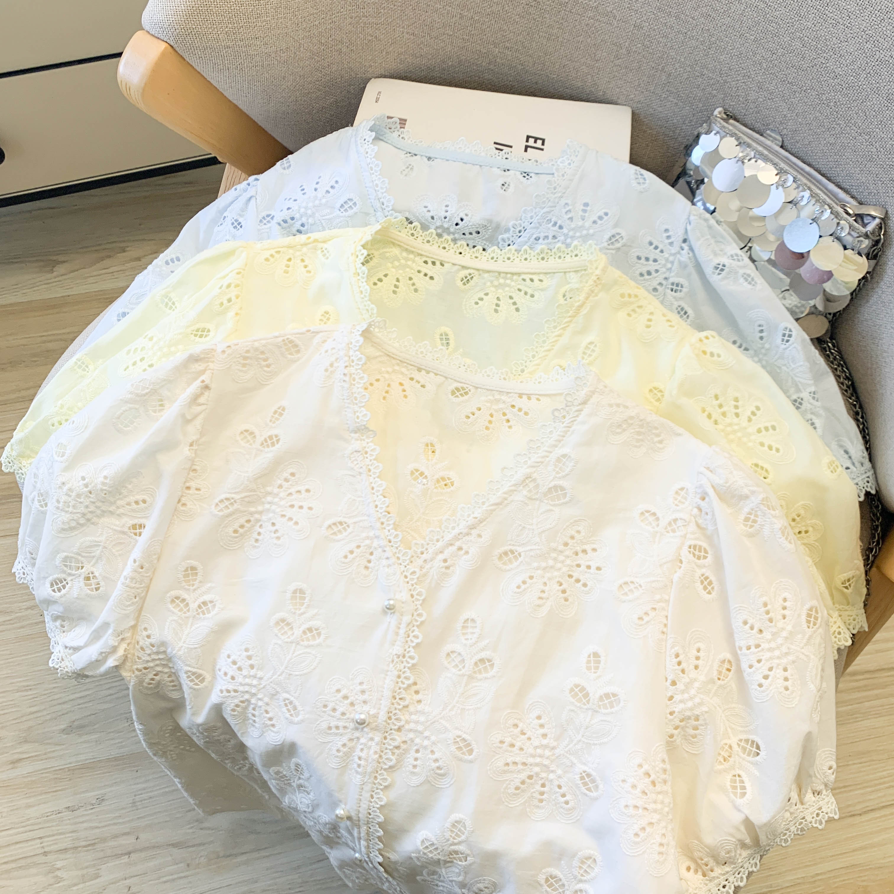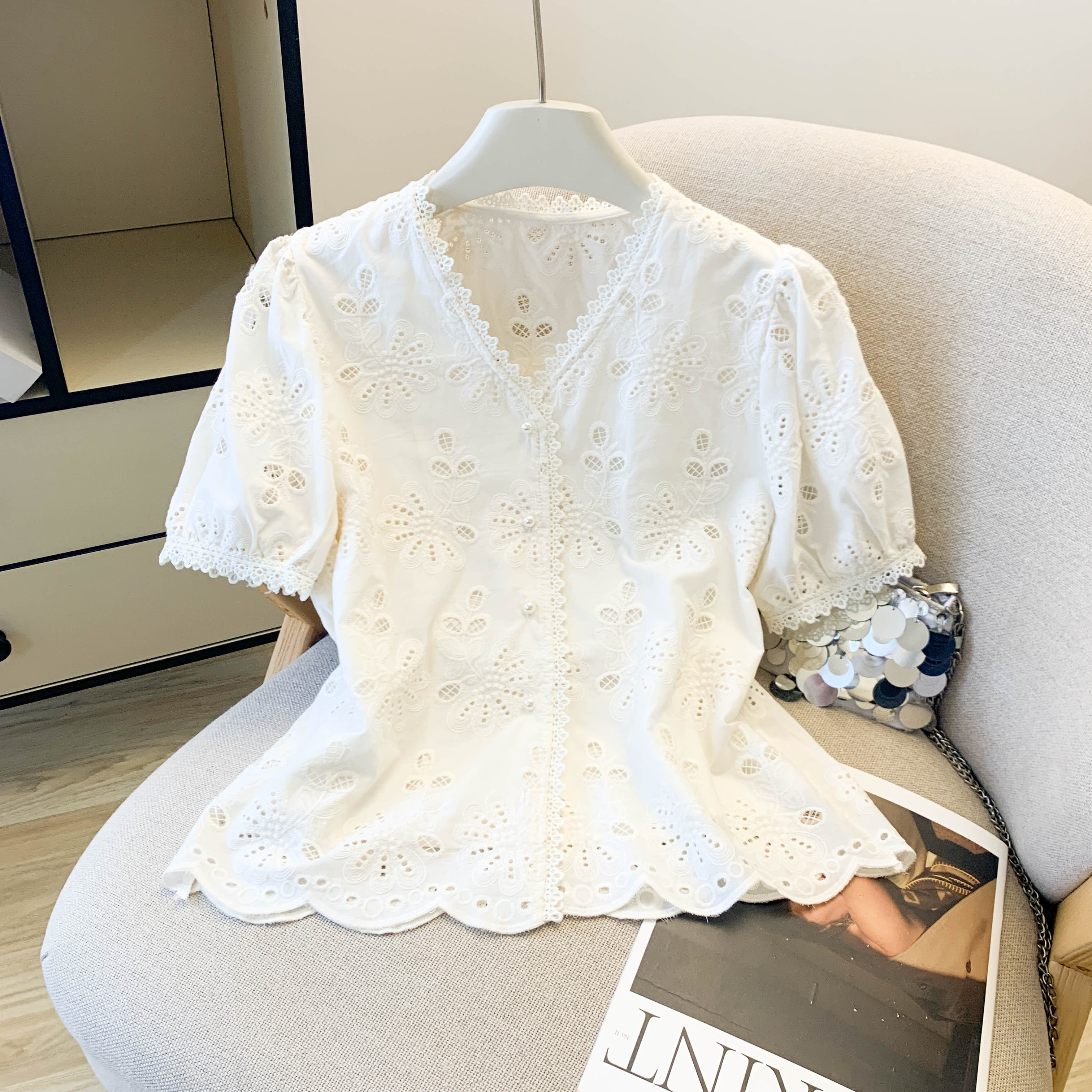 BY17308# 法式V领刺绣花朵镂空泡泡袖花边衬衫女春宽松减龄单排扣上衣