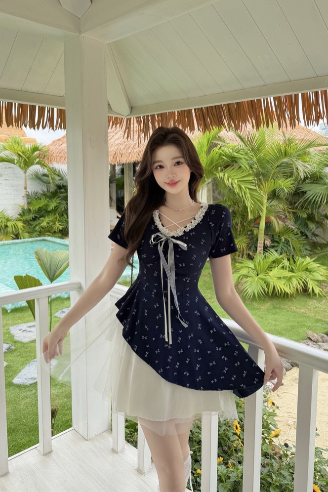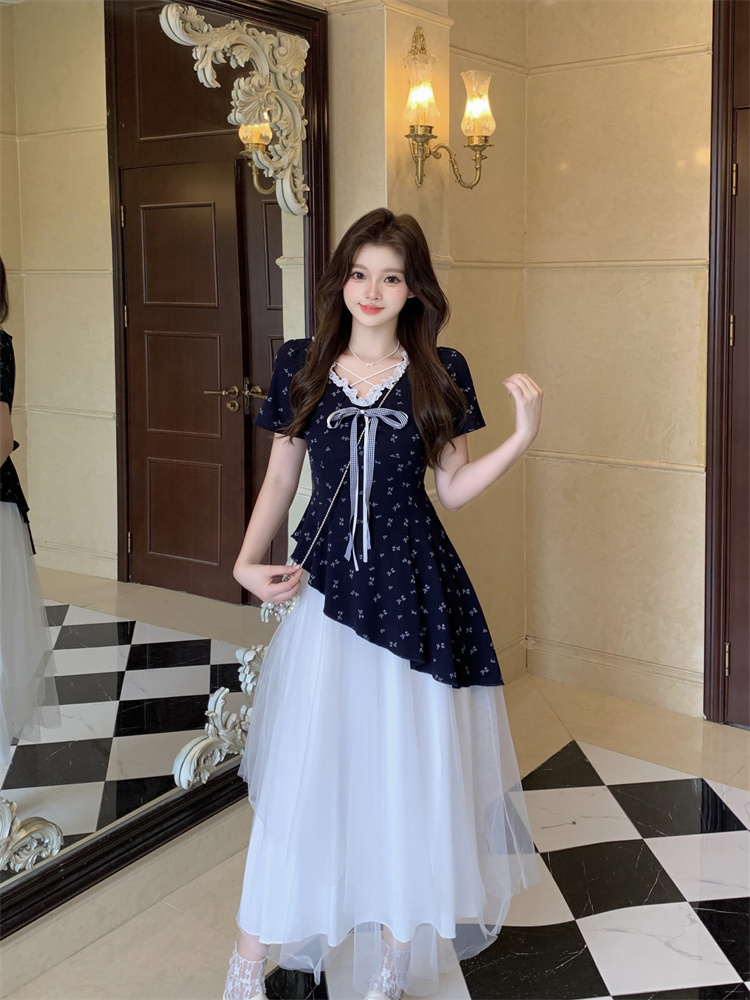 BY17336# 胖mm甜美收腰不规则网纱连衣裙气质蕾丝碎花裙