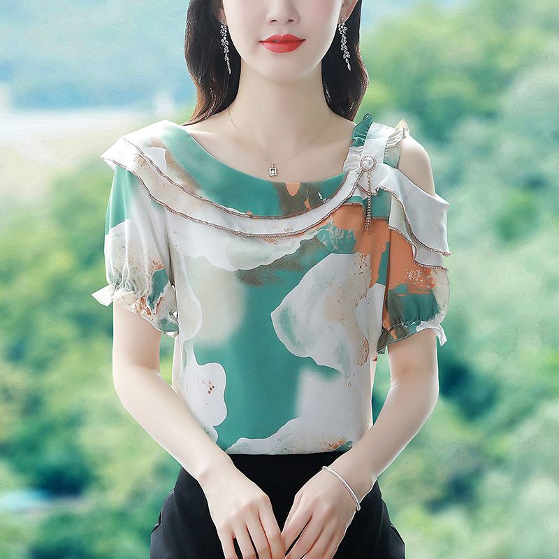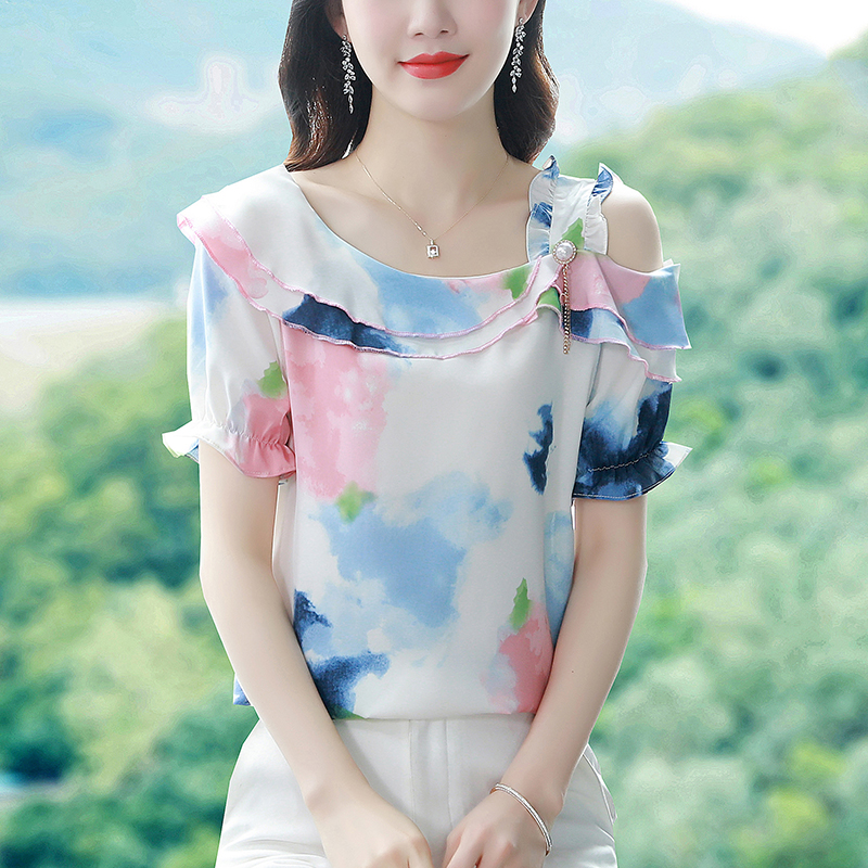 BY17358# 雪纺衫女短袖夏季新款时尚气质荷叶边露肩个性雪纺小衫