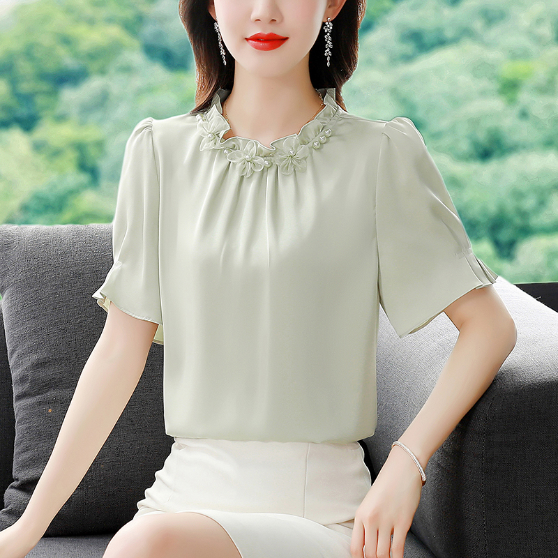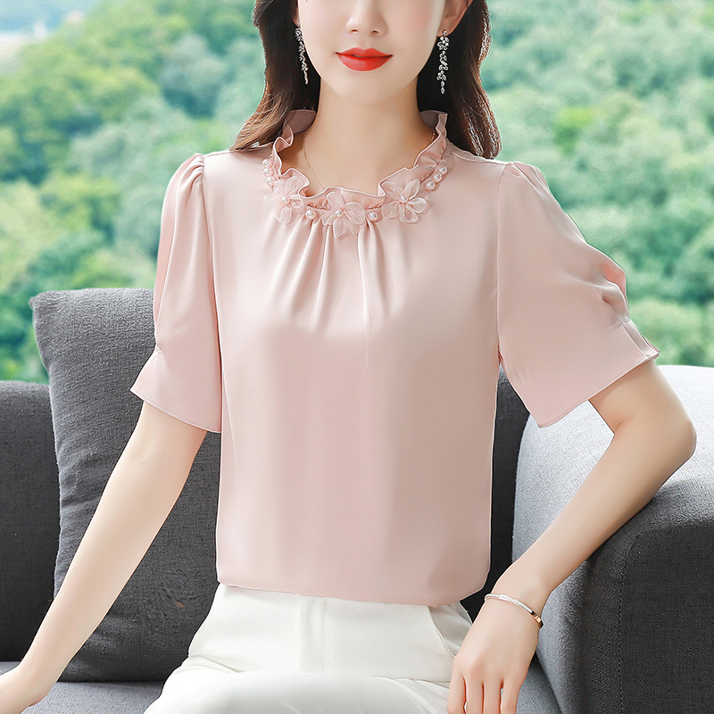 BY17362# 真丝缎面短袖衬衫夏新款时尚气质减龄甜美上衣女装