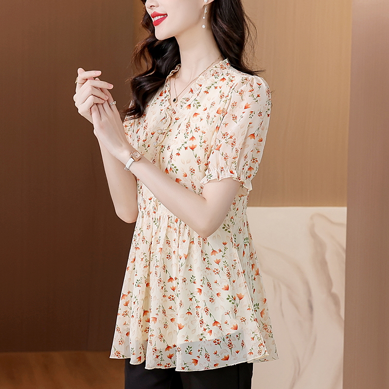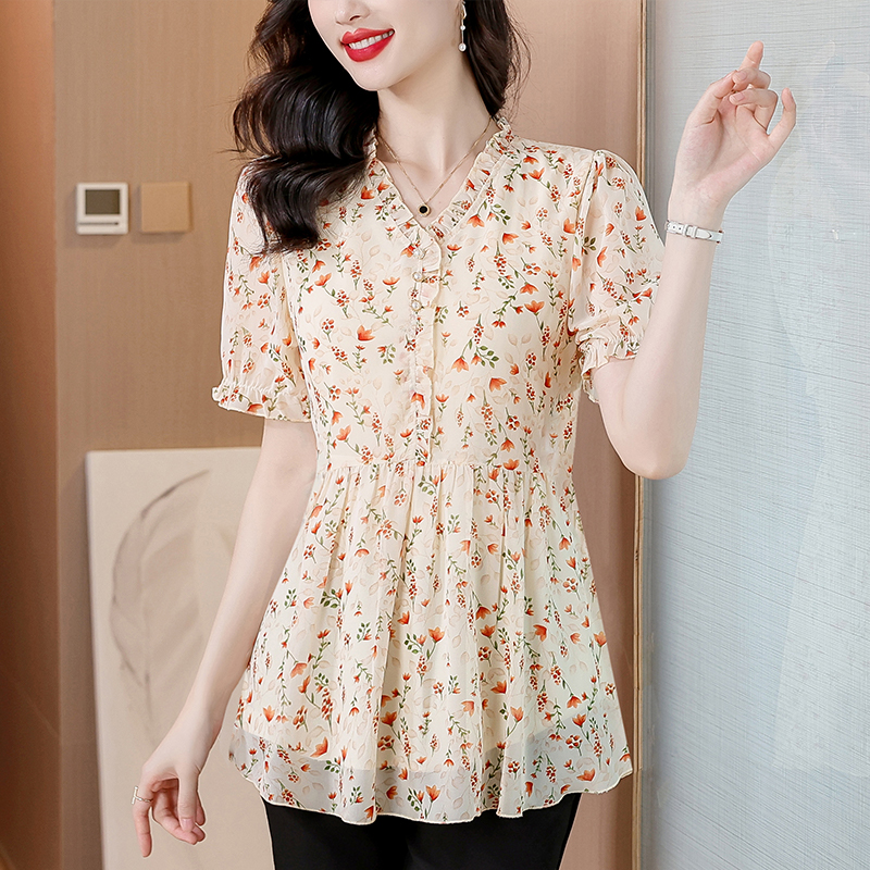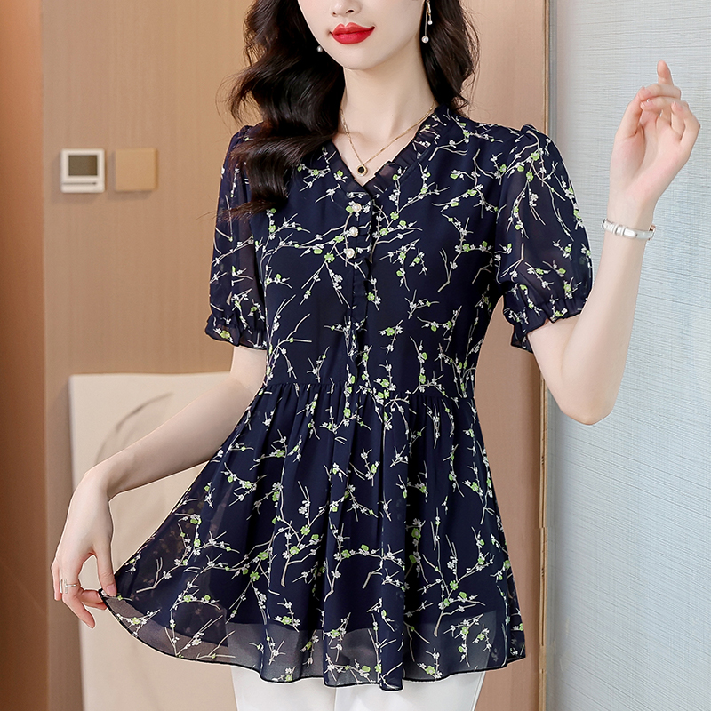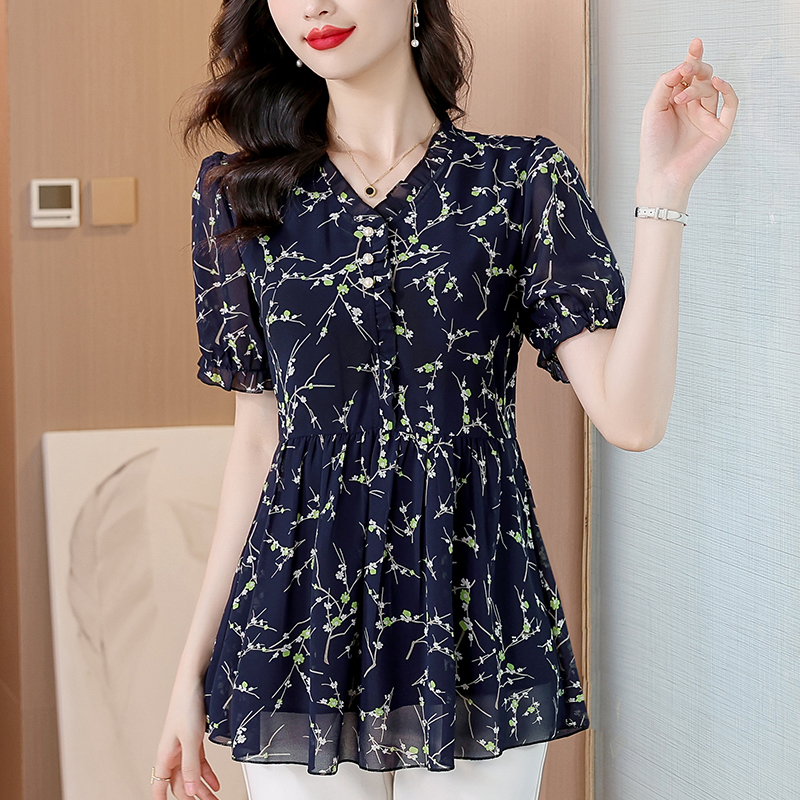 BY17398# 今年夏季新款印花短袖雪纺纱设计感时尚女装上衣