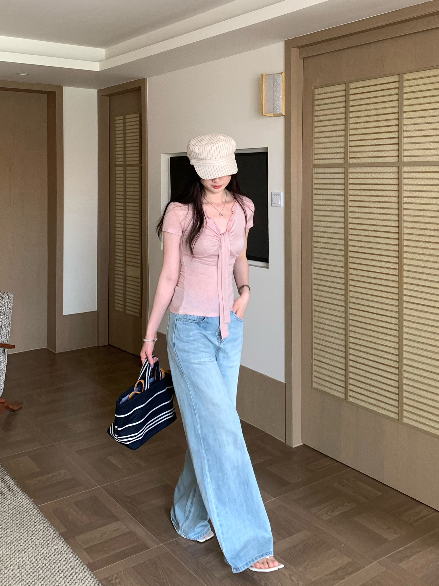 BY17404# 图莱赛尔天丝羊毛绑带修身v领短袖T恤女新款独特漂亮上衣