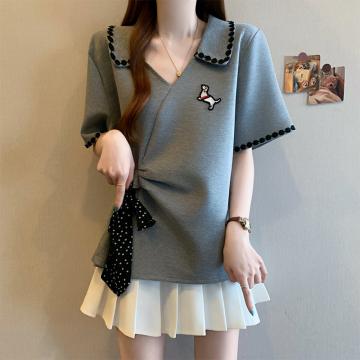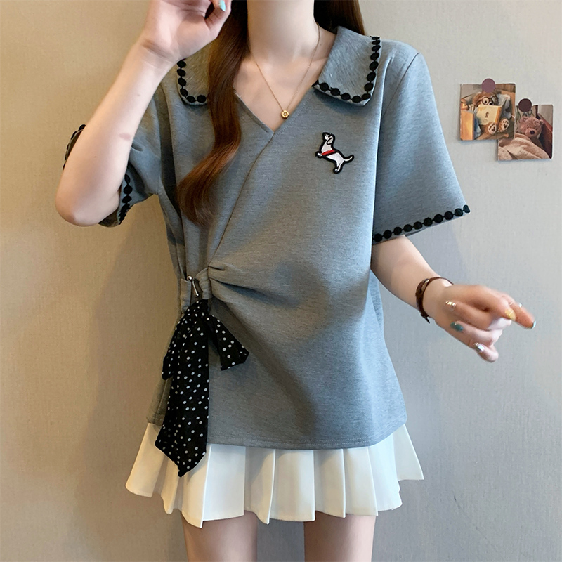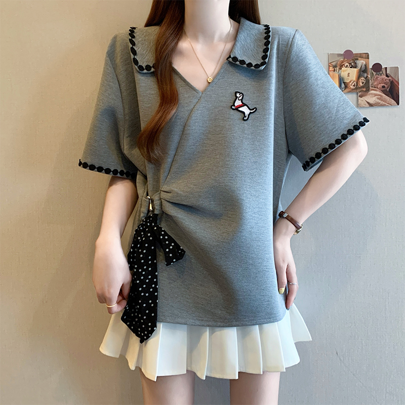 夏季新款大码女装时尚设计感polo领绑带收腰显瘦别致T恤 服裝批發女裝批發服飾貨源