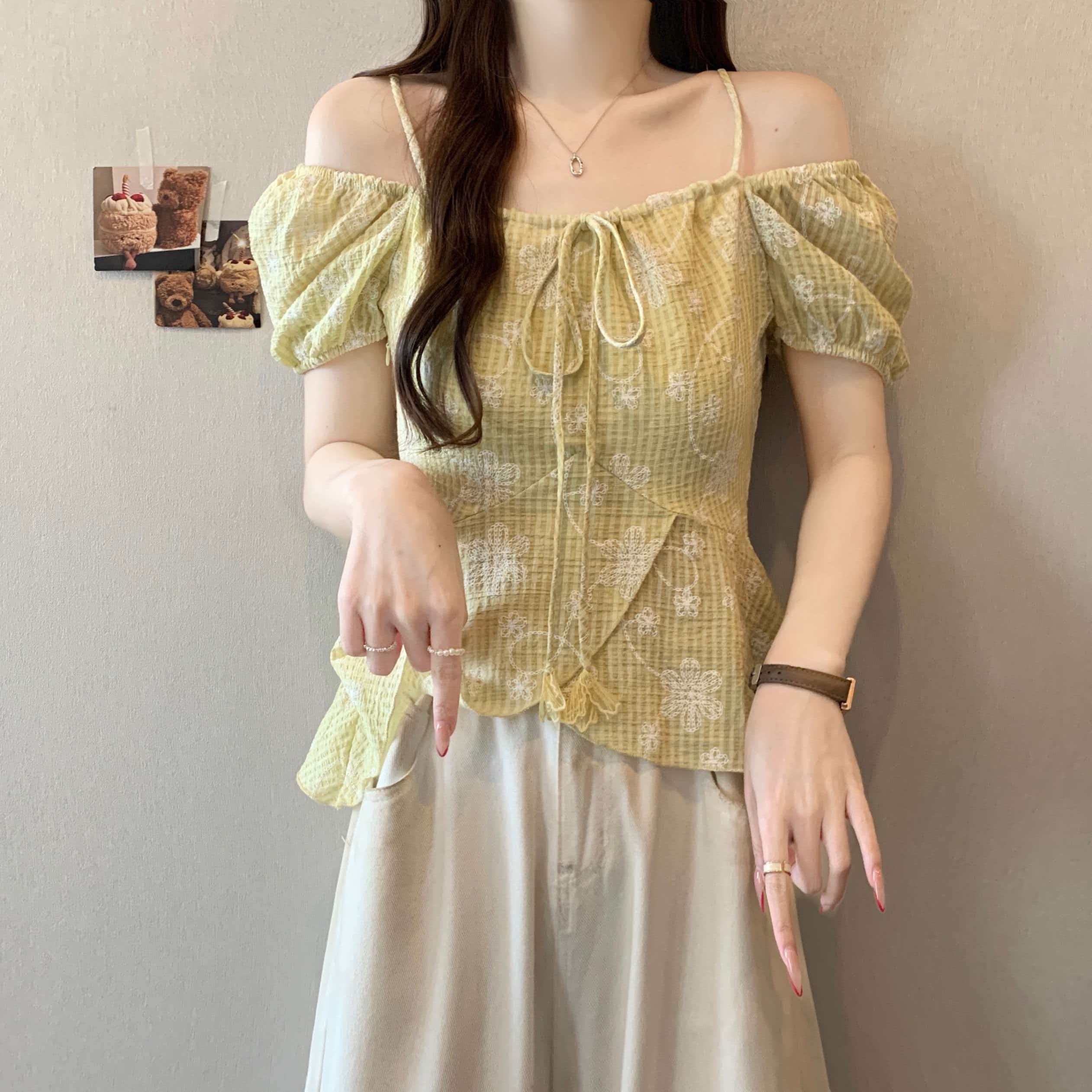 大码女装夏季韩版吊带一字肩短袖衬衣女露肩格子小清新上衣女 服裝批發女裝批發服飾貨源