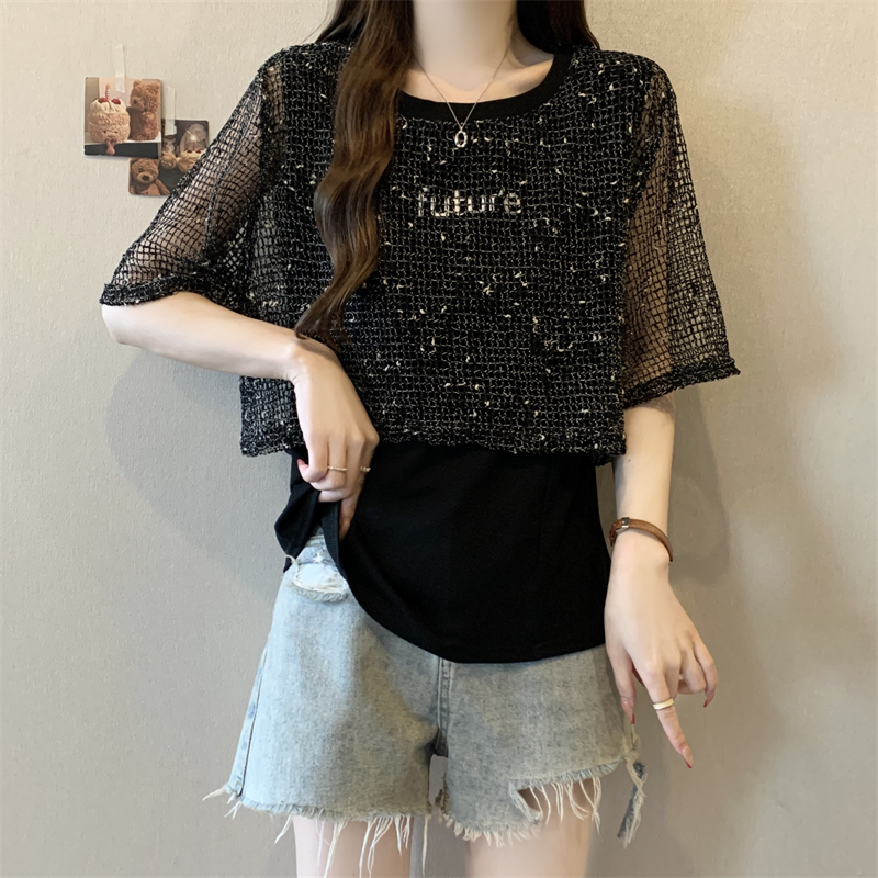 BY17468# 大码胖MM新款设计感拼接网织镂空罩衫短袖遮肉显瘦上衣 服裝批發女裝批發服飾貨源
