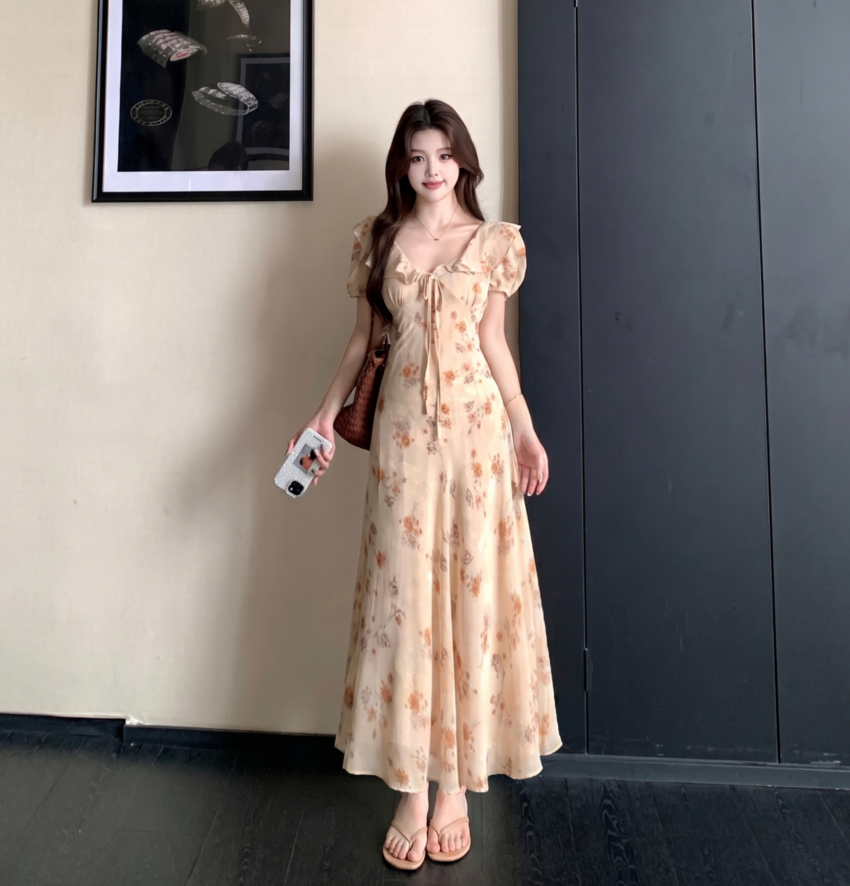 BY17614# 大码胖mm法式碎花荷叶领短袖连衣裙高腰遮肉显瘦气质长裙 服裝批發女裝批發服飾貨源