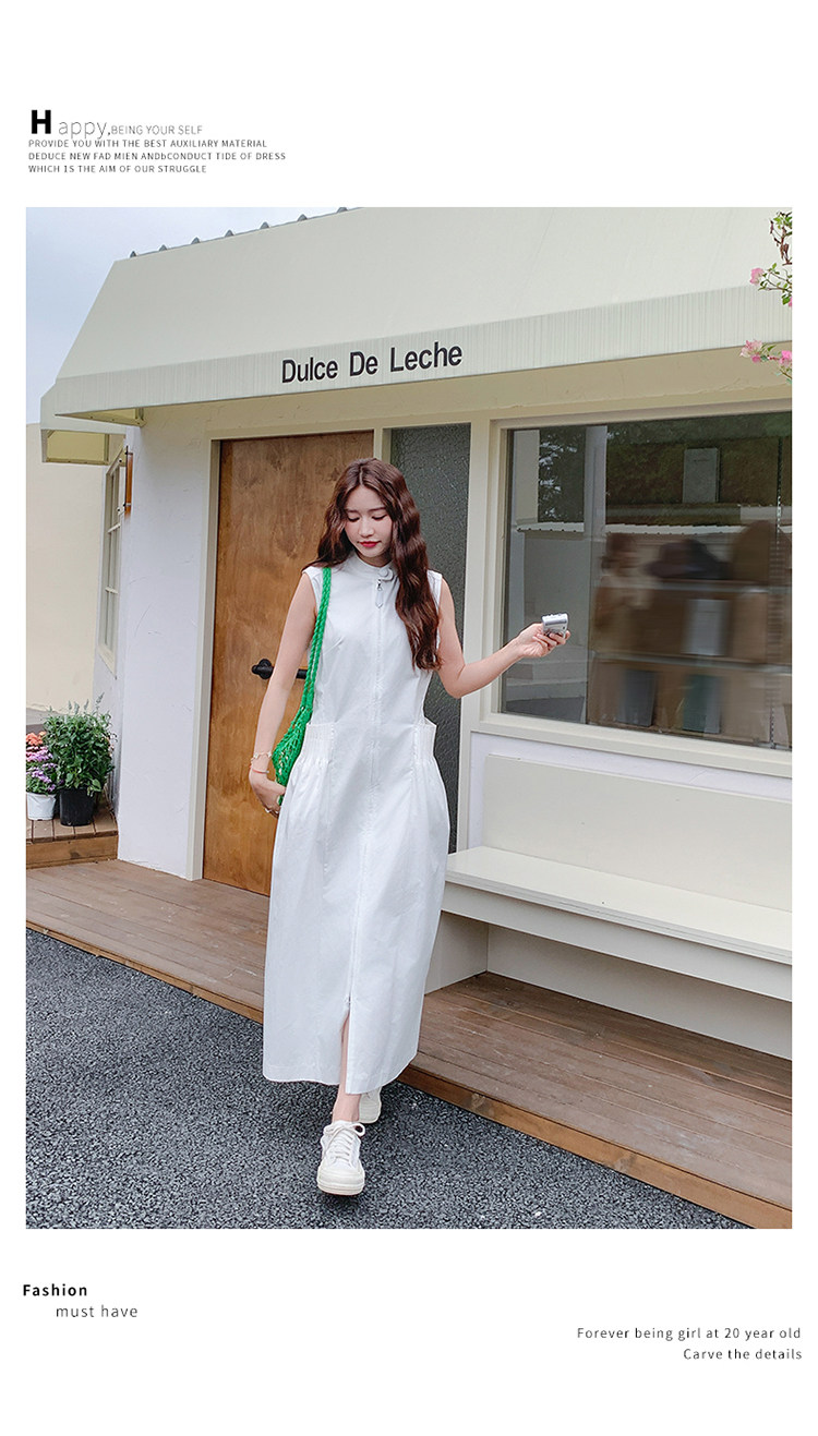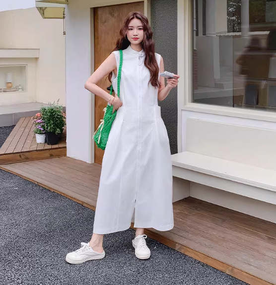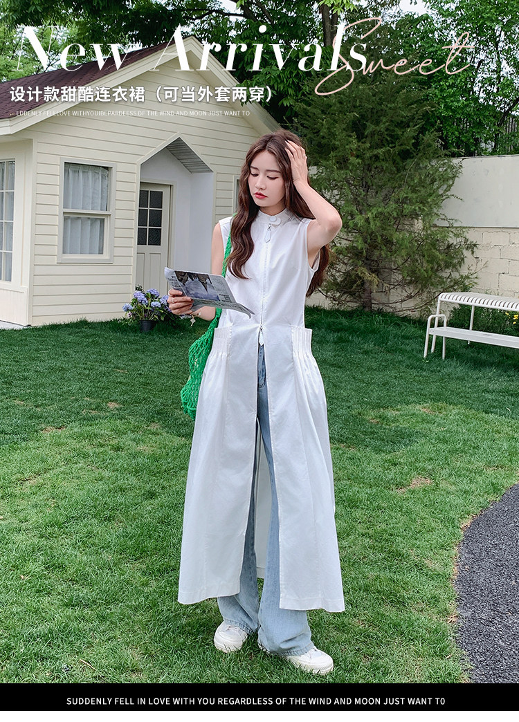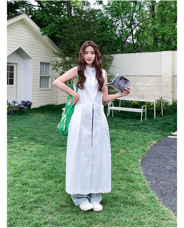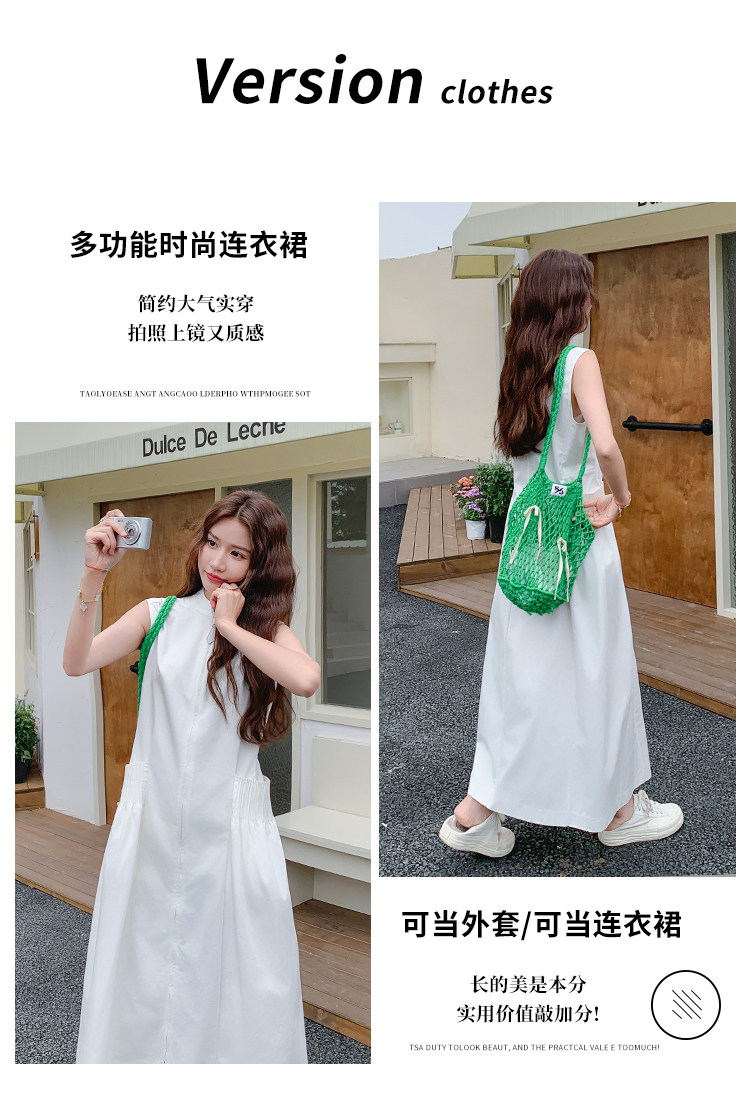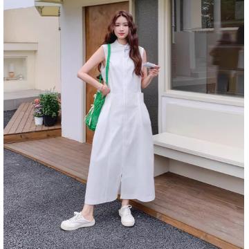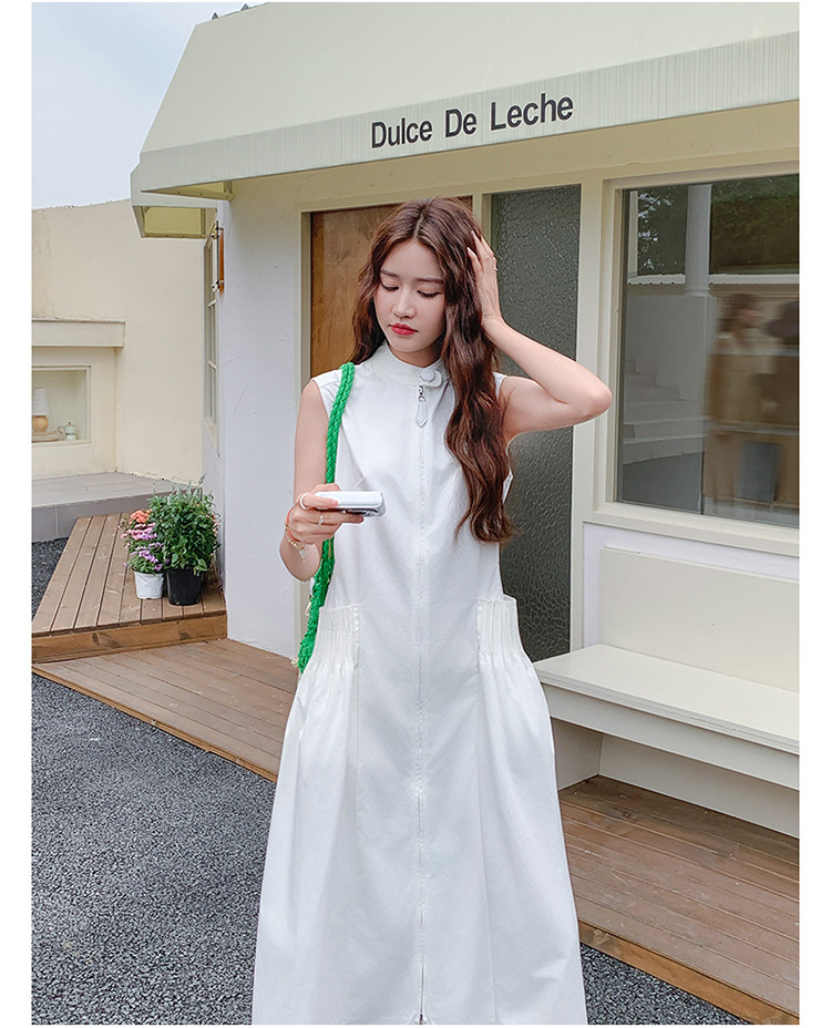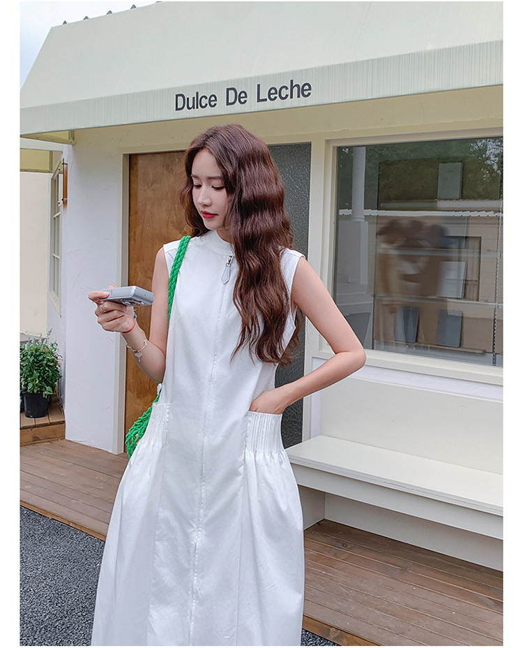 LN76433# 白色拉链立领无袖连衣裙新款女初夏又A又飒气质显瘦罩衫裙子