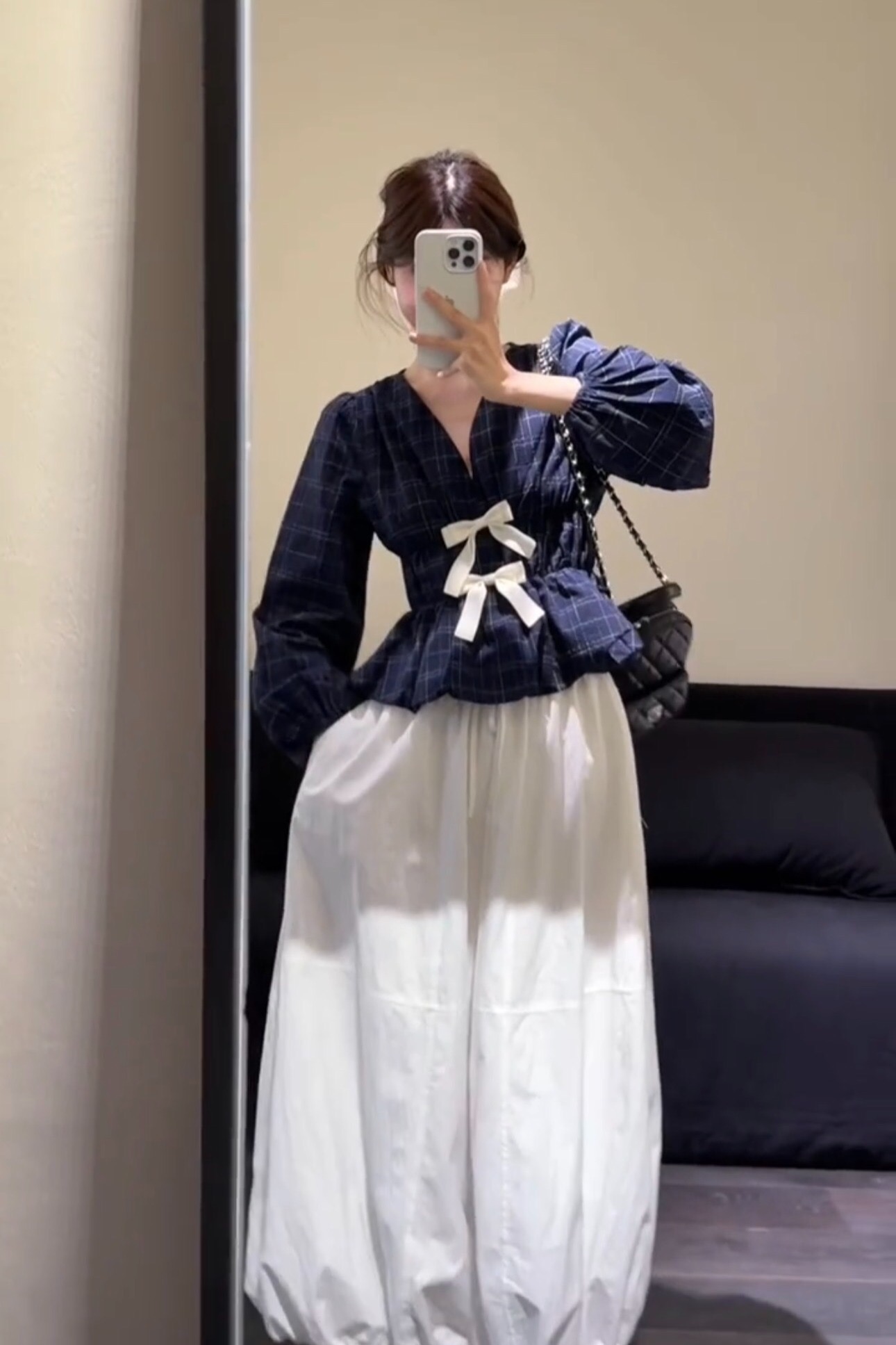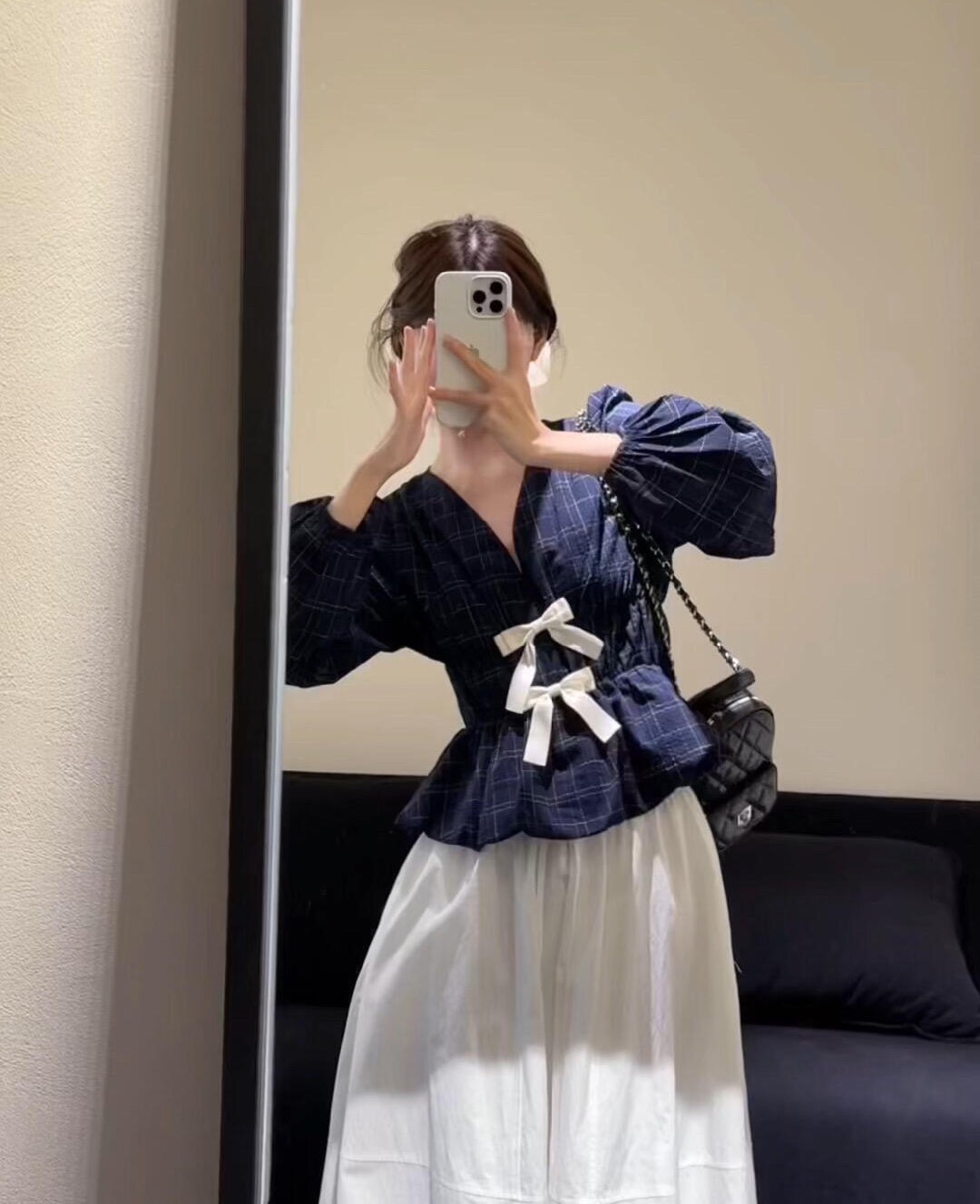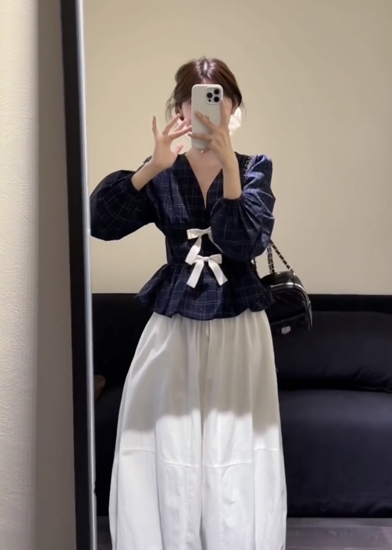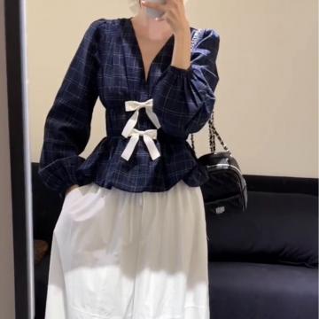 FA54805# 韩系早春格纹v领蝴蝶结衬衫 服裝批發女裝批發服飾貨源