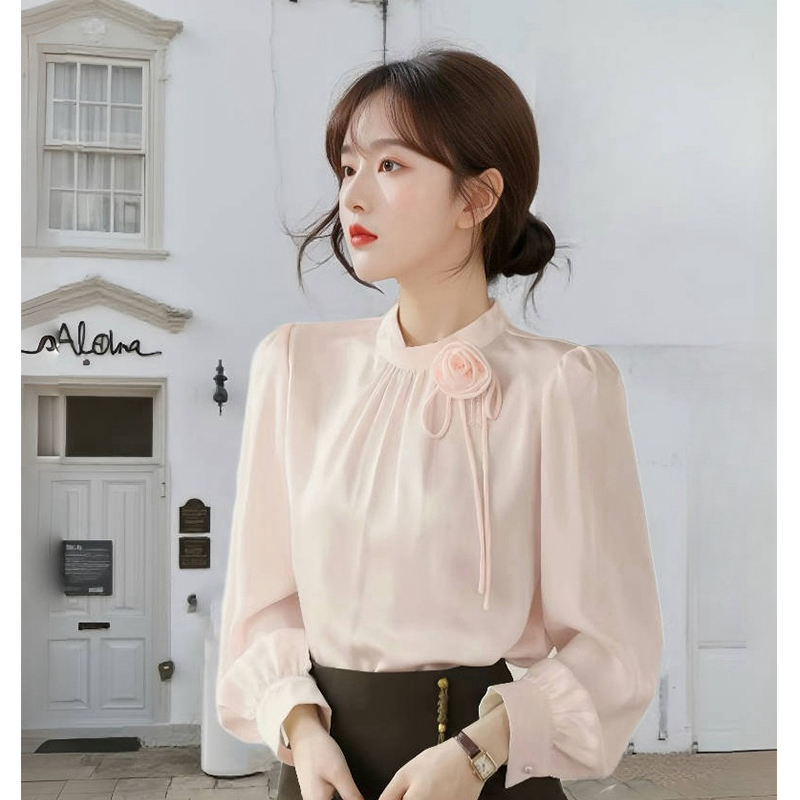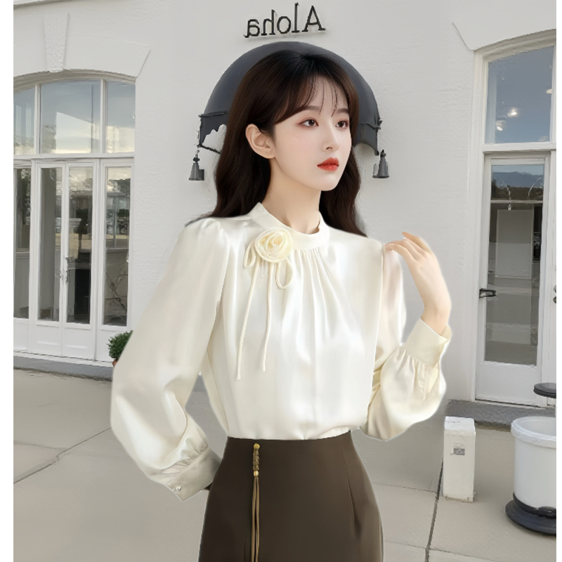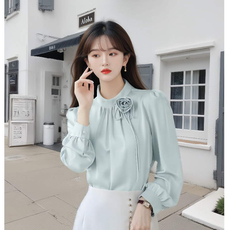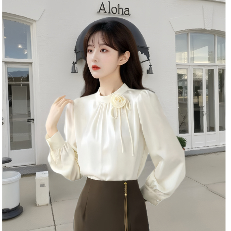 FA54841# 春季新款气质木耳花边钉珠立体花朵缎面雪纺衬衫女上衣 服裝批發女裝批發服飾貨源
