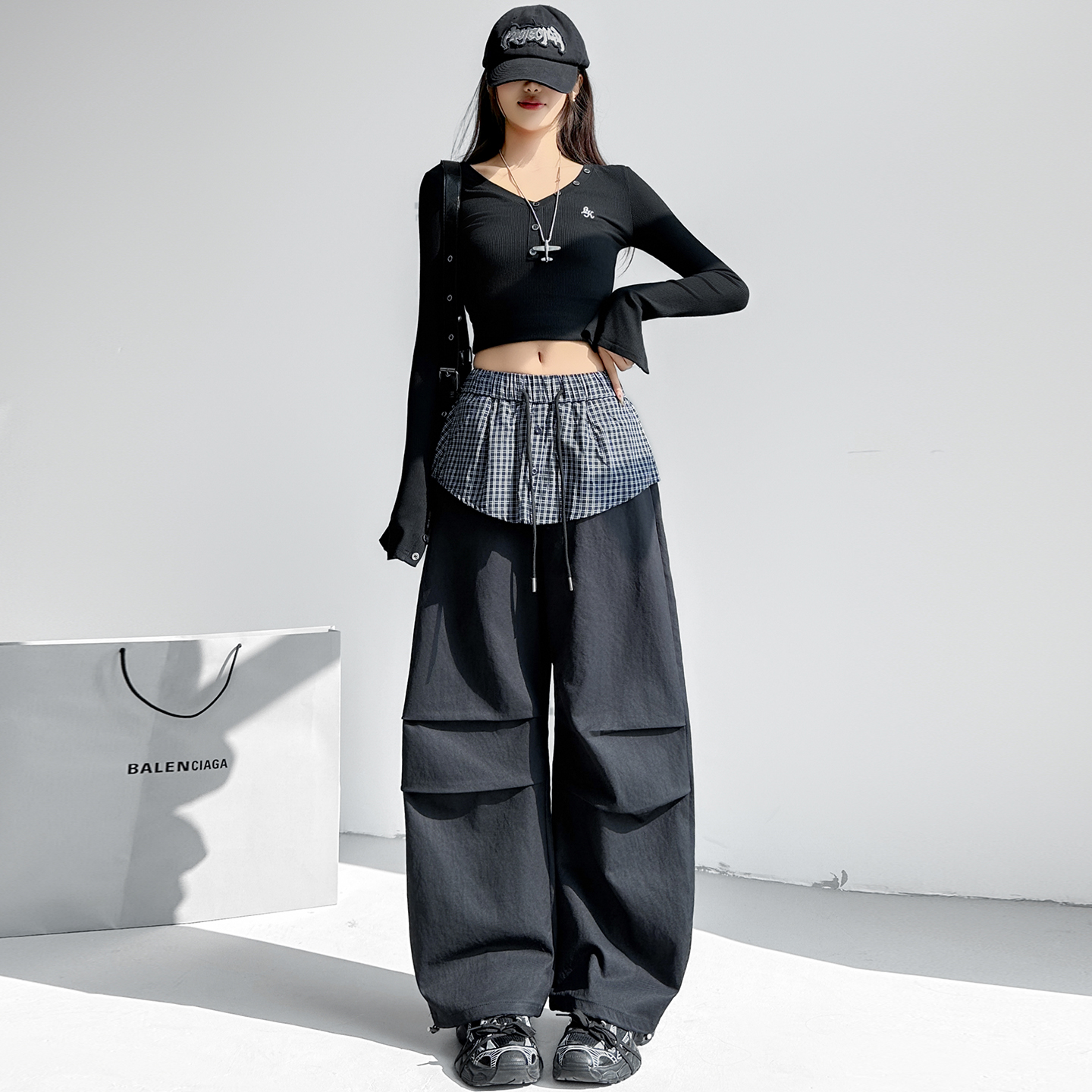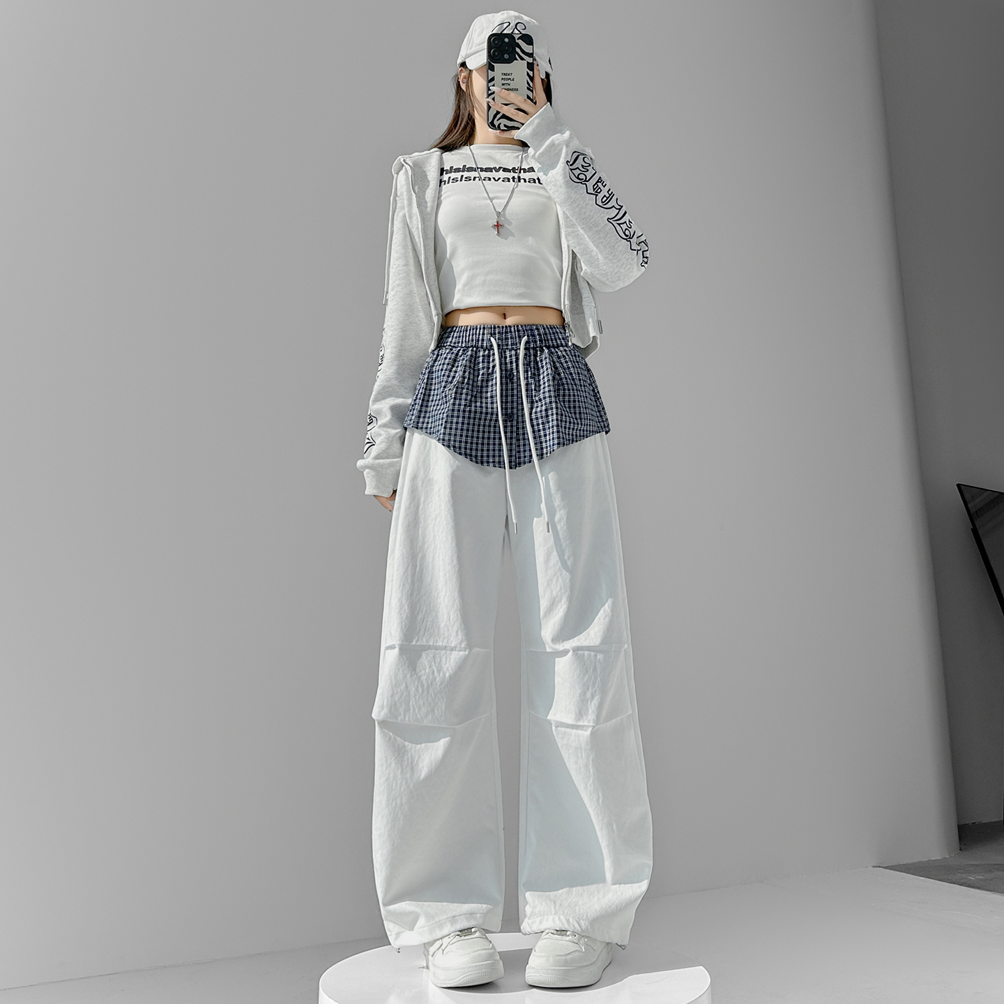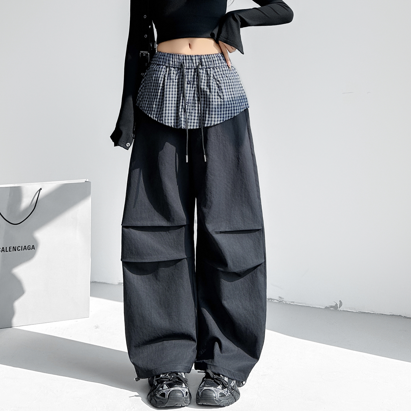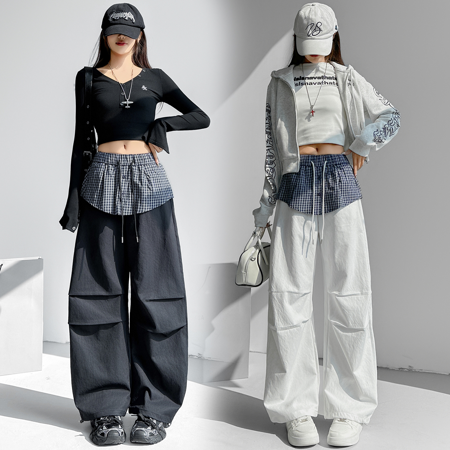 FA54993# 格子拼接屁帘休闲裤女春季新款中高腰宽松显瘦抽绳长裤 服裝批發女裝批發服飾貨源