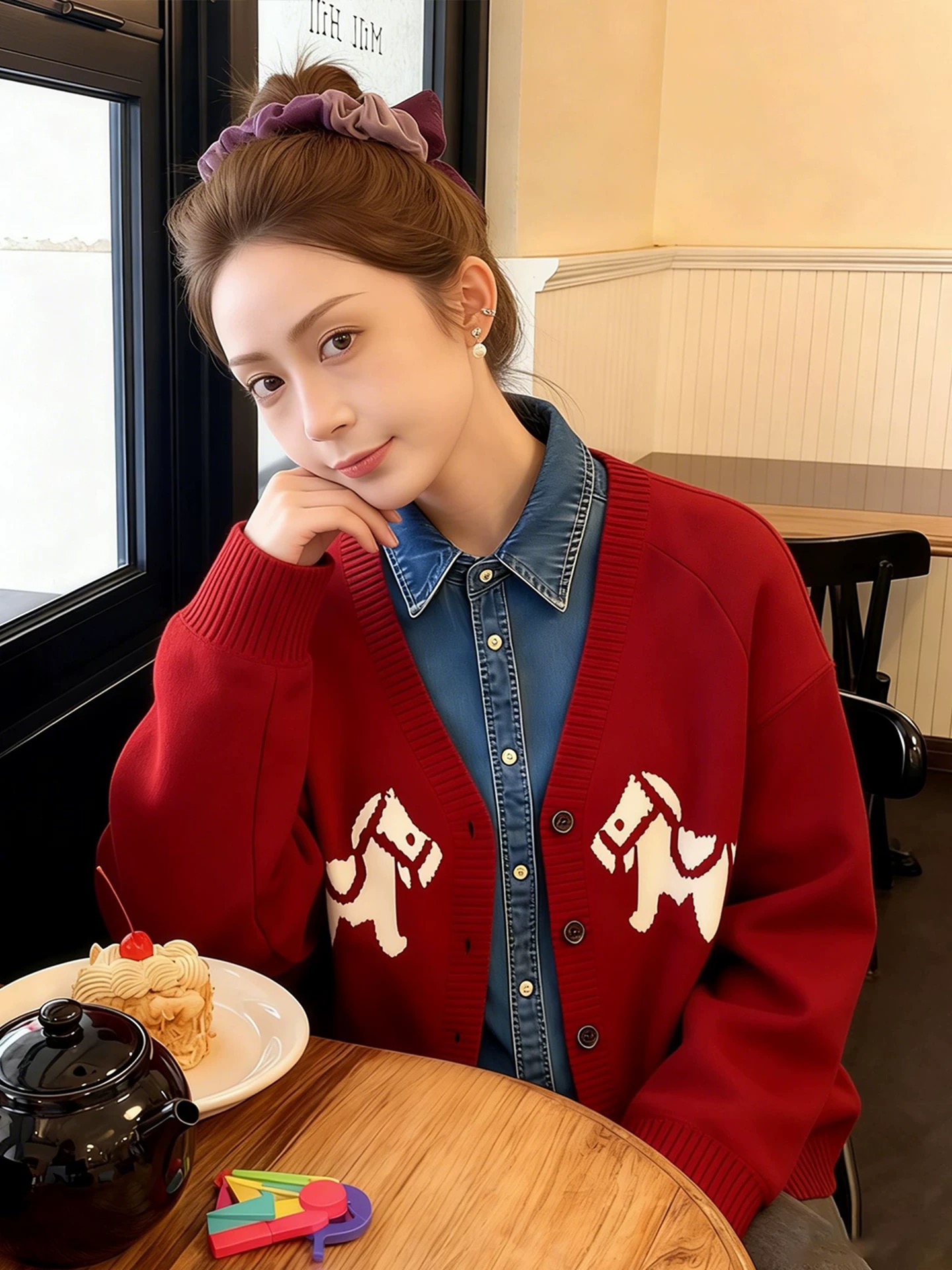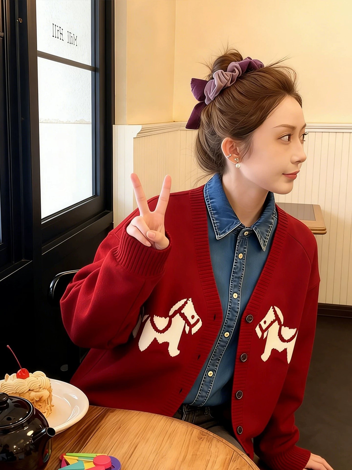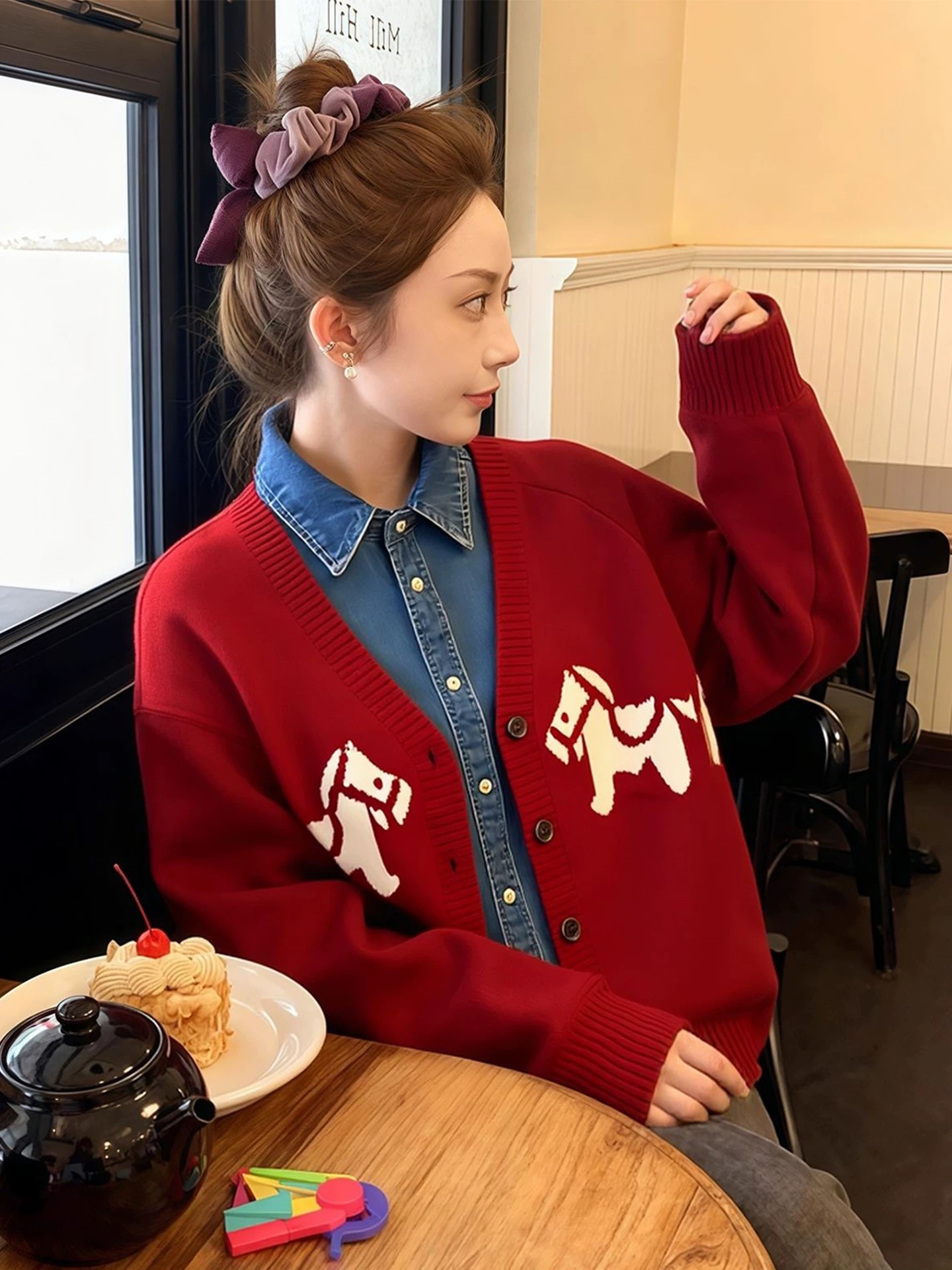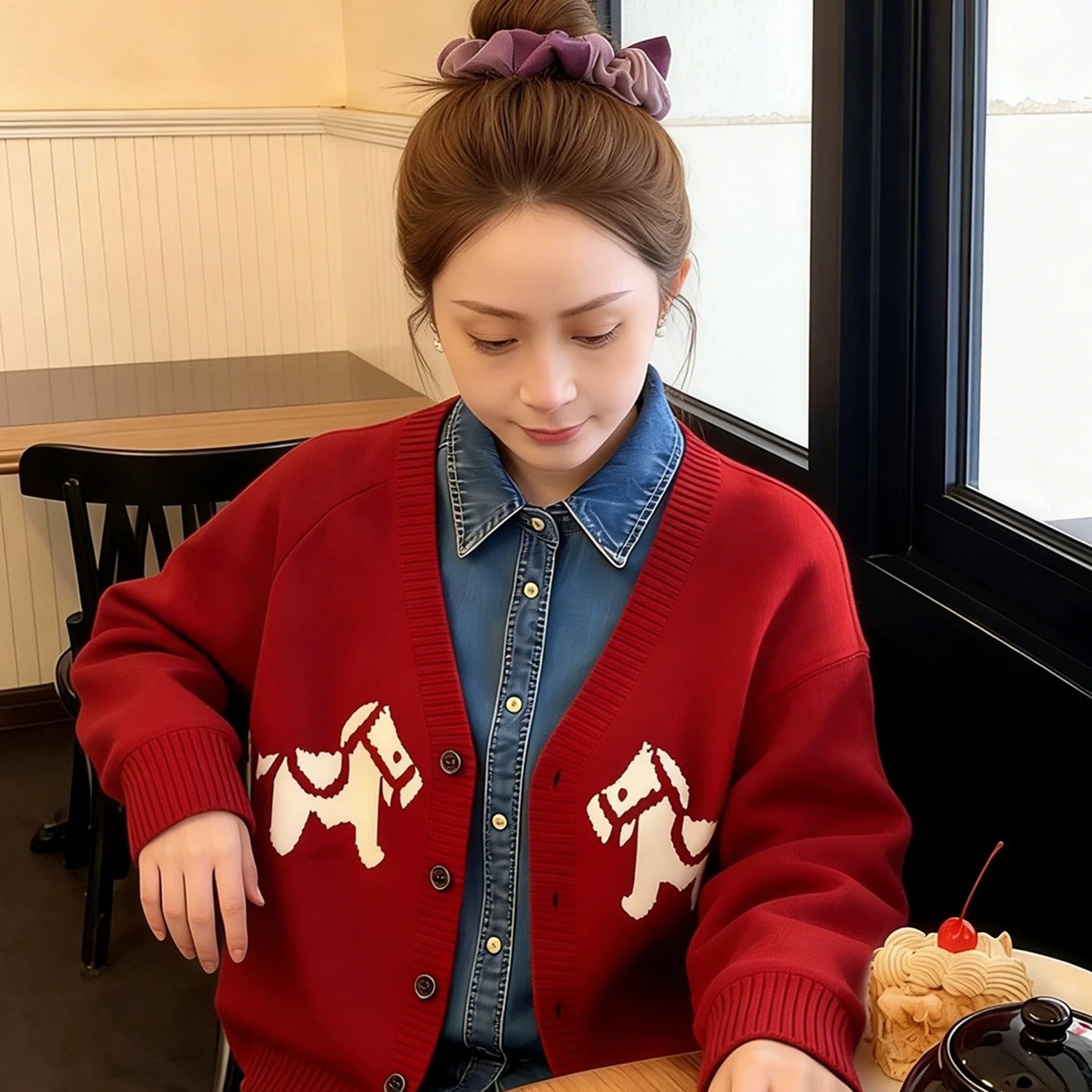 FA55261# 红色V领外搭双木马提花软糯针织开衫女秋冬季本命年马年上衣 服裝批發女裝批發服飾貨源