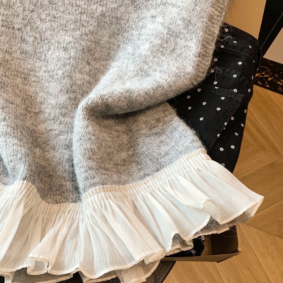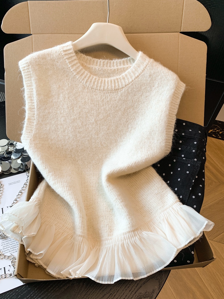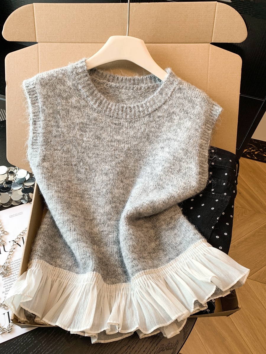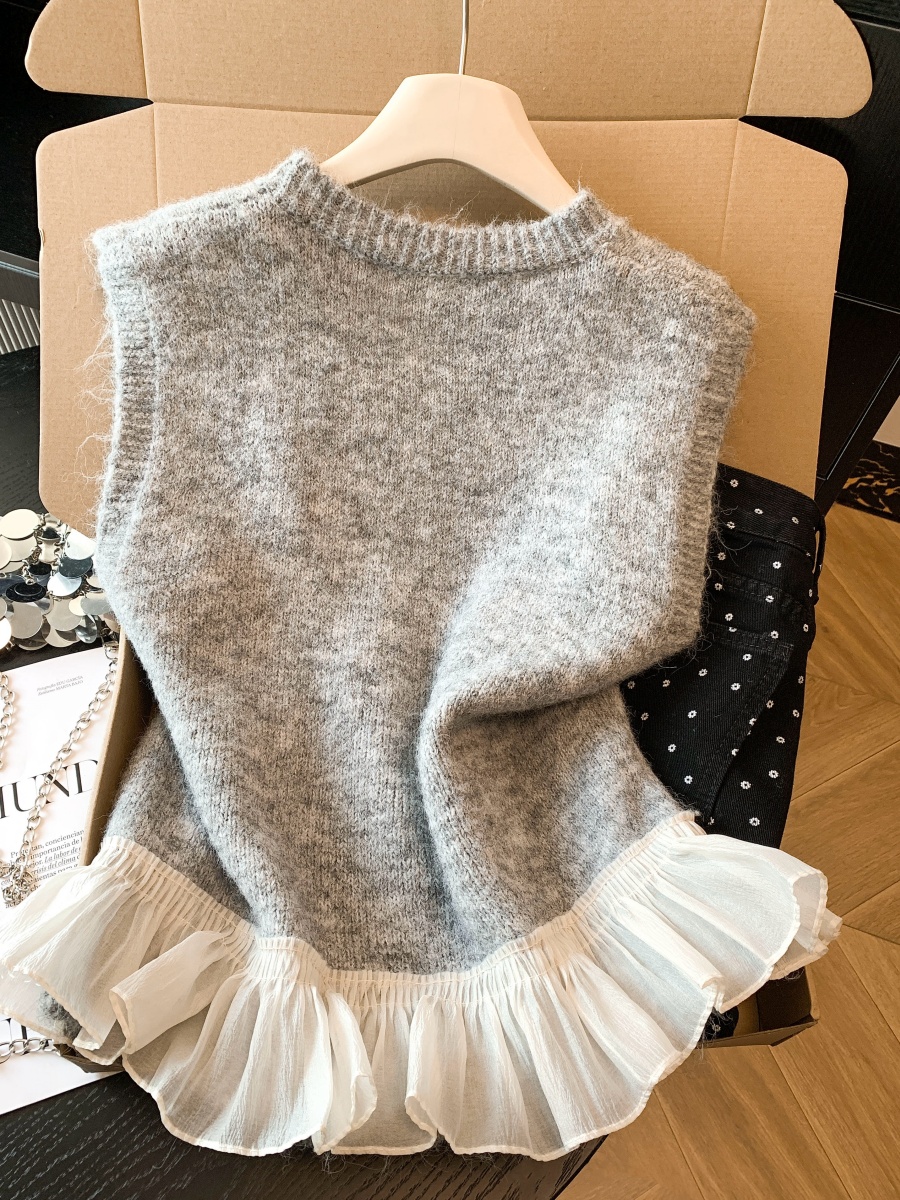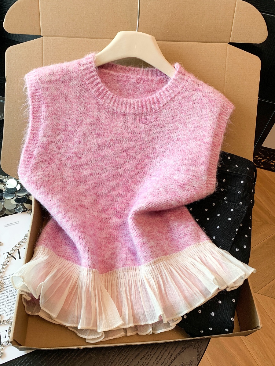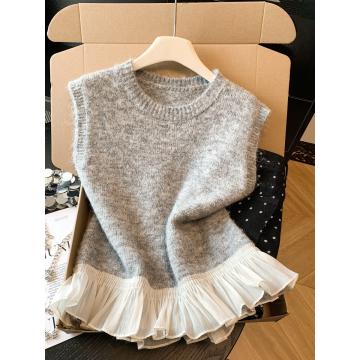 FA55264# 荷叶边拼接圆领针织马甲背心女早春小个子软糯毛衣叠穿无袖上衣 服裝批發女裝批發服飾貨源