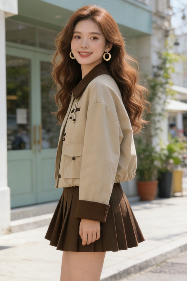 浅卡其上衣+咖啡色半身裙
